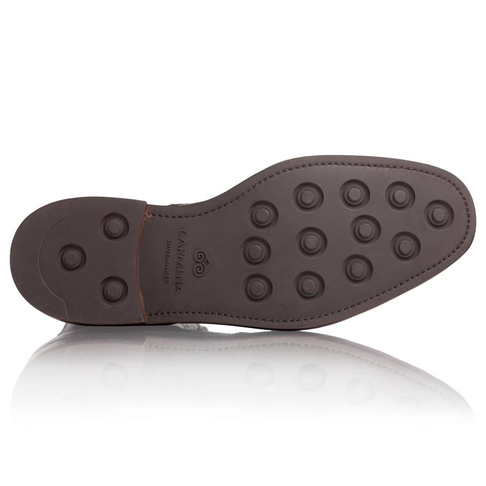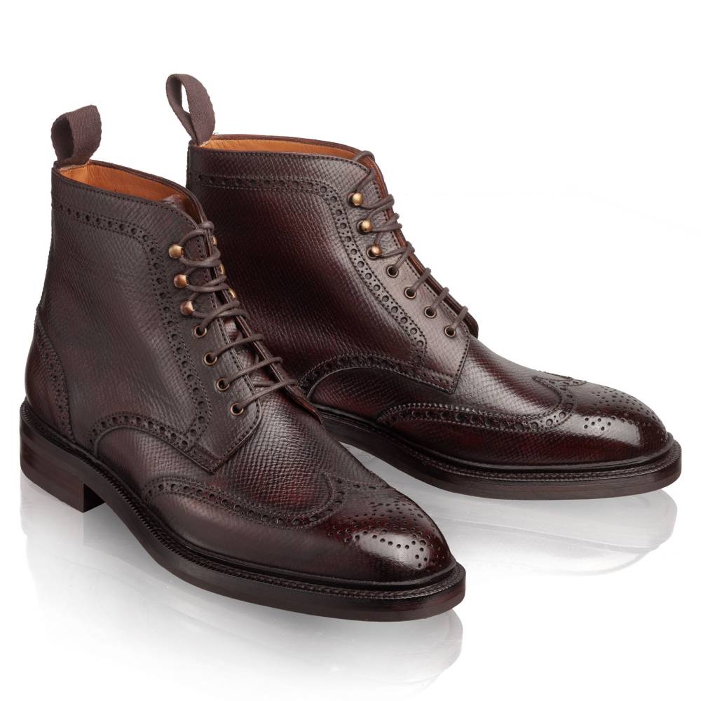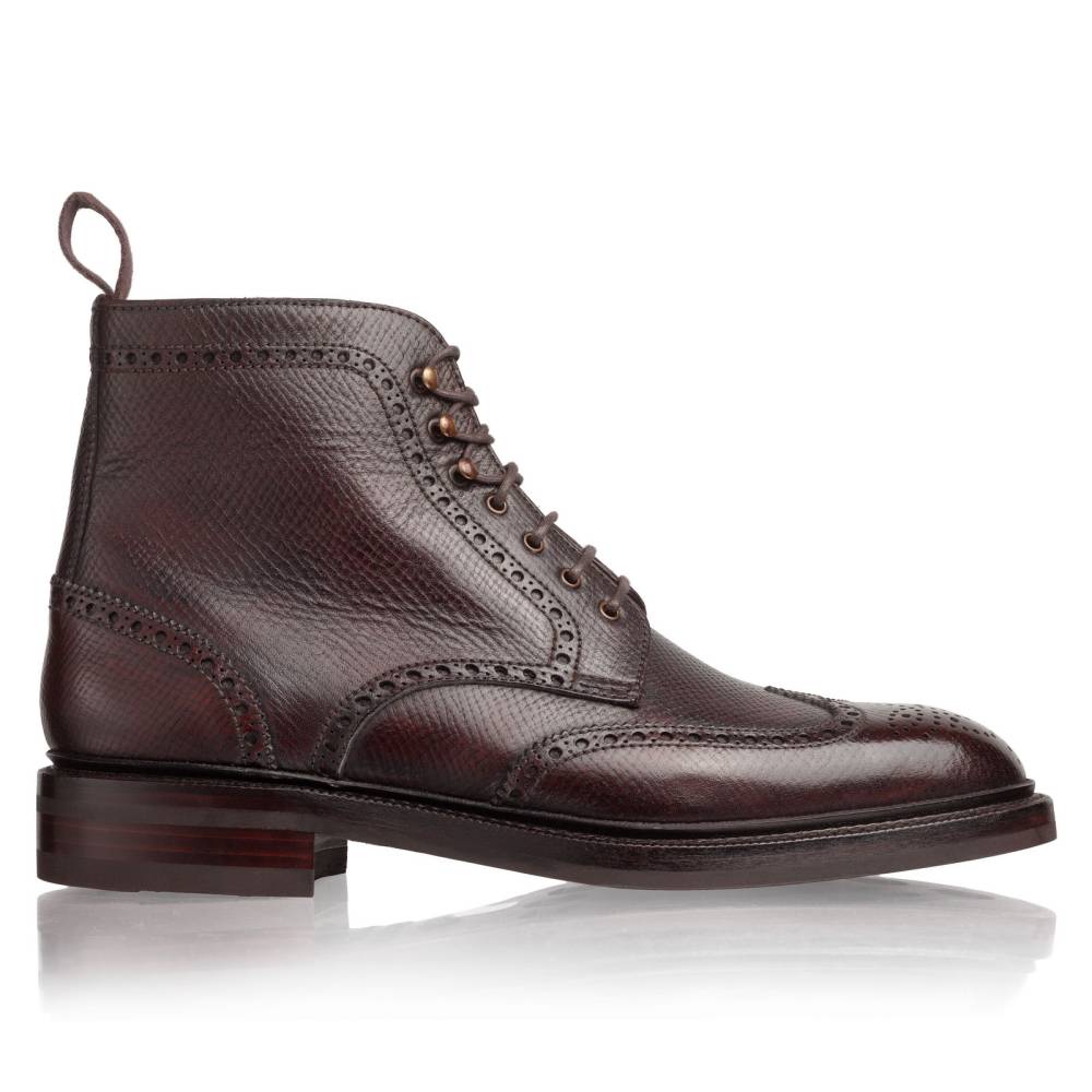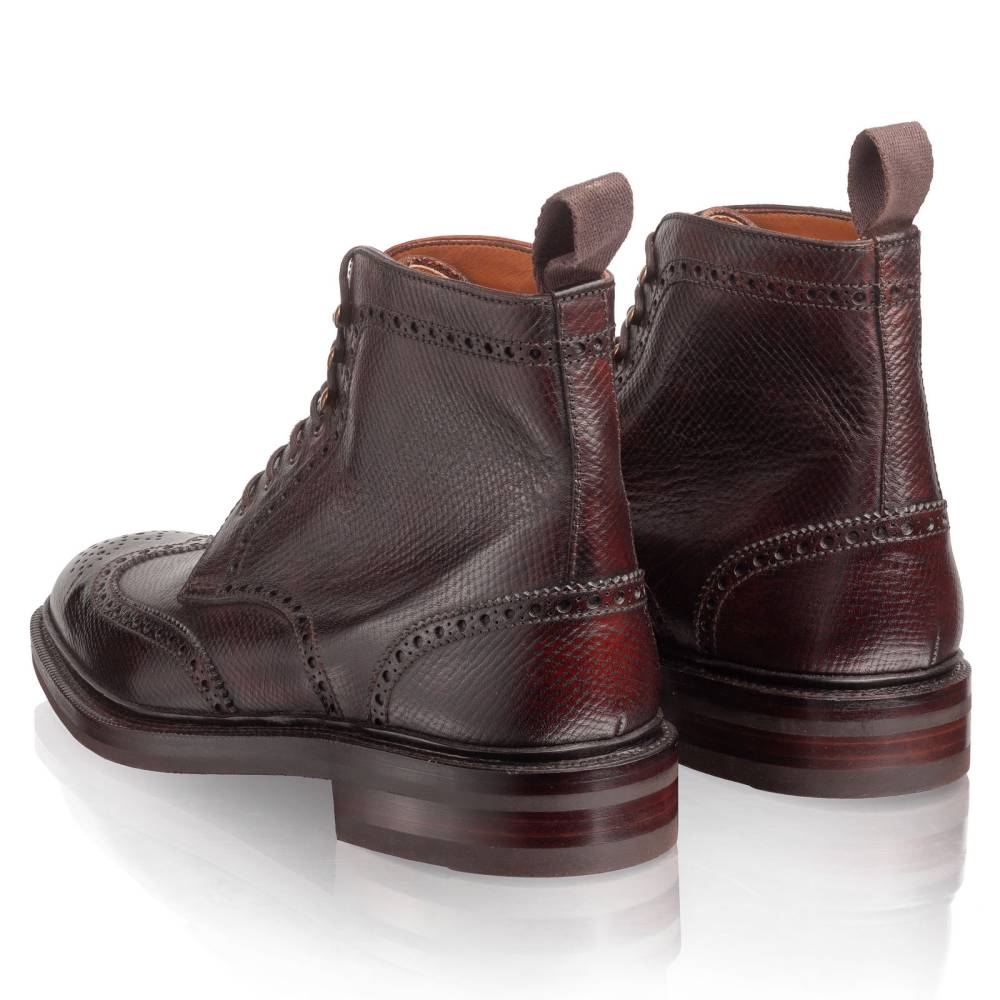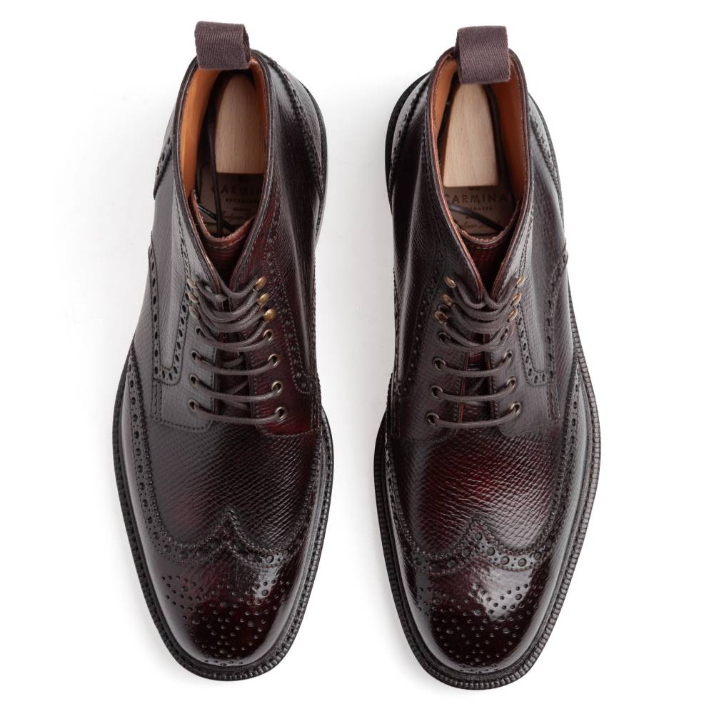 Высокие мужские ботинки Carmina тёмно-коричневого цвета. Верх выполнен из фактурной телячьей кожи с выраженными продольными полосами. Такая фактура имитирует вид знаменитой оленьей кожи (юфть, русская кожа), которую производили в Российской империи и очень ценили в Европе. Модель имеет широкий штормовой рант, который обеспечивает хорошую влагоустойчивость подошвы. Пяточная часть дополнена текстильной петлёй, что позволяет легко и быстро надевать ботинки. Подошва выполнена из прочной резины английской фирмы Dainite. Конструкция Goodyear Welted.