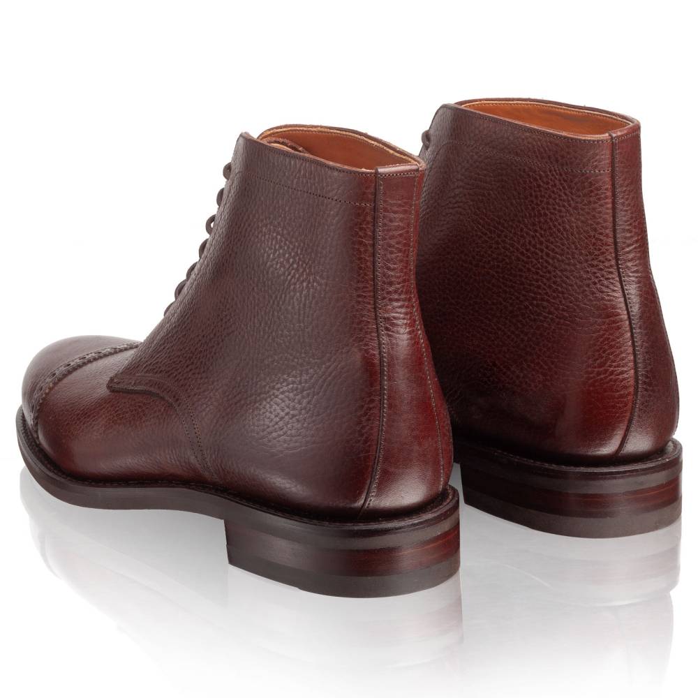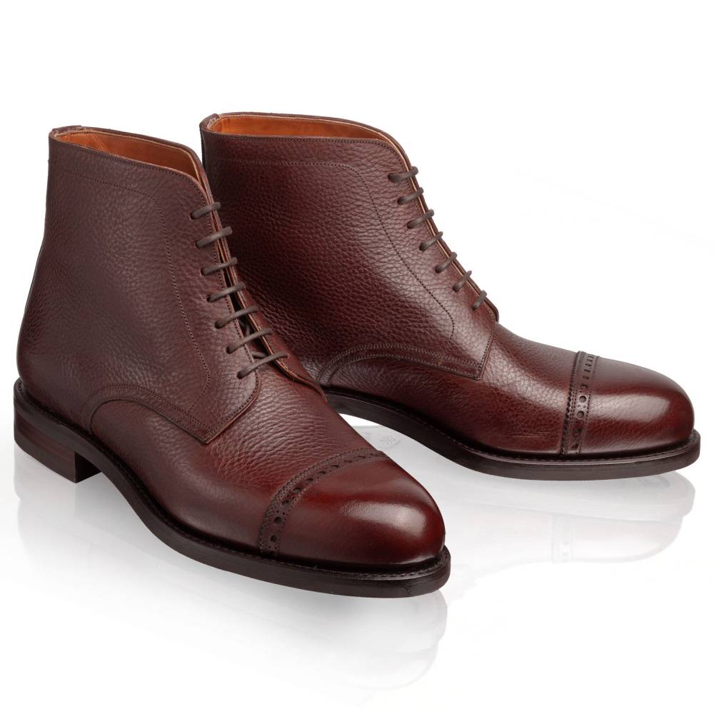 Высокие мужские ботинки Carmina тёмно-коричневого цвета выполнены из плотной телячьей кожи с зернистой фактурой. Внутренняя отделка из тонкой кожи растительного дубления. Модель украшена ненавязчивой перфорацией вдоль шва на мыске. Подошва из прочной резины английской фирмы Dainite. Конструкция Goodyear Welted.