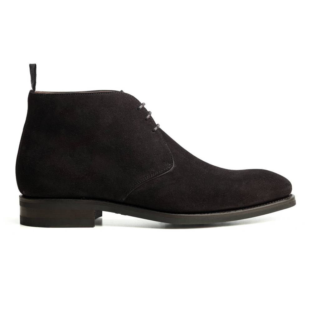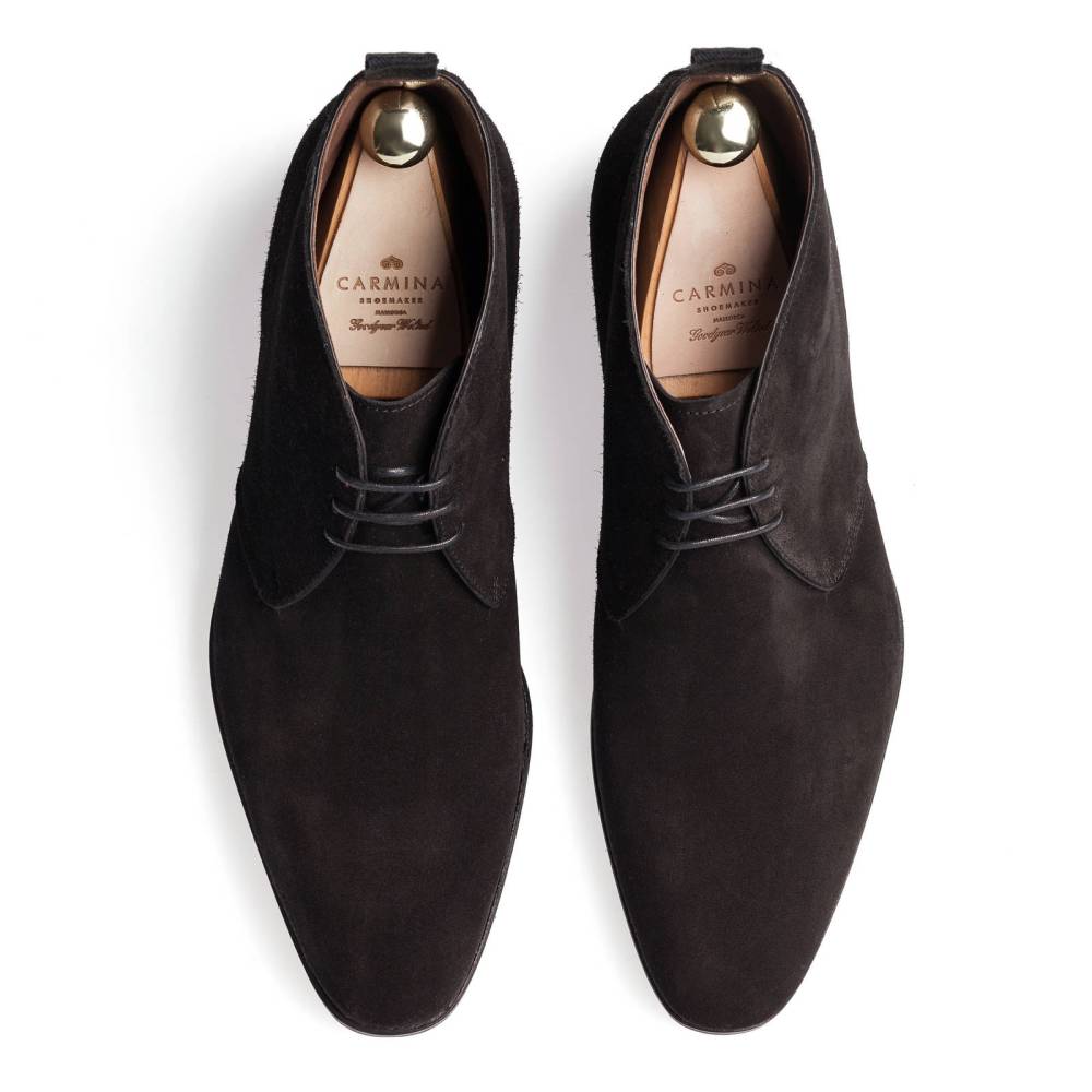 Традиционные мужские ботинки чукка от испанского бренда Carmina выполнены из высококачественной бархатистой замши чёрного цвета. Пяточная часть дополнена текстильной петлёй, благодаря которой модель быстро и легко надевается. На нижнюю часть подошвы установлена прочная резина английской фирмы Dainite. Конструкция Goodyear Welted.