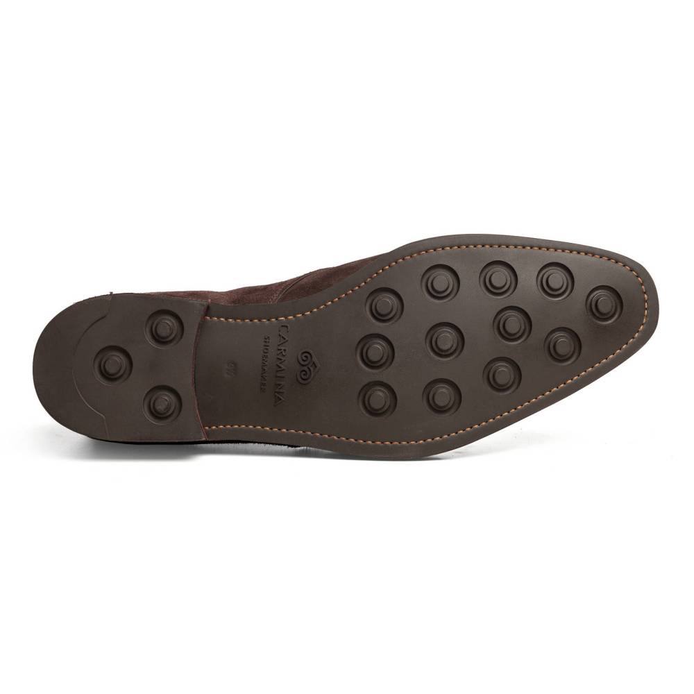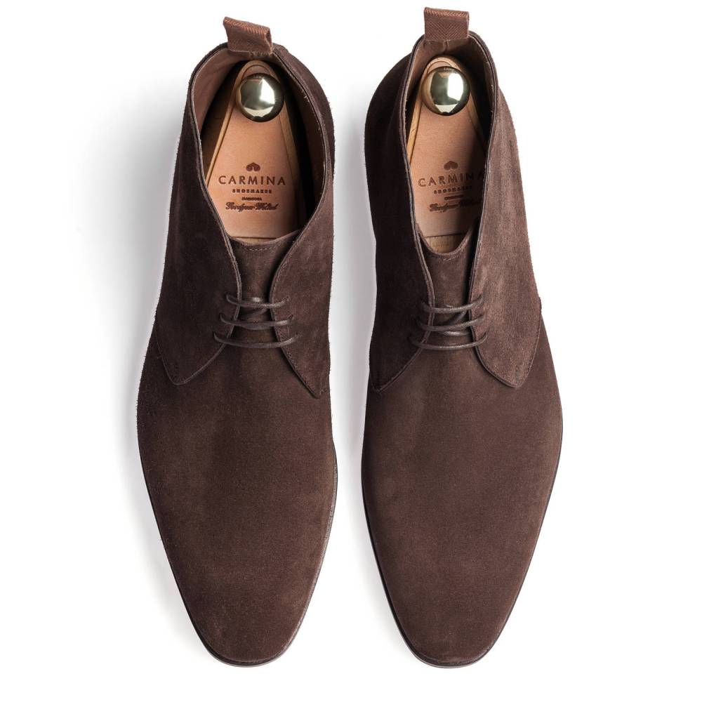 Традиционные мужские ботинки чукка от испанского бренда Carmina выполнены из высококачественной бархатистой замши тёмно-коричневого цвета. Пяточная часть дополнена текстильной петлёй, благодаря которой модель быстро и легко надевается. На нижнюю часть подошвы установлена прочная резина английской фирмы Dainite. Конструкция Goodyear Welted.