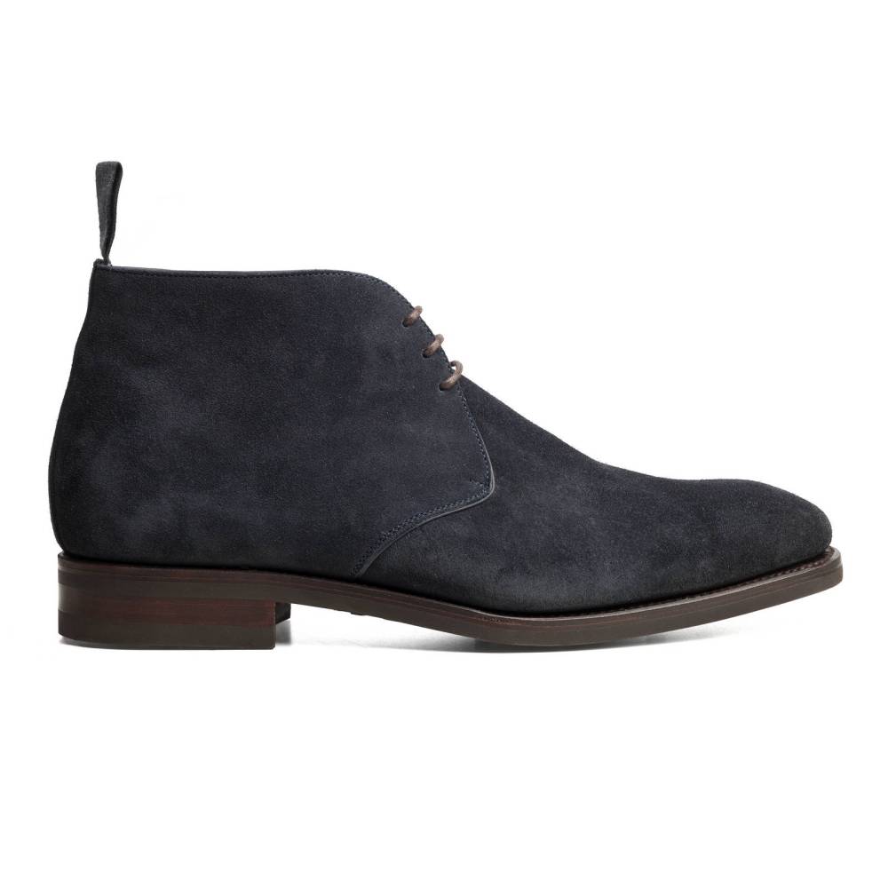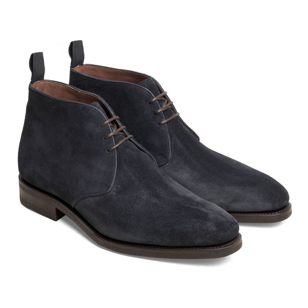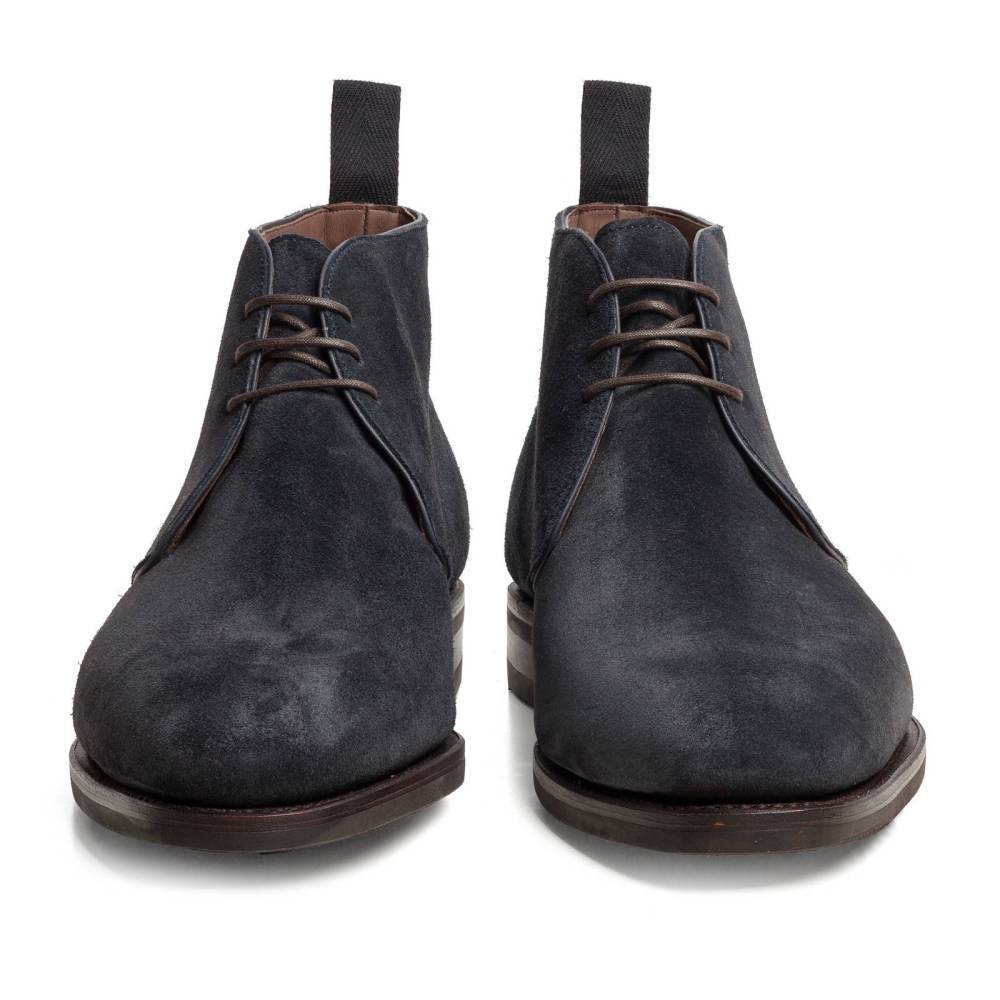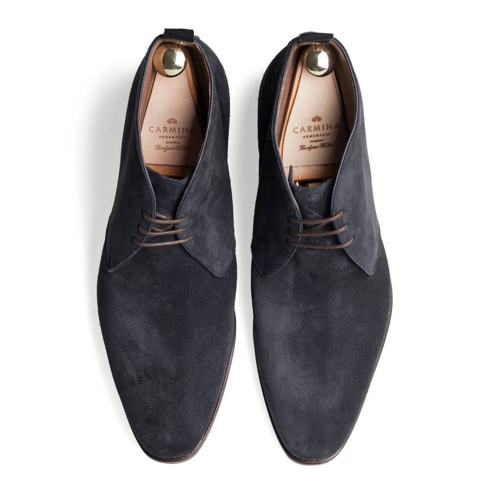 Традиционные мужские ботинки чукка от испанского бренда Carmina выполнены из высококачественной бархатистой замши тёмно-синего цвета. Пяточная часть дополнена текстильной петлёй, благодаря которой модель быстро и легко надевается. На нижнюю часть подошвы установлена прочная резина английской фирмы Dainite. Конструкция Goodyear Welted.