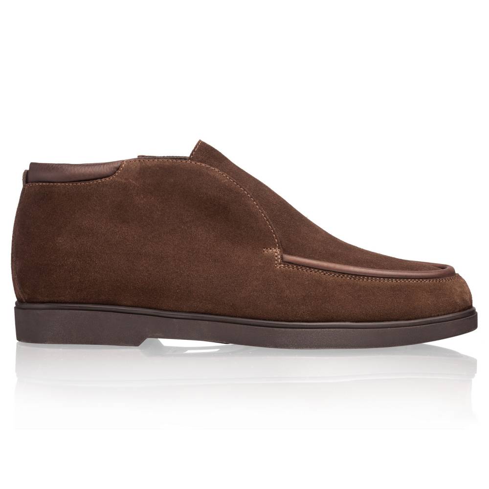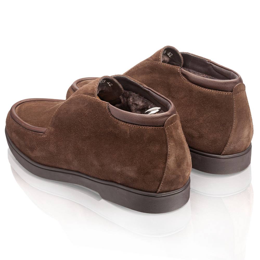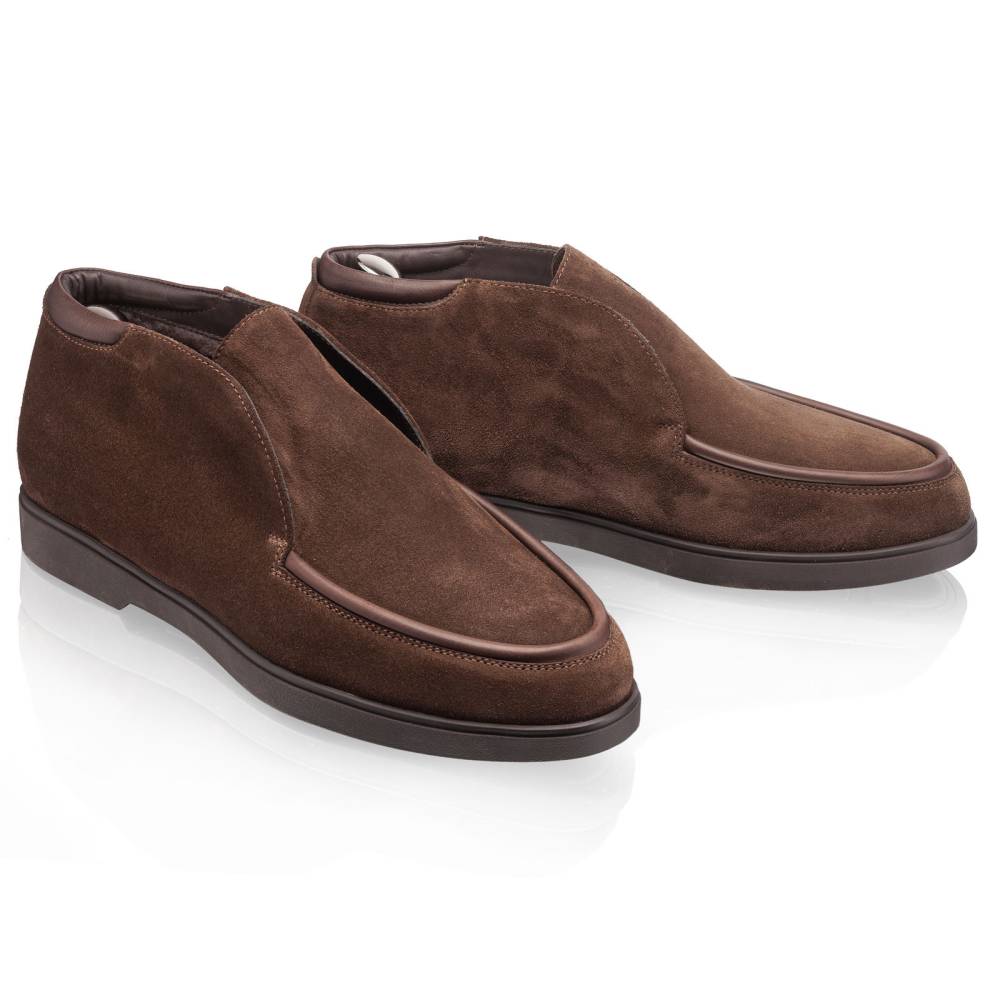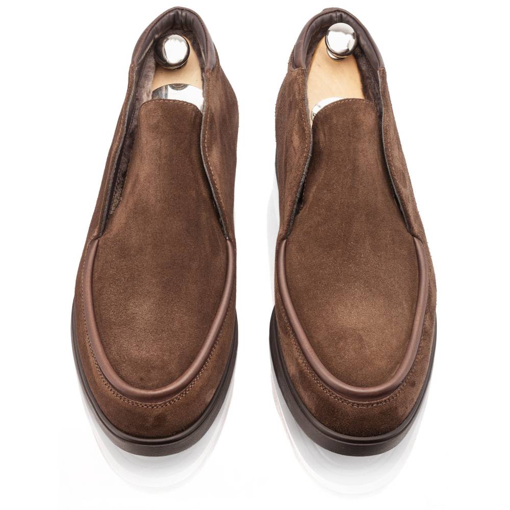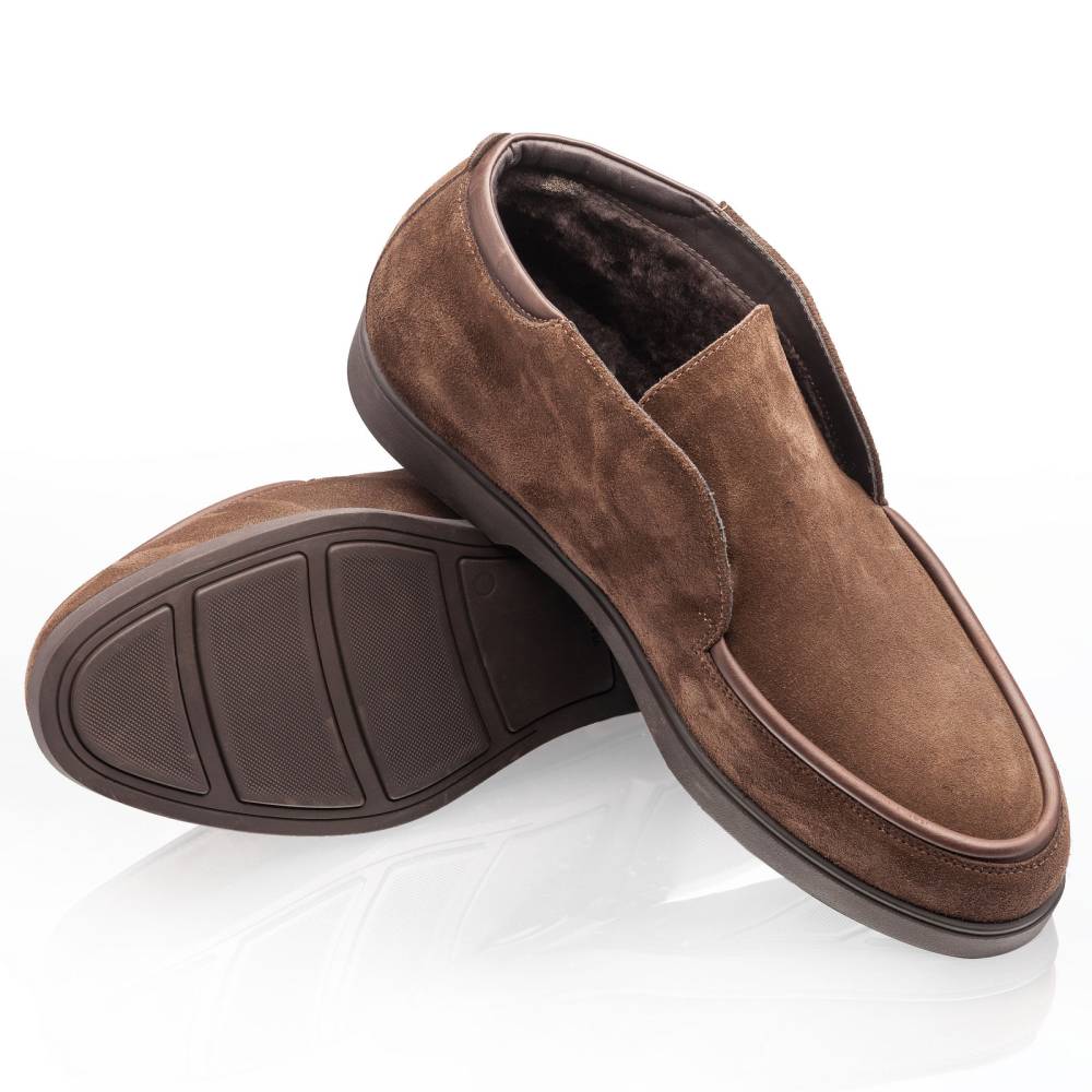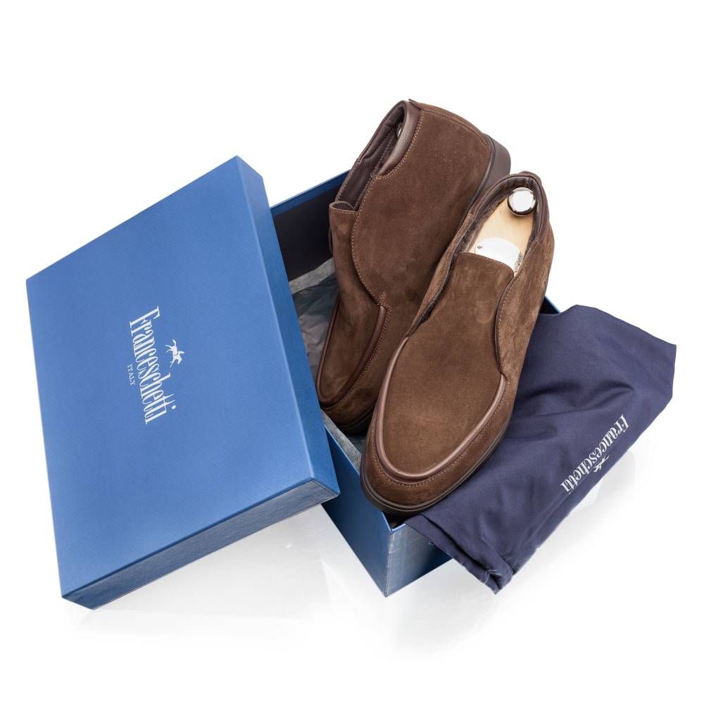 Тёплые лёгкие мужские невысокие ботинки итальянского бренда Franceschetti. Сшиты из высококачественной замши коричневого цвета, а мокасинный шов на союзке отделан гладкой телячьей кожей в тон верху. Подкладка, за исключением стельки, выполнена из натурального меха. Особенностью ботинок является отсутствие шнурков и наличие эластичных вставок по бокам язычка. Благодаря этому пара быстро и легко надевается. Гибкая и прочная резиновая подошва. Модель сшита на колодке средней полноты (F) и рассчитана на стопу средней ширины со средним или умеренно высоким подъёмом.