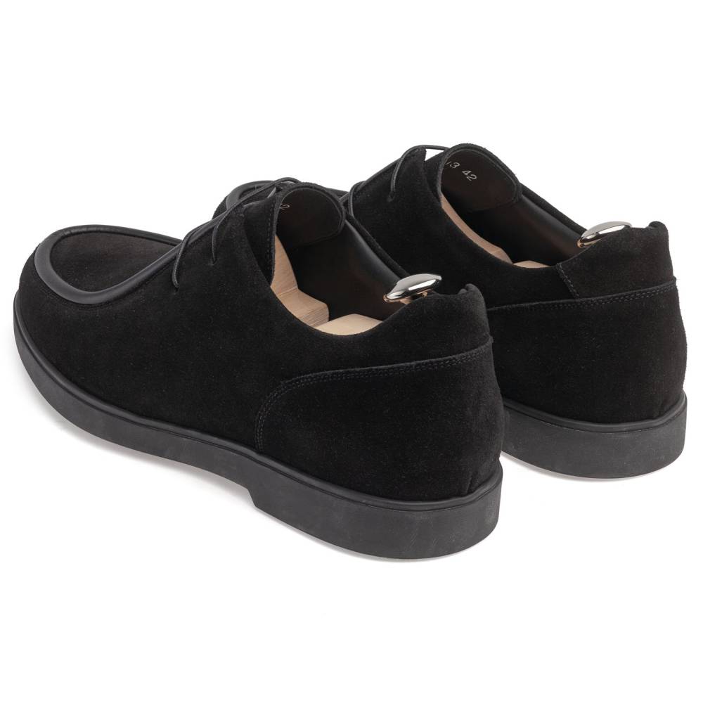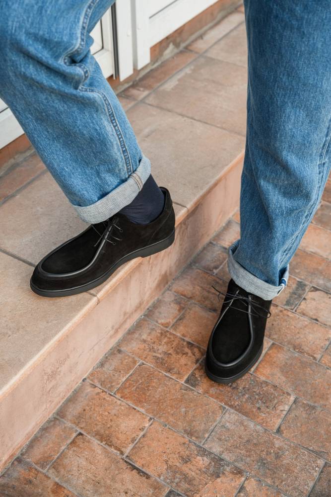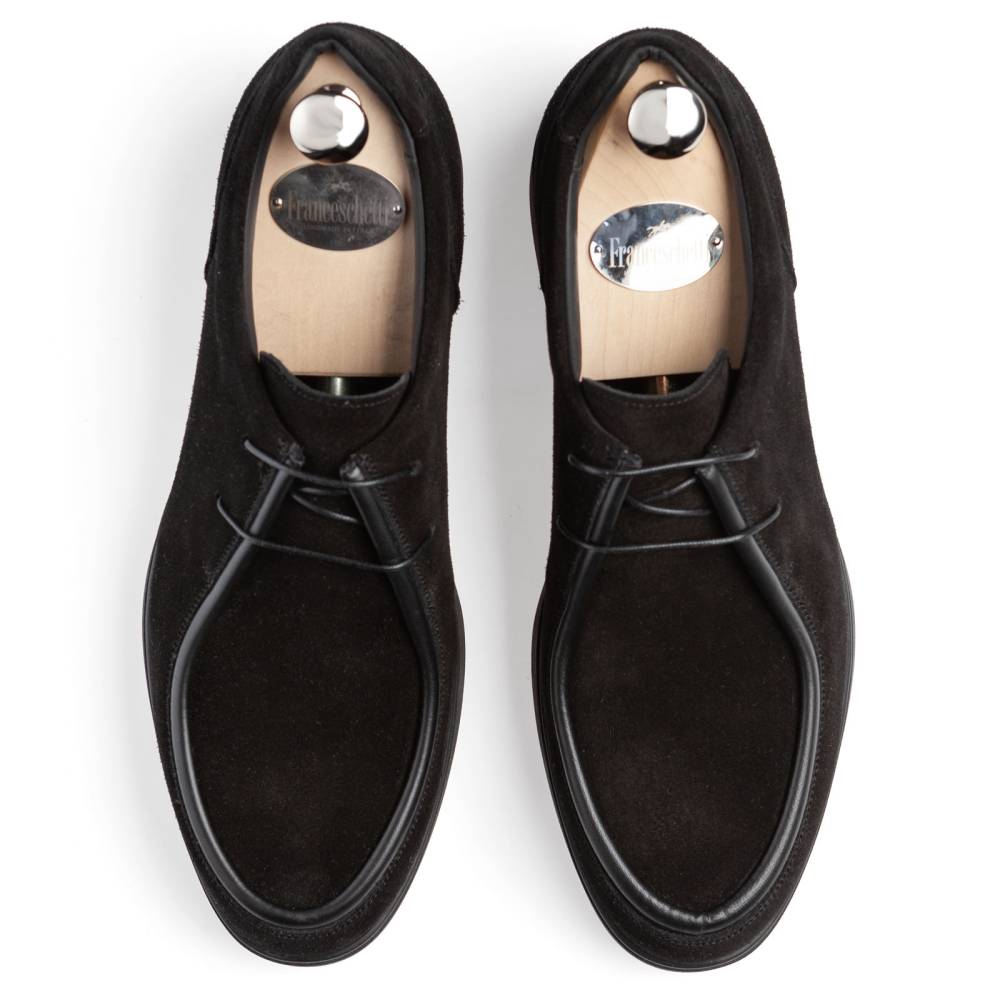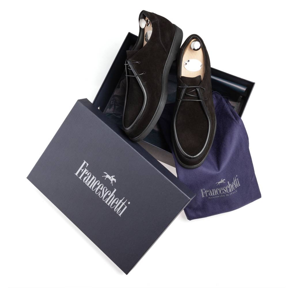 Стильные и лёгкие мужские дерби итальянского бренда Franceschetti сшиты из высококачественной замши чёрного цвета, а мокасинный шов на союзке отделан гладкой телячьей кожей в тон верху. Подкладка и стелька выполнена из тонкой чёрной телячьей кожи, а область пятки — из чёрной же замши (обеспечивая более комфортную посадку ботинок). Гибкая и прочная резиновая подошва. Ботинки сшиты на колодке средней полноты (F) и рассчитаны на стопу средней ширины со средним или умеренно высоким подъёмом.