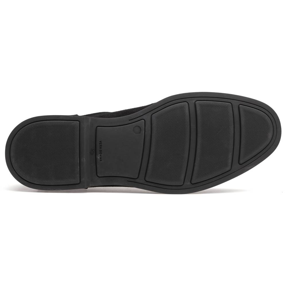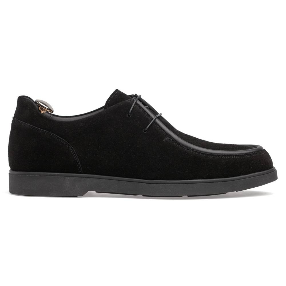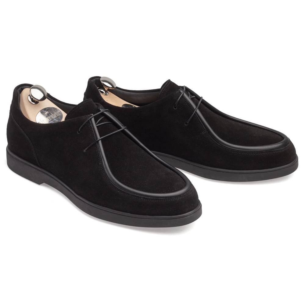 Стильные и лёгкие мужские дерби итальянского бренда Franceschetti сшиты из высококачественной замши чёрного цвета, а мокасинный шов на союзке отделан гладкой телячьей кожей в тон верху. Подкладка и стелька выполнена из тонкой чёрной телячьей кожи, а область пятки — из чёрной же замши (обеспечивая более комфортную посадку ботинок). Гибкая и прочная резиновая подошва. Ботинки сшиты на колодке средней полноты (F) и рассчитаны на стопу средней ширины со средним или умеренно высоким подъёмом.