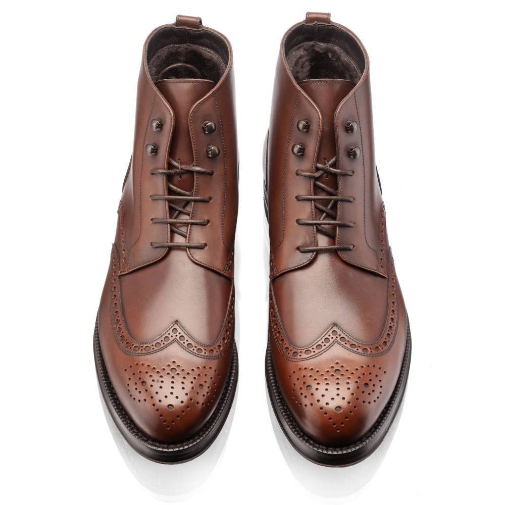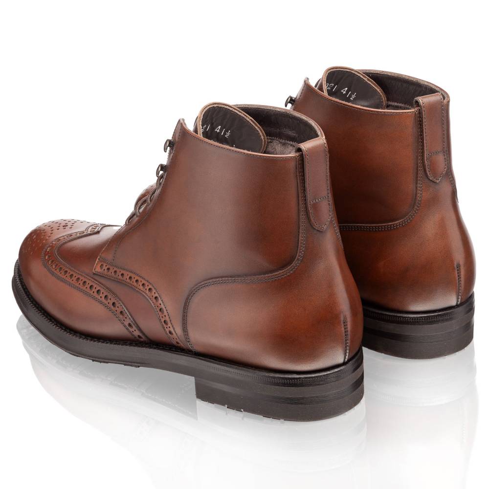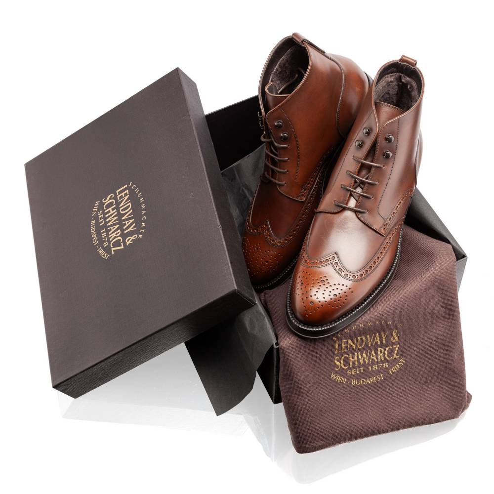 Тёплые высокие мужские ботинки Lendvay & Schwarcz коричневого цвета на двойной подошве с противоскользящей резиной Berlino. Верх выполнен из высококачественной гладкой телячьей кожи итальянского производства, украшенной перфорацией. Внутри модель отделана густым натуральным мехом: по бокам, на язычке и в передней части стельки. Конструкция Blake Rapid с пробковым слоем.