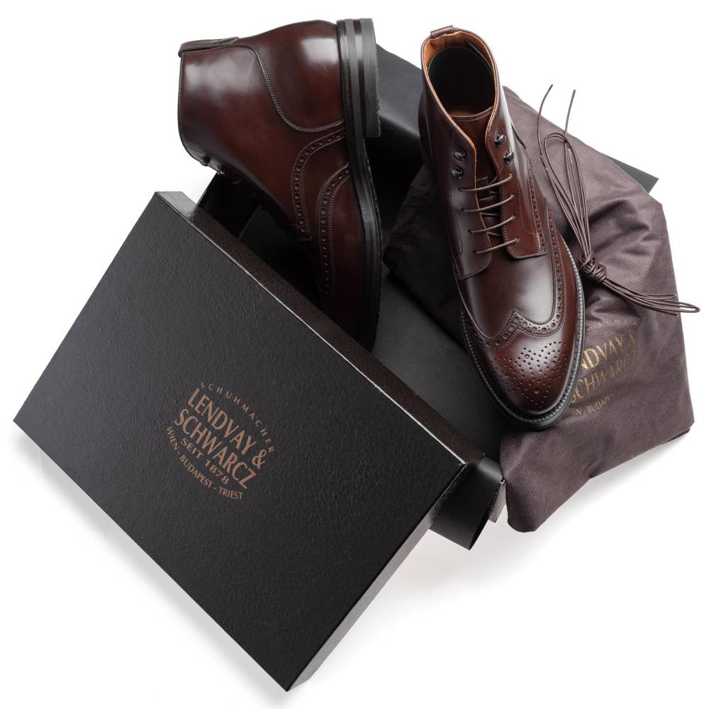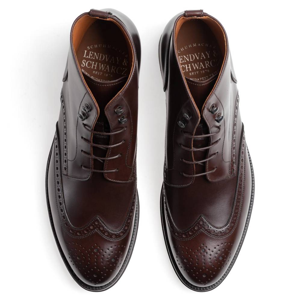 Мужские ботинки Lendvay & Schwarcz тёмно-коричневого цвета на двойной подошве с противоскользящей резиной Berlino. Верх выполнен из высококачественной телячьей кожи итальянского производства, украшенной перфорацией. Материал обладает изысканным блеском, благодаря которому он выглядит подобно лошадиной коже (cordovan). Внутренняя отделка полностью из натуральной кожи. Конструкция Blake Rapid с пробковым слоем.