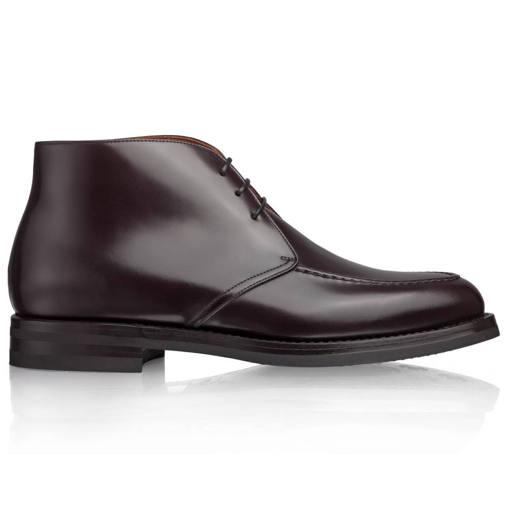 Лаконичные тёмно-бордовые ботинки чукка Lendvay & Schwarcz с прошитым мокасинным мыском (moc toe). Верх из высококачественной телячьей кожи итальянского производства. Кожа обладает изысканным блеском, благодаря которому выглядит подобно лошадиной коже (cordovan). Внутренняя подкладка из натуральной кожи. Двойная подошва с облегченной резиной Vibram. Конструкция Blake Rapid с пробковым слоем.