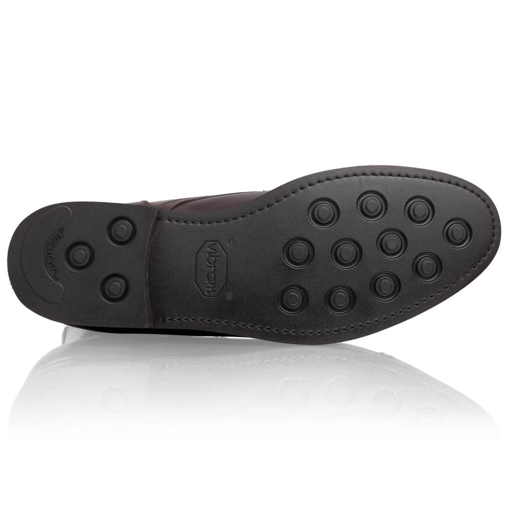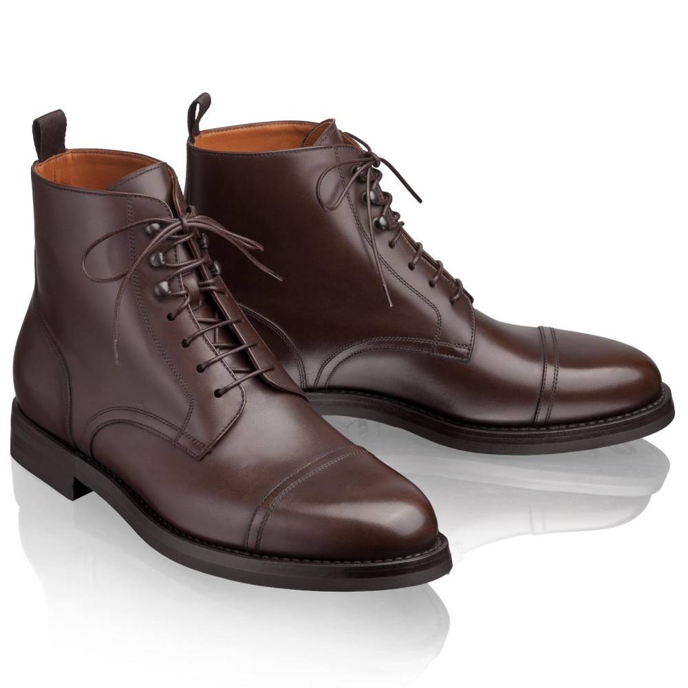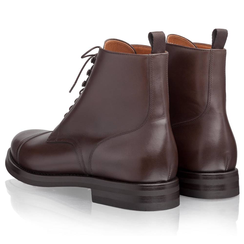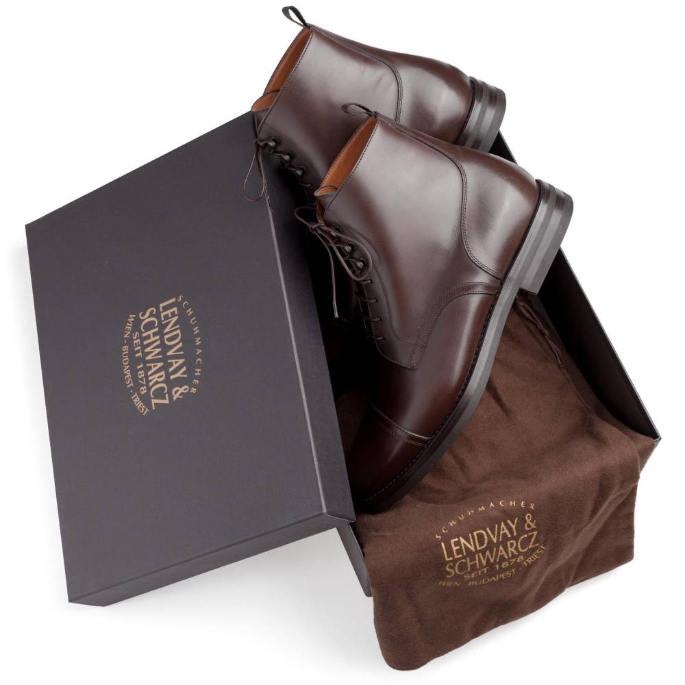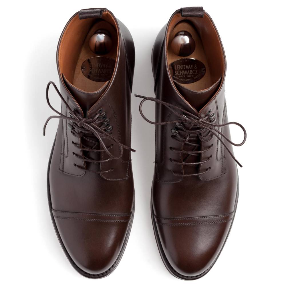 Лаконичные ботинки Lendvay & Schwarcz тёмно-коричневого цвета с отрезным округлым мыском. Двойная подошва с облегченной резиной Vibram. Верх из высококачественной телячьей кожи итальянского производства. Детали верха сшиты тонкой и аккуратной строчкой, что указывает на внимание к деталям и щепетильность работников фабрики. Внутренняя подкладка из натуральной кожи. Конструкция Blake Rapid с пробковым слоем.