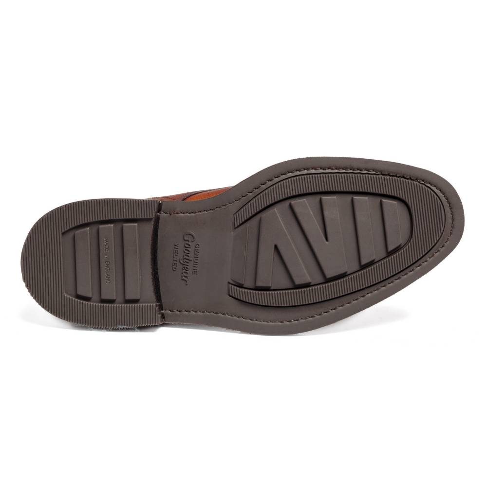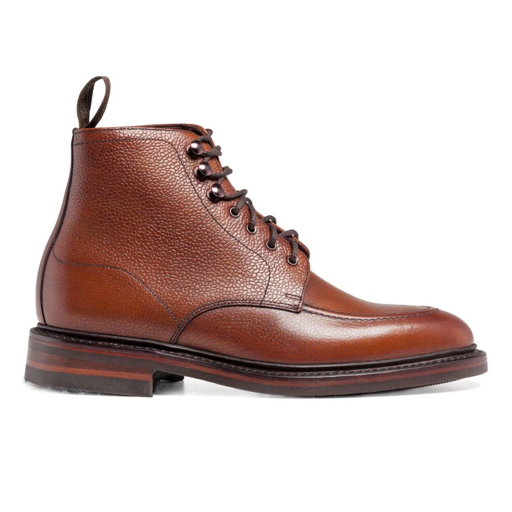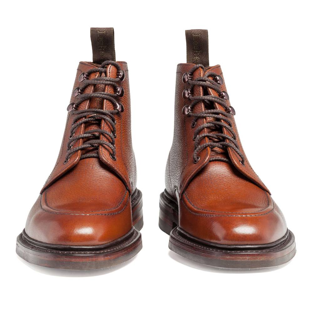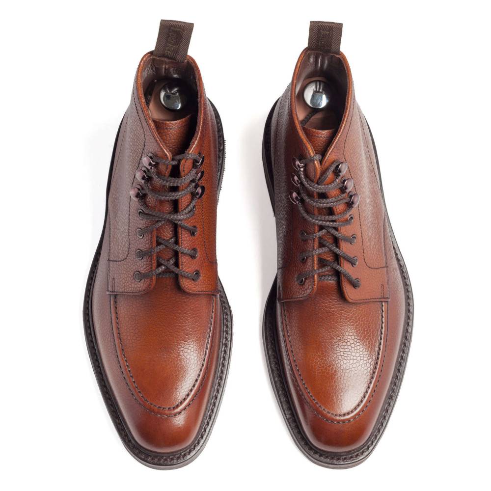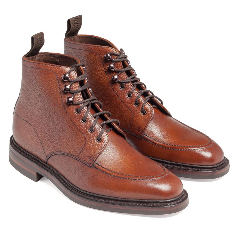 Классические ботинки дерби Loake 1880 из юбилейной коллекции бренда. Верхняя часть выполнена из плотной телячьей кожи с зернистой текстурой. Цвет по маркировке «oxblood» представляет собой традиционный коричневый оттенок с лёгким красноватым отливом. Модель имеет широкий штормовой рант, который обеспечивает влагоустойчивость подошвы. В верхней части шнурки завязываются крест-накрест при помощи металлических крючков. Подкладка из тёмно-коричневой кожи. Подошва выполнена из кожи и прочной резины Victory с глубоким протектором. Конструкция Goodyear Welted.