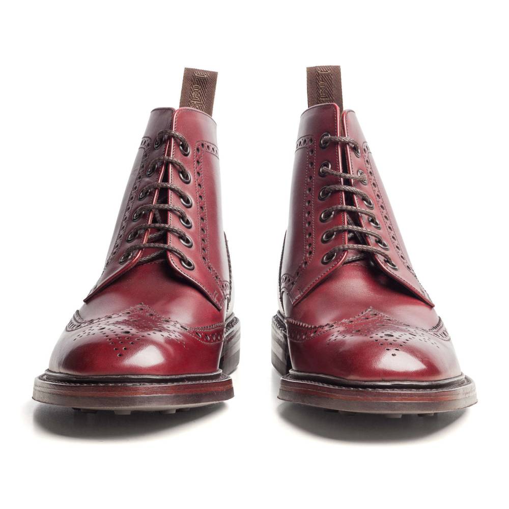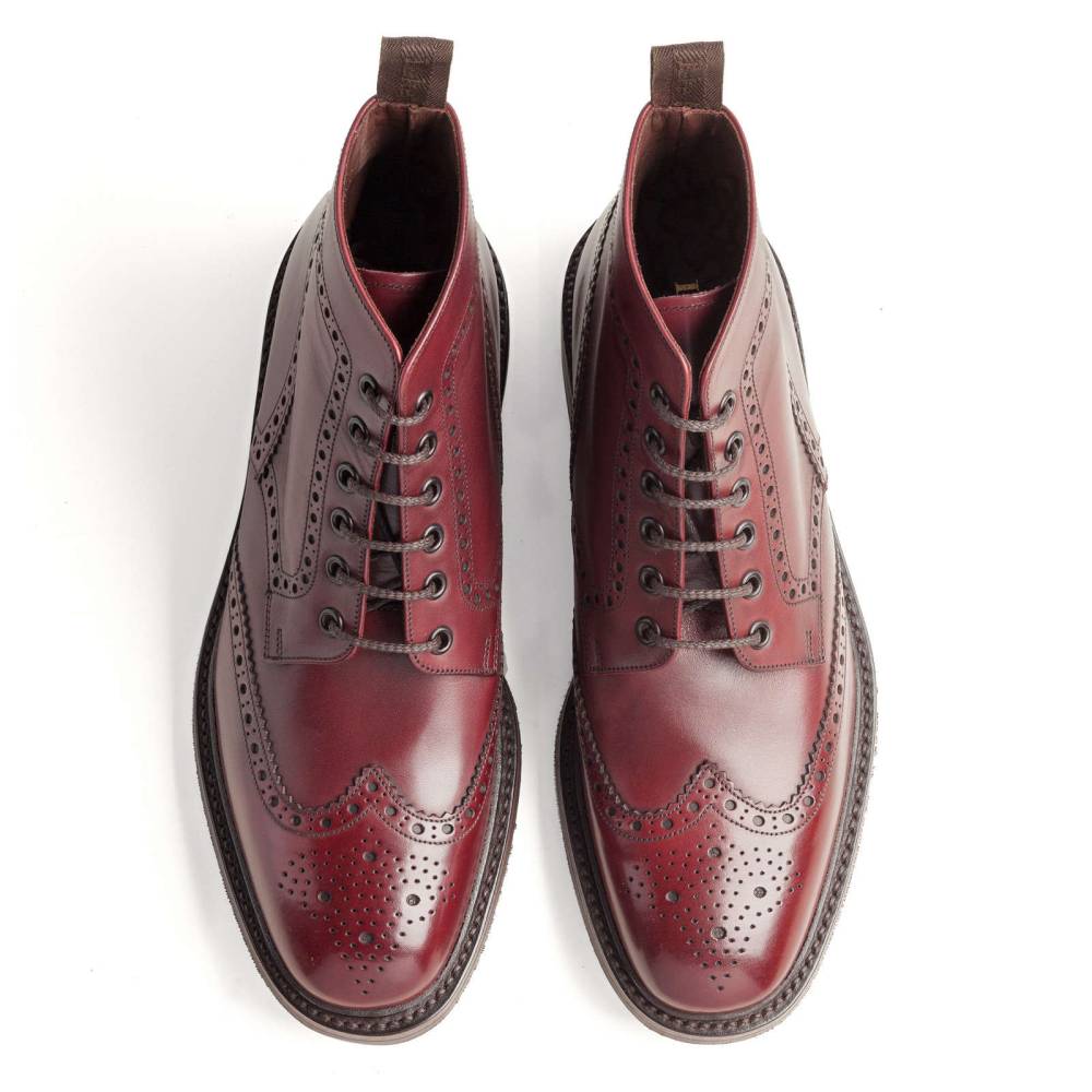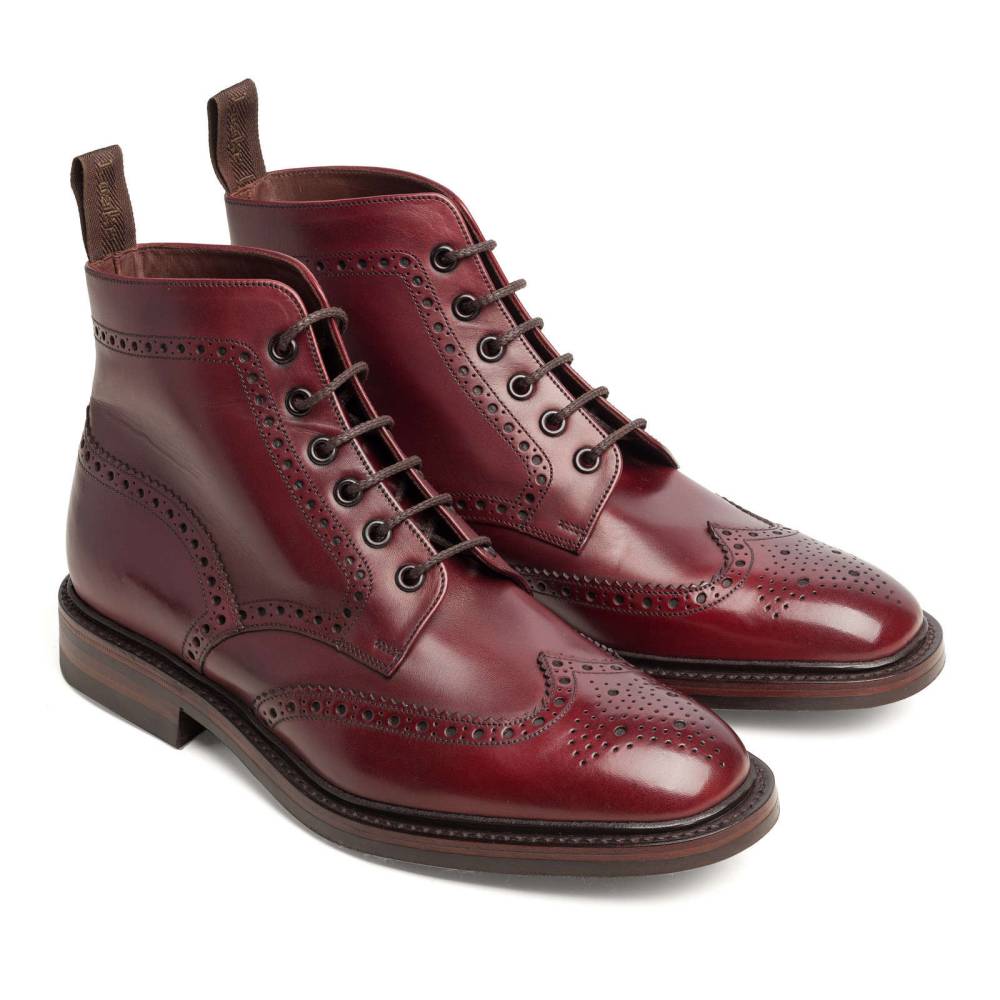 Высокие мужские ботинки Loake Burford из флагманской линейки Loake 1880 бордового цвета. Верхняя часть выполнена из гладкой телячьей кожи. Модель имеет широкий штормовой рант, который обеспечивает хорошую влагоустойчивость подошвы. Пяточная часть дополнена текстильной петлёй, что позволяет легко и быстро надевать ботинки. Подошва выполнена из прочной резины английской фирмы Dainite. Конструкция Goodyear Welted.