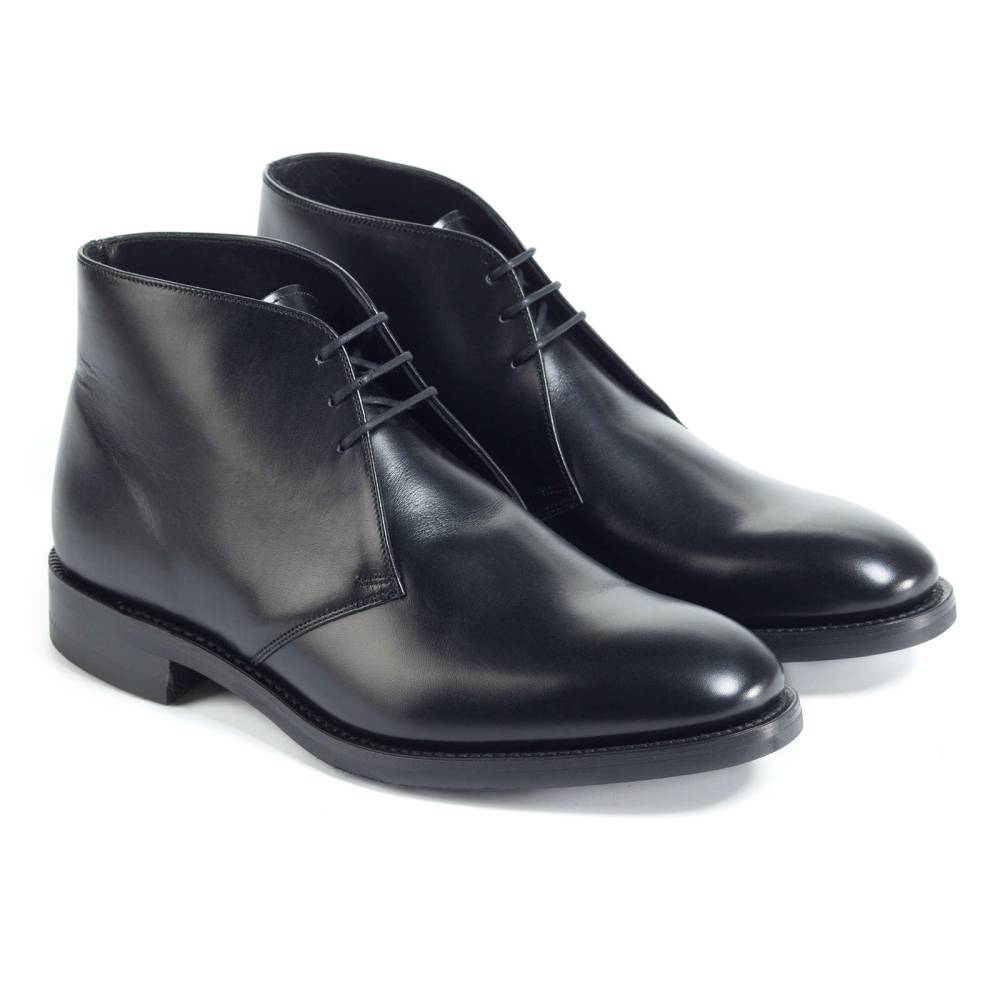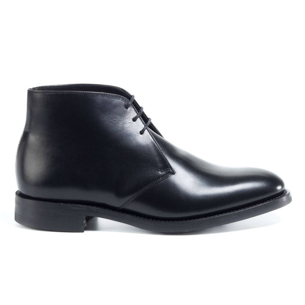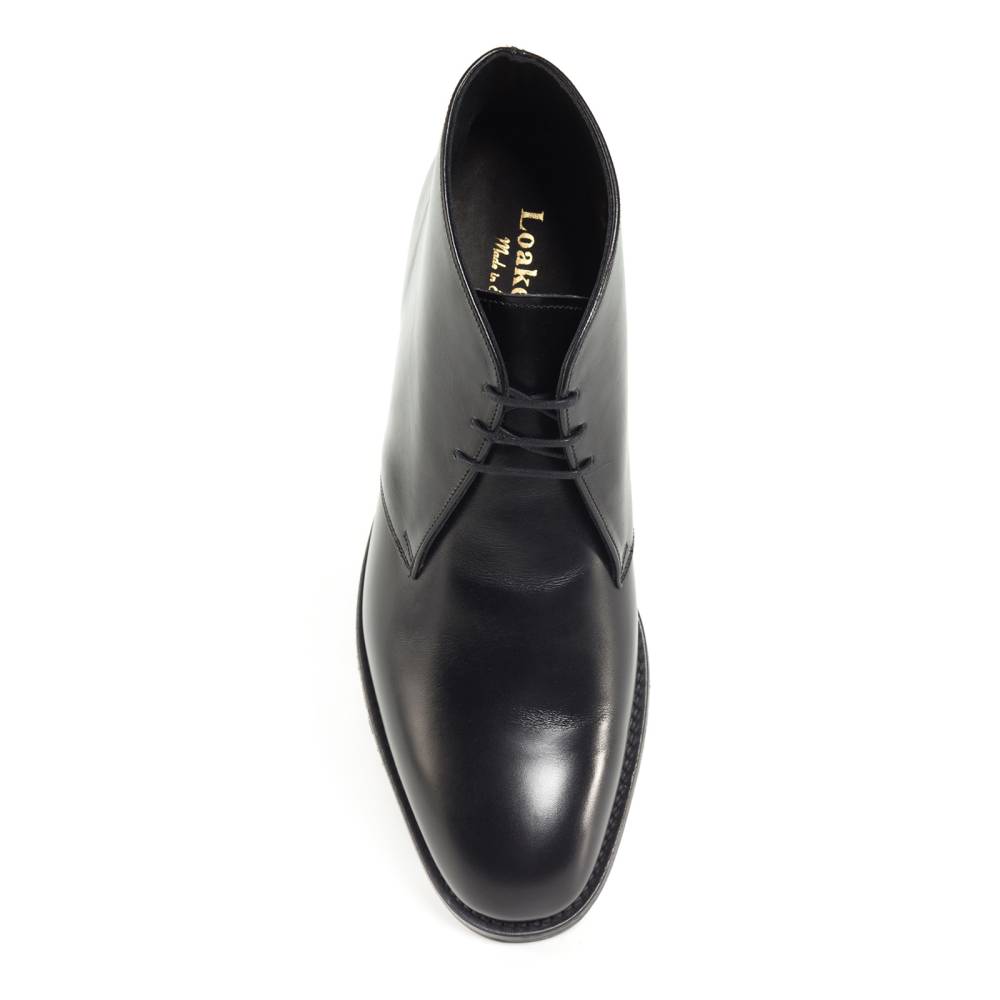 Ботинки чукка Loake Kempton из флагманской коллекции Loake 1880 на кожаной подошве. Верхняя часть выполнена из гладкой телячьей кожи чёрного цвета. Внутренняя отделка из тонкой мягкой кожи. Конструкция Goodyear.
