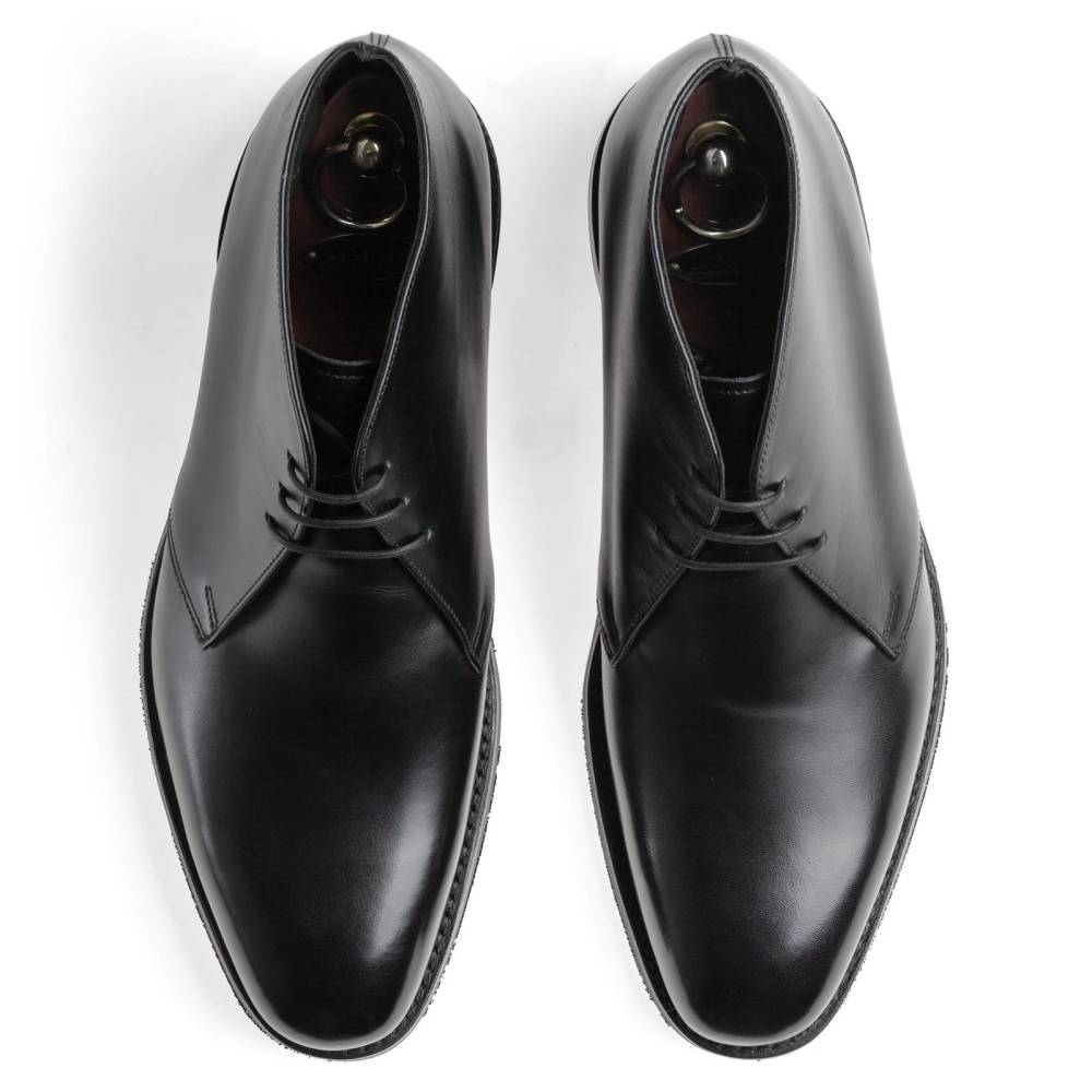 Ботинки чукка Loake Pimlico из флагманской коллекции Loake 1880. Верхняя часть выполнена из гладкой телячьей кожи чёрного цвета. Внутренняя отделка из тонкой мягкой кожи. На нижнюю часть подошвы установлена прочная резина английской фирмы Dainite. Конструкция Goodyear Welted.