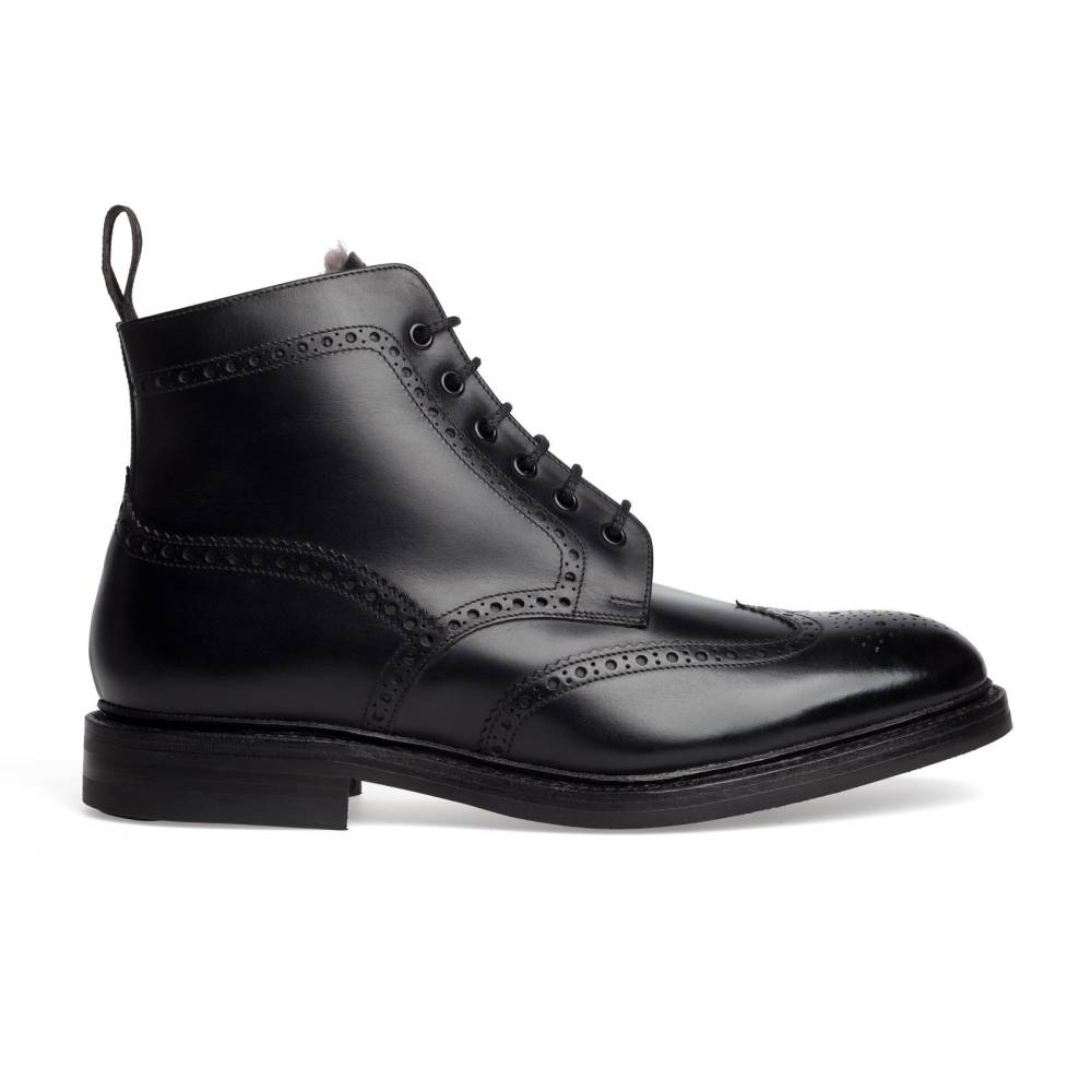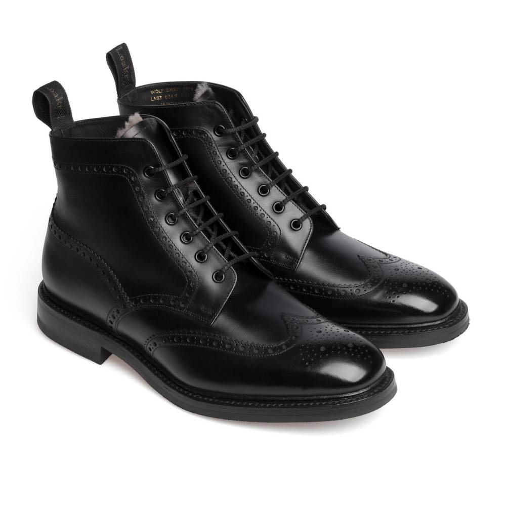 Тёплые зимние ботинки броги Loake Wolf из флагманской коллекции Loake 1880. Верхняя часть выполнена из гладкой телячьей кожи чёрного цвета. Модель имеет широкий штормовой рант, который обеспечивает влагоустойчивость подошвы. Внутри ботинки полностью отделаны густым и мягким овечьим мехом, в том числе и стелька. Подошва выполнена из кожи и прочной резины английской фирмы Dainite. Конструкция Goodyear Welted.