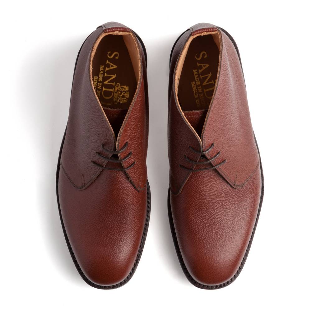 Осенние мужские ботинки «чукка» в исполнении английской фабрики Sanders. Верх выполнен из плотной мелкозернистой телячьей кожи коричневого цвета с красноватым оттенком. Рант пришит по всей окружности. Модель имеет прочную цельную резиновую подошву от компании Itshide. Внутренняя отделка полностью из натуральной кожи. Конструкция Goodyear Welted.