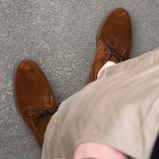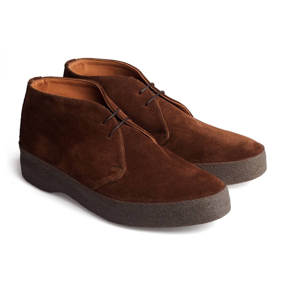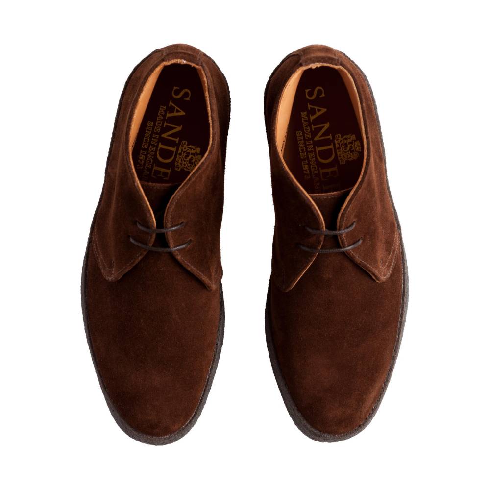 Культовая модель 70-х годов «Playboy Chukka» в исполнении английского бренда Sanders под названием Hi Top. Отчасти модель стала знаменита благодаря голливудской звезде и гонщику Стиву МакКуину, который как в жизни, так и в кино щеголял в ней «не снимая». Очень мягкая и удобная обувь из коричневой замши с водоотталкивающей защитой, поставляемой английской дубильней Charles F. Stead & Co. Внутри подкладка из тонкой телячьей кожи и цельная кожаная стелька. Особый комфорт доставляет массивная креповая подошва с отличными амортизирующими свойствами. Несмотря на то, что обувь сшита не в конструкции Goodyear Welted, между подошвой и стелькой также проложен слой из пробки, который со временем промнётся и примет форму стопы.