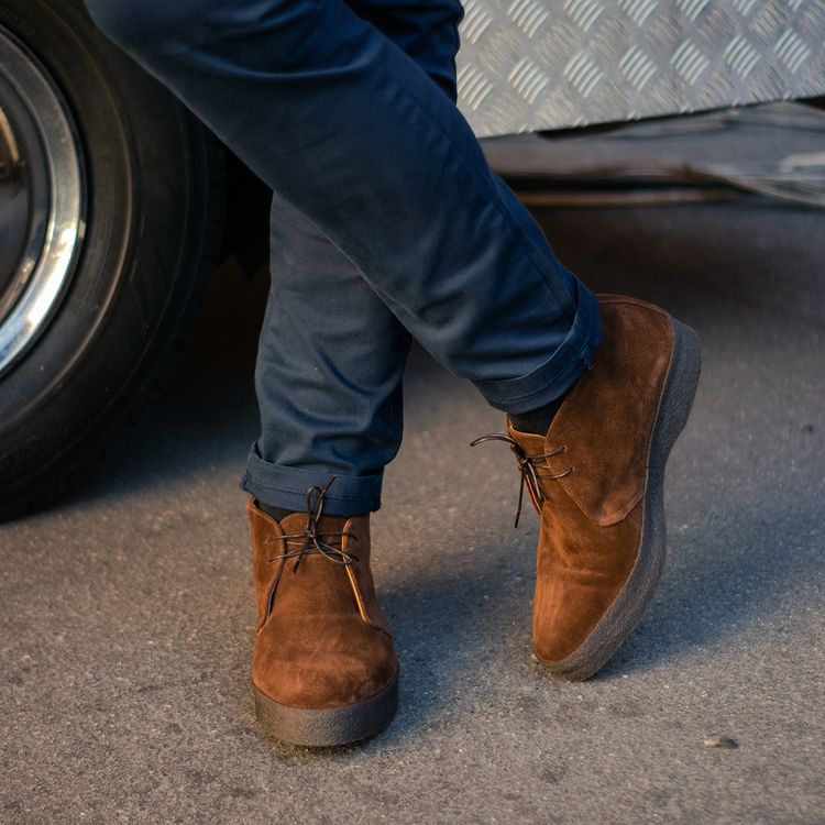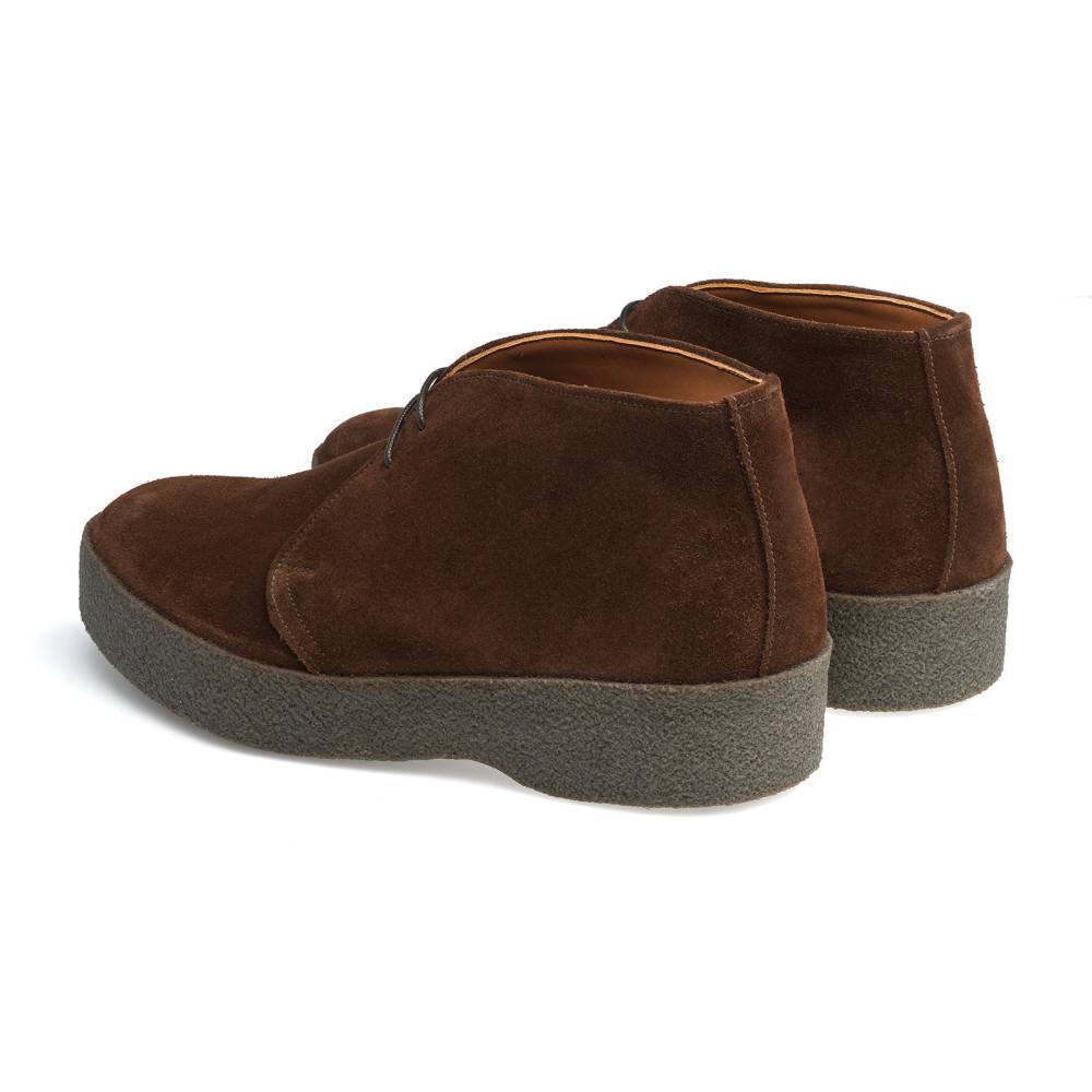 Модель выполнена в конструкции Cemented. Все части верха заворачиваются под стельку и приклеиваются к креповой подошве. Затем, на специальном станке, тонкая горячая креповая лента спаивается с замшей и подошвой по всей окружности ботинка.