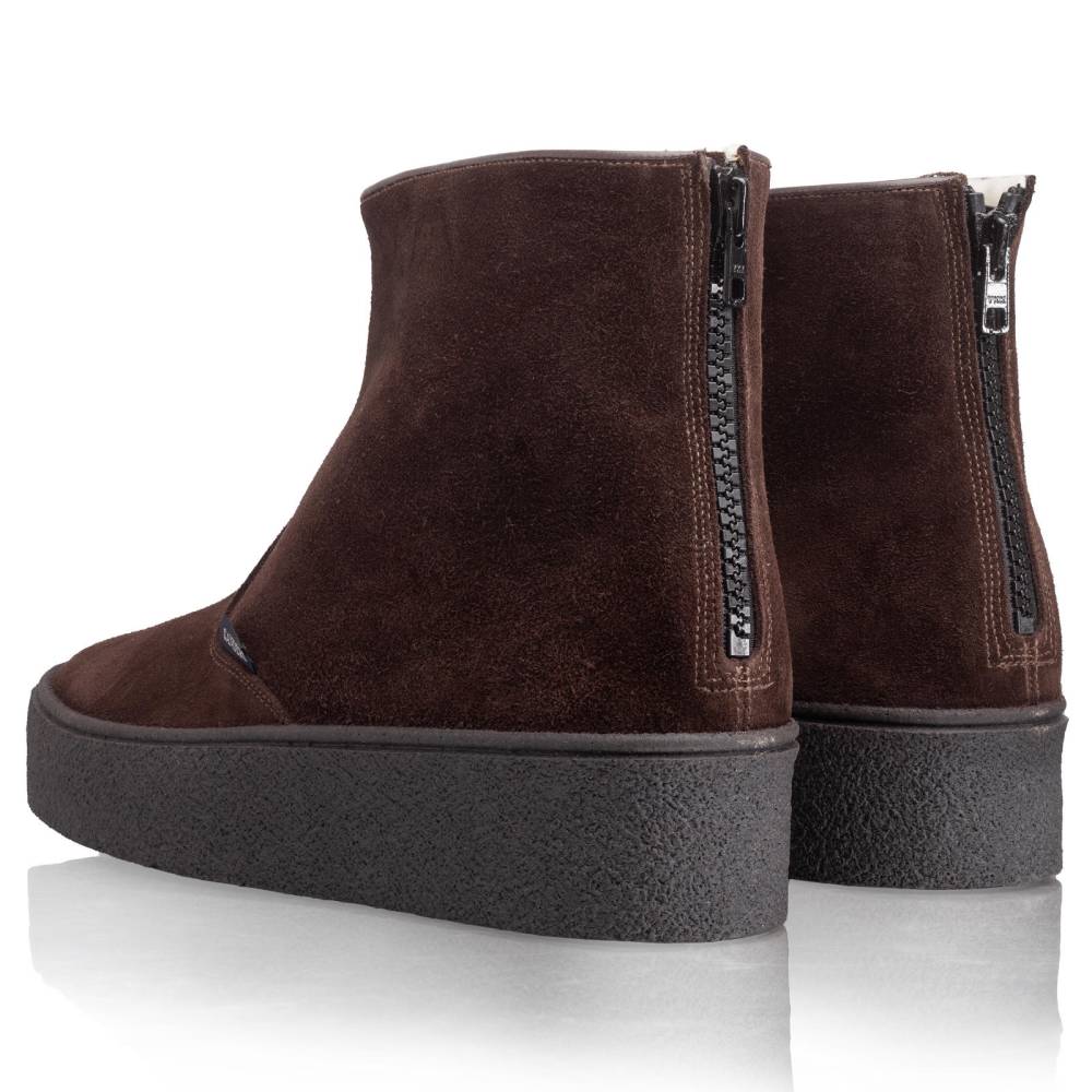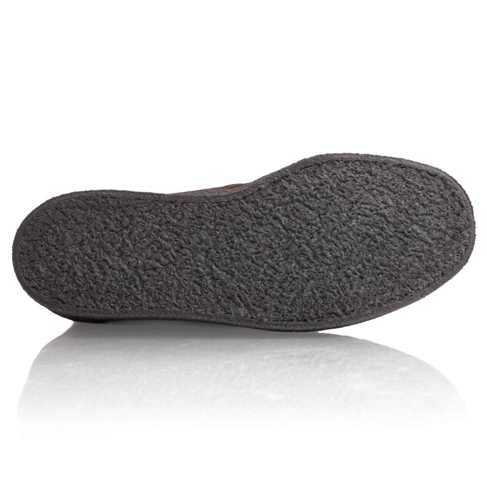 Модель выполнена в конструкции Cemented. Все части верха заворачиваются под стельку и приклеиваются к креповой подошве. Затем, на специальном станке, тонкая горячая креповая лента спаивается с замшей и подошвой по всей окружности ботинка.