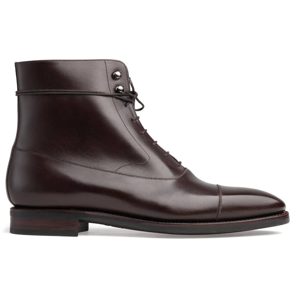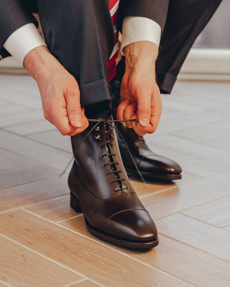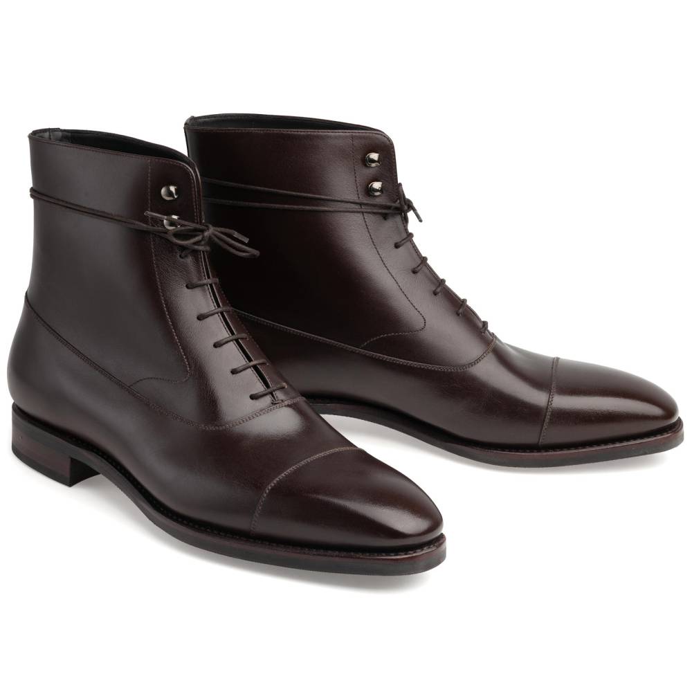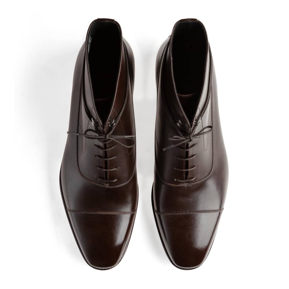 Высокие тёмно-коричневые классические ботинки испанского бренда TLB Mallorca из премиальной коллекции Artista. Верх выполнен из высококачественной гладкой телячьей кожи производства французской дубильни D’Anonnay. В верхней части берцев шнурки завязываются крест-накрест при помощи двух пар металлических крючков. Прочная резиновая подошва позволяет носить такие ботинки даже в ненастную погоду. Конструкция Goodyear Welted.