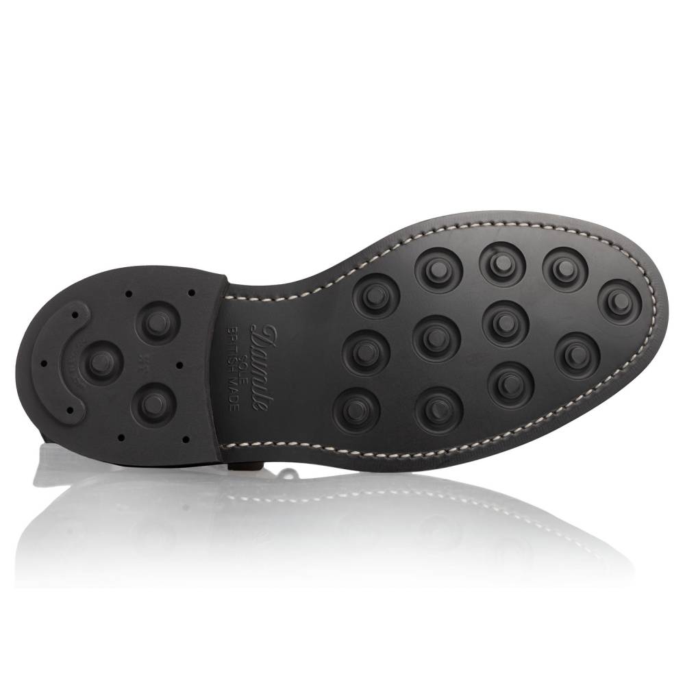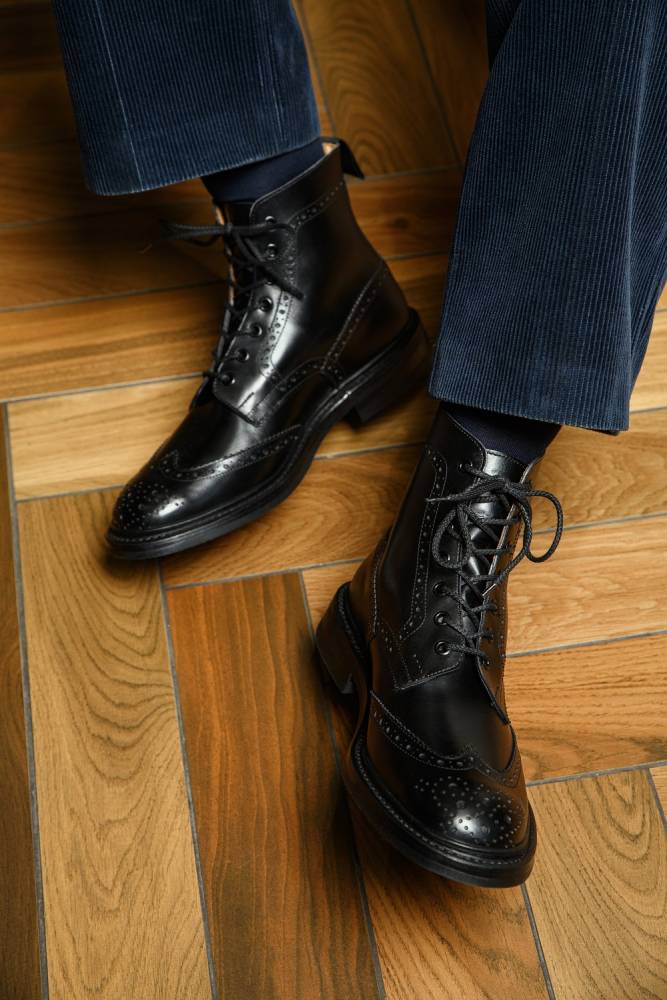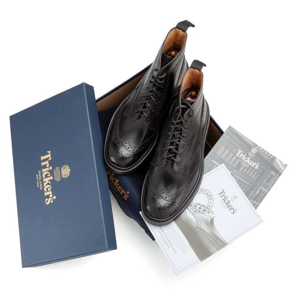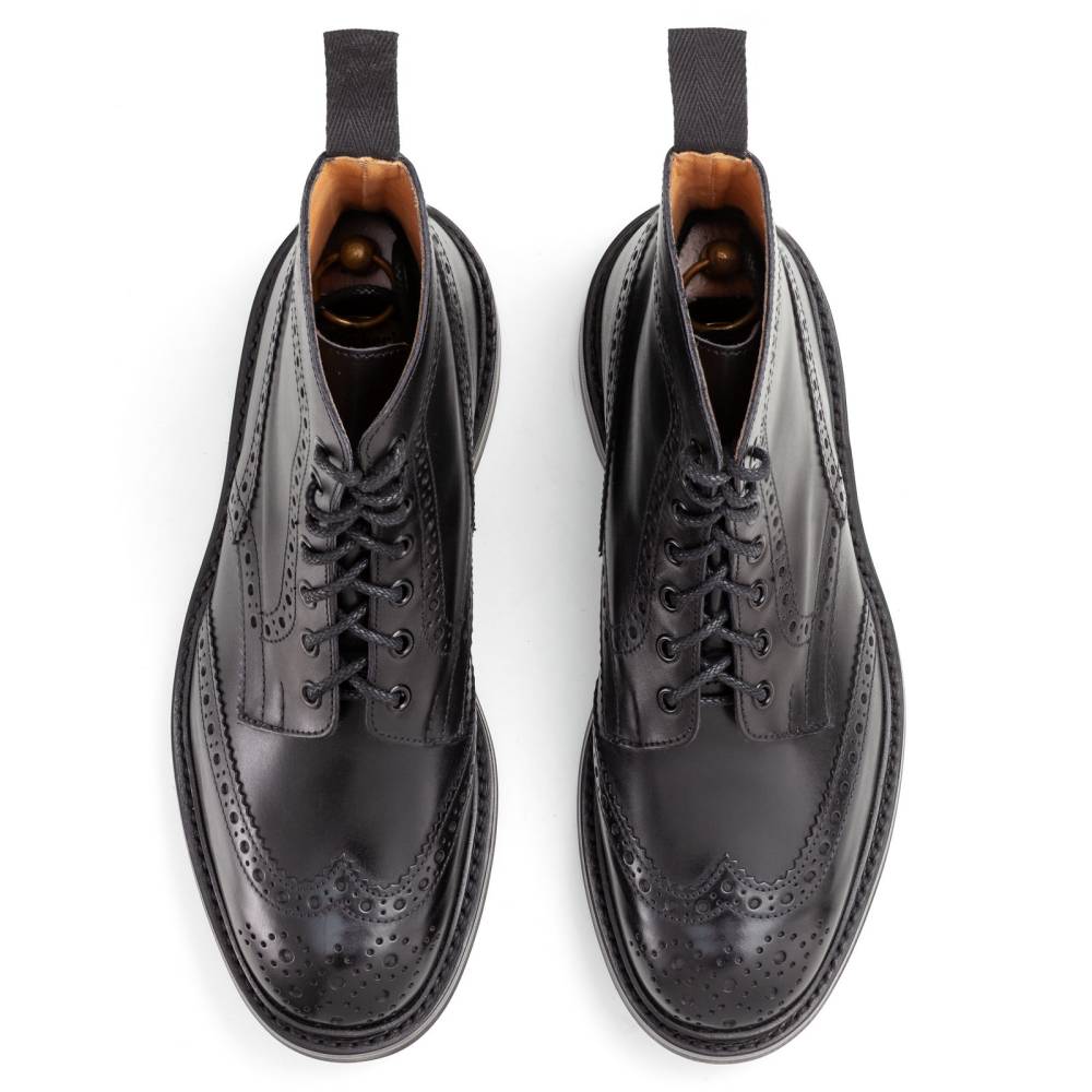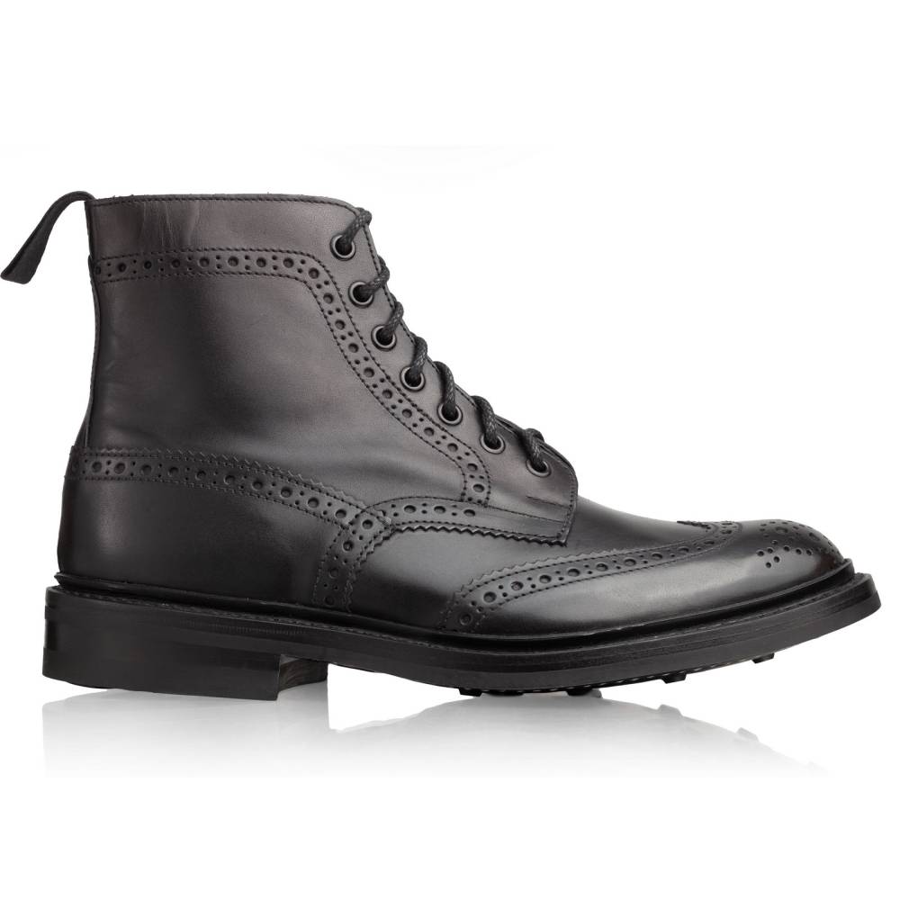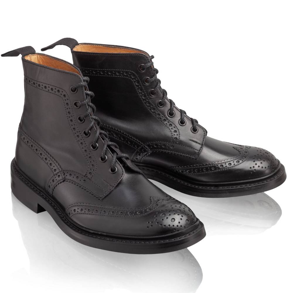 Культовые мужские ботинки Stow от старейшей английской фабрики Tricker's. Верхняя часть выполнена из плотной гладкой телячьей кожи чёрного цвета. Модель имеет широкий штормовой рант, который обеспечивает хорошую влагоустойчивость подошвы. Пяточная часть дополнена текстильной петлёй, что позволяет легко и быстро надевать ботинки. Подошва выполнена из прочной резины английской фирмы Dainite. Конструкция Goodyear Welted.