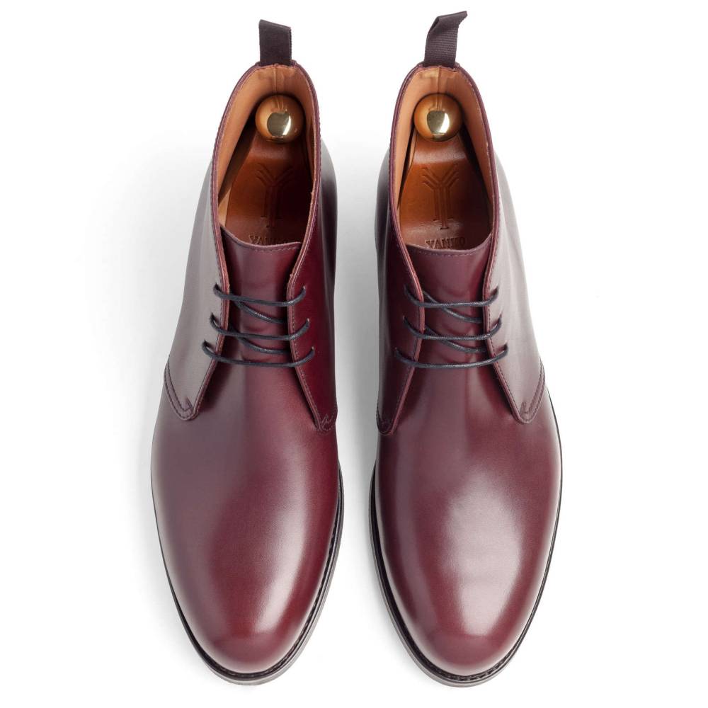 Классические мужские ботинки чукка испанского бренда Yanko. Верхняя часть выполнена из гладкой телячьей кожи бордового цвета. Внутренняя отделка из тонкой мягкой кожи. Подошва состоит из кожи и резины. Модель имеет три отверстия для шнурков. Ботинки сделаны на колодке 960 с полнотой G, поэтому они подойдут для широкой стопы с высоким подъёмом. Конструкция Goodyear Welted.