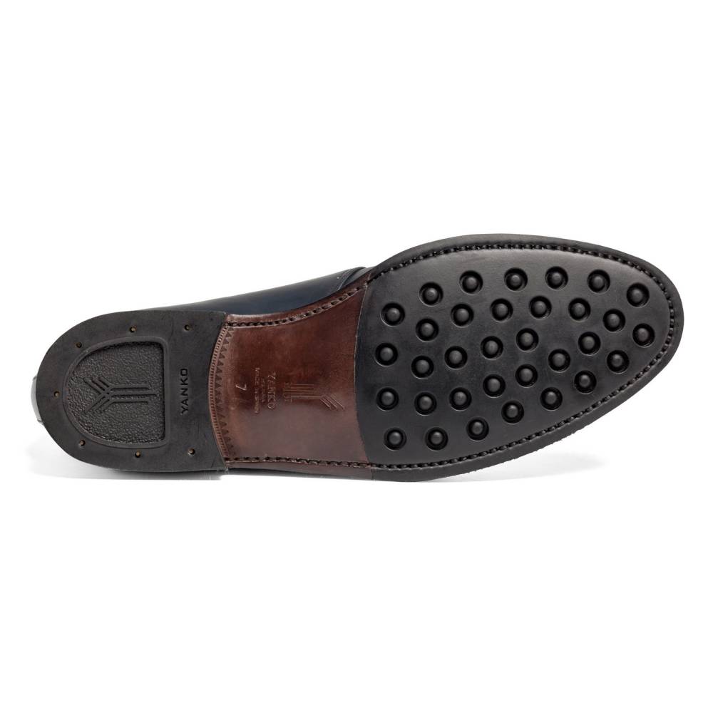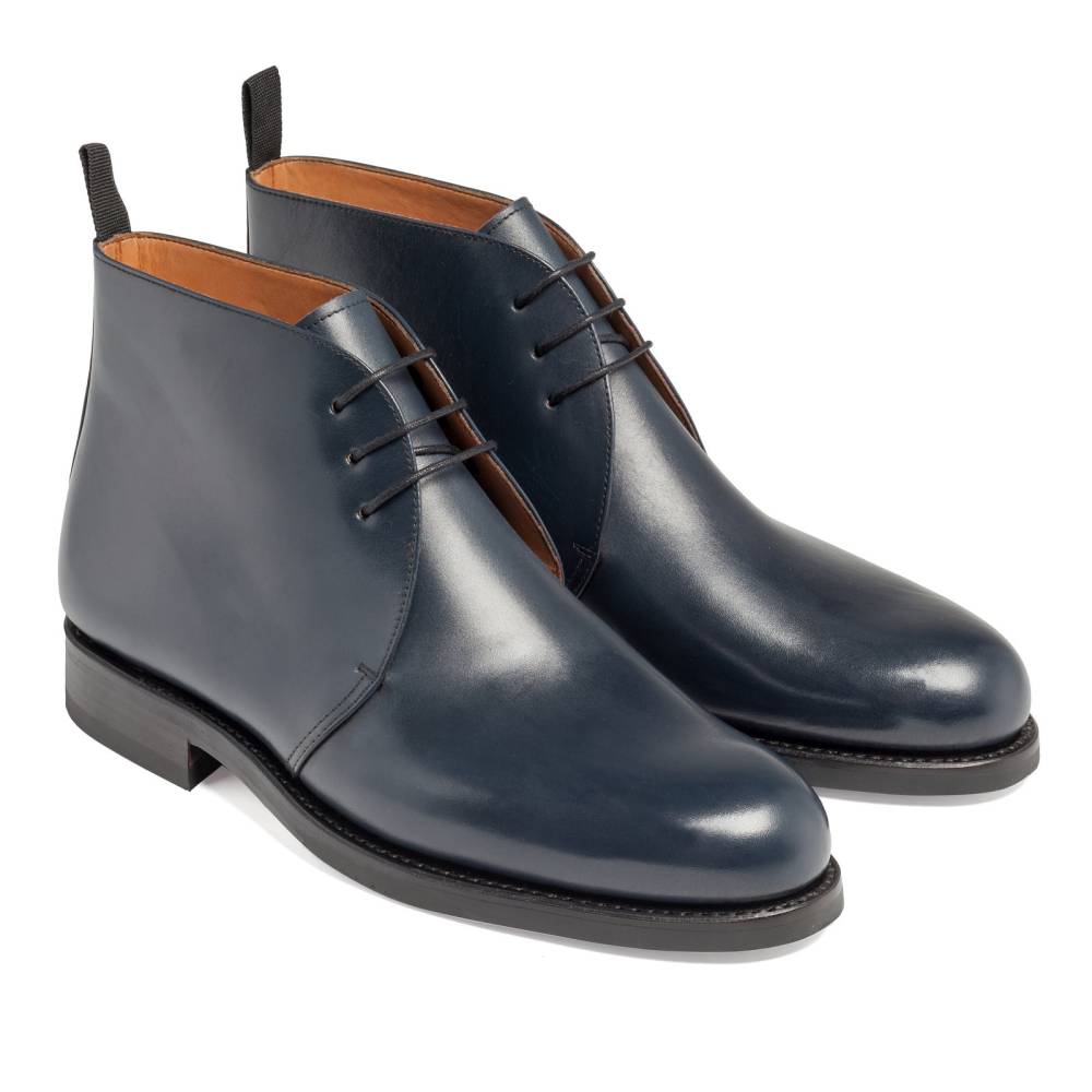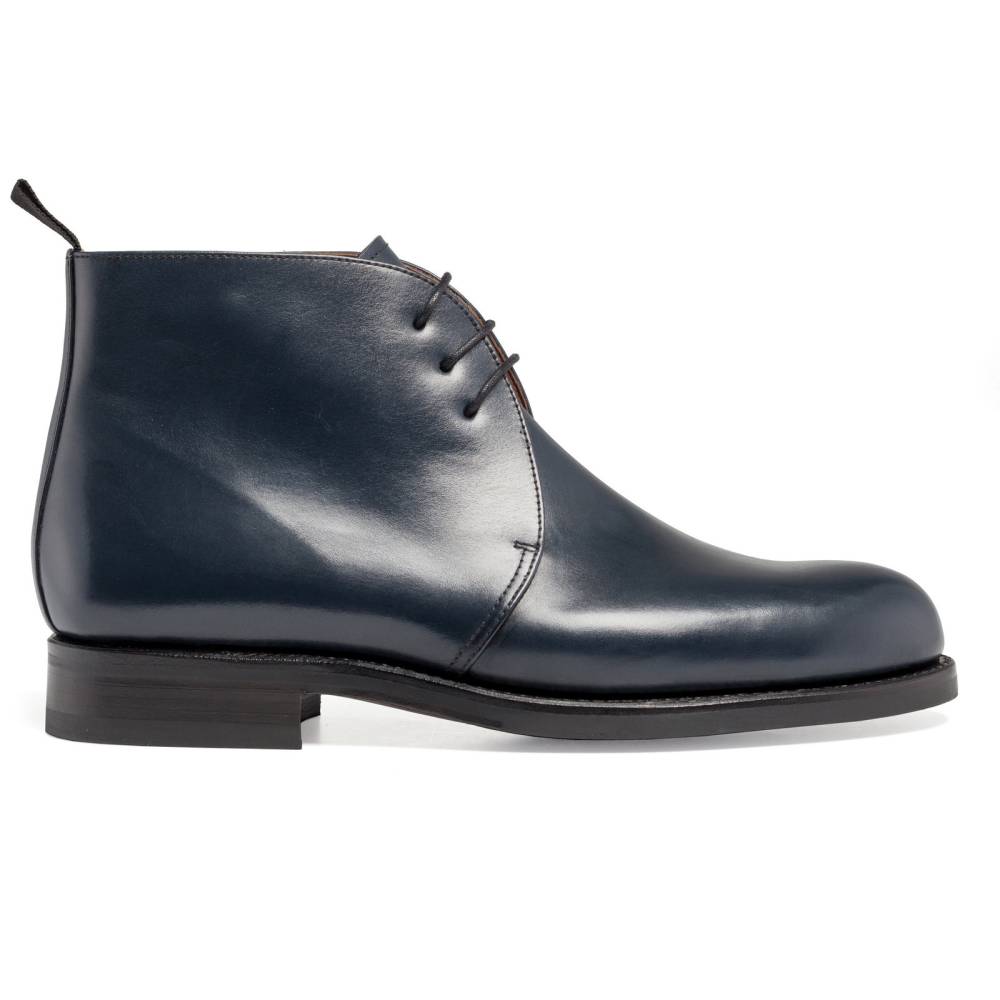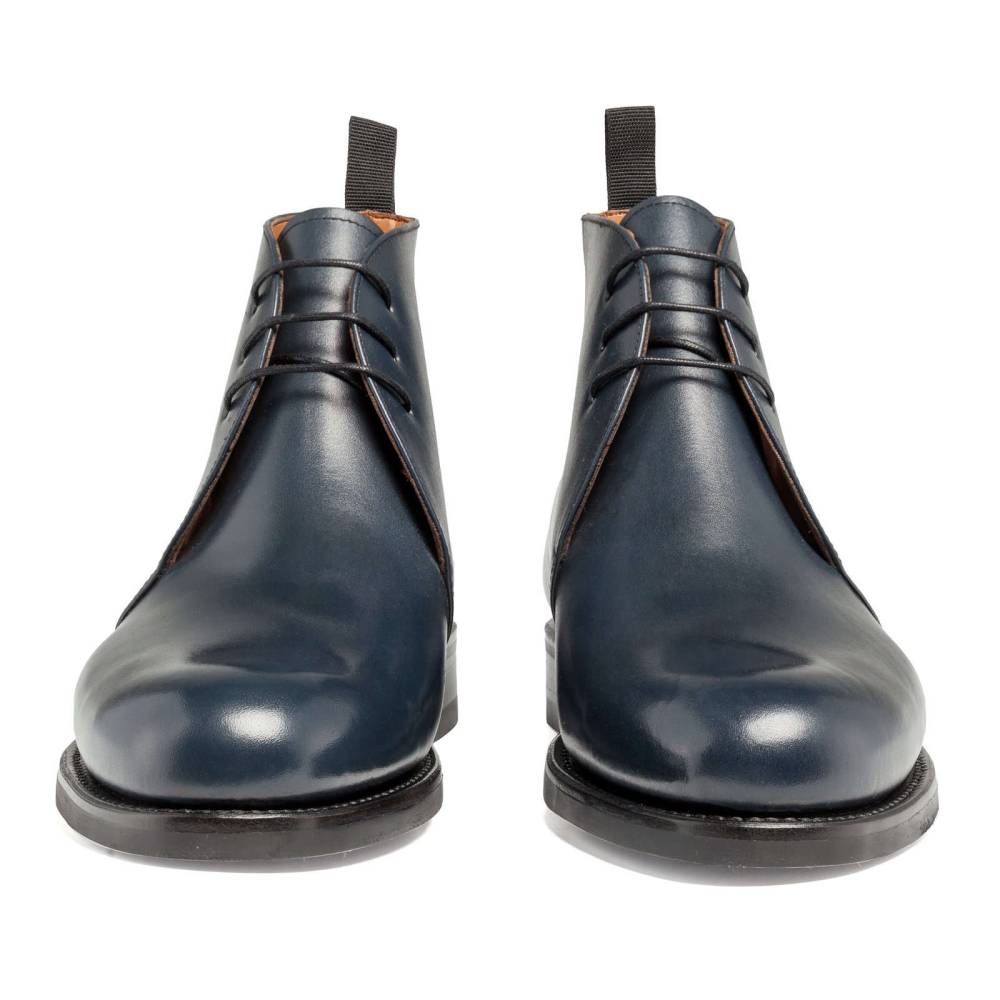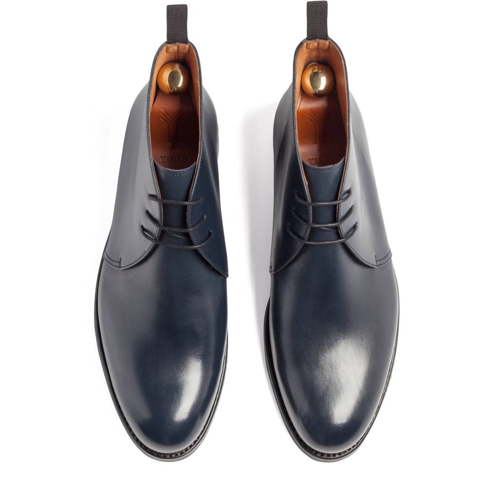 Классические мужские ботинки чукка испанского бренда Yanko. Верхняя часть выполнена из гладкой телячьей кожи тёмно-синего цвета. Внутренняя отделка из тонкой мягкой кожи. Подошва состоит из кожи и резины. Модель имеет три отверстия для шнурков. Ботинки сделаны на колодке 960 с полнотой G, поэтому они подойдут для широкой стопы с высоким подъёмом. Конструкция Goodyear Welted.
