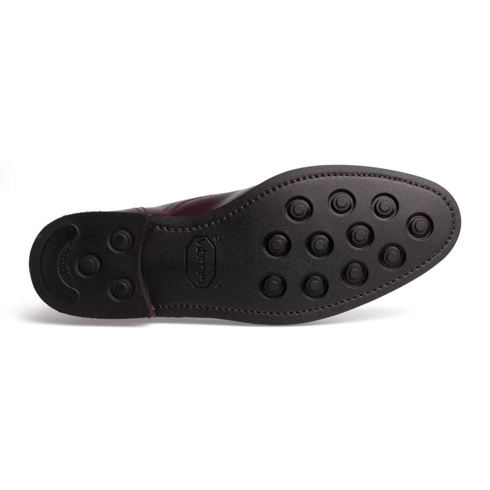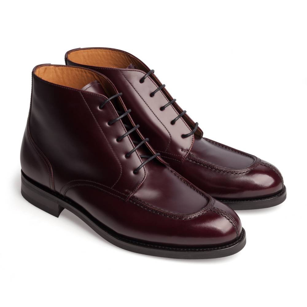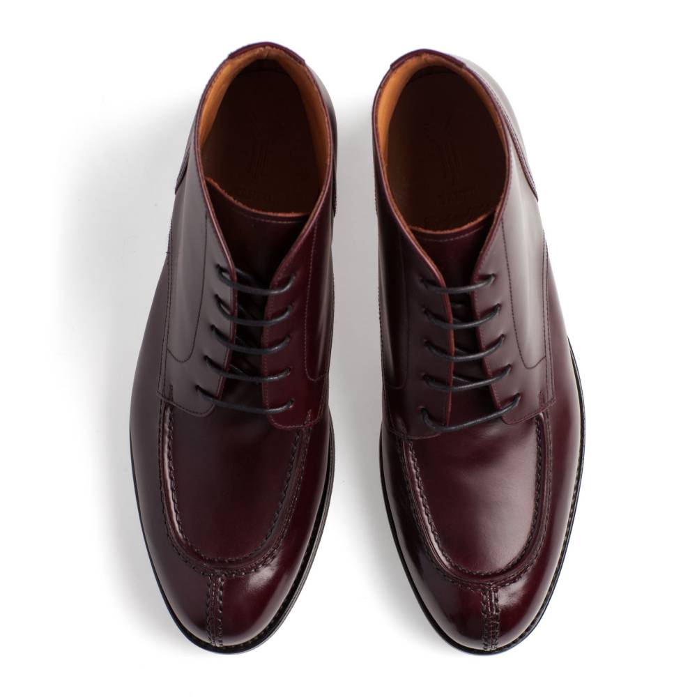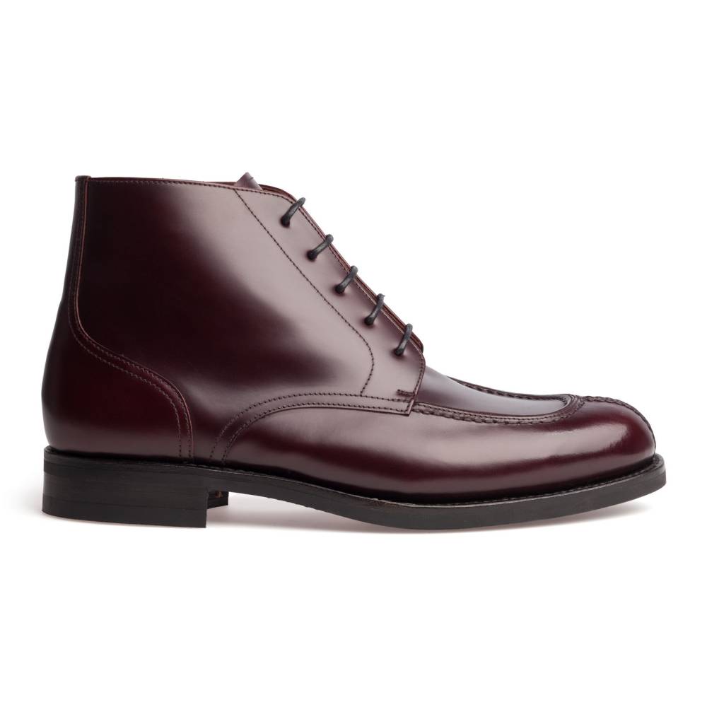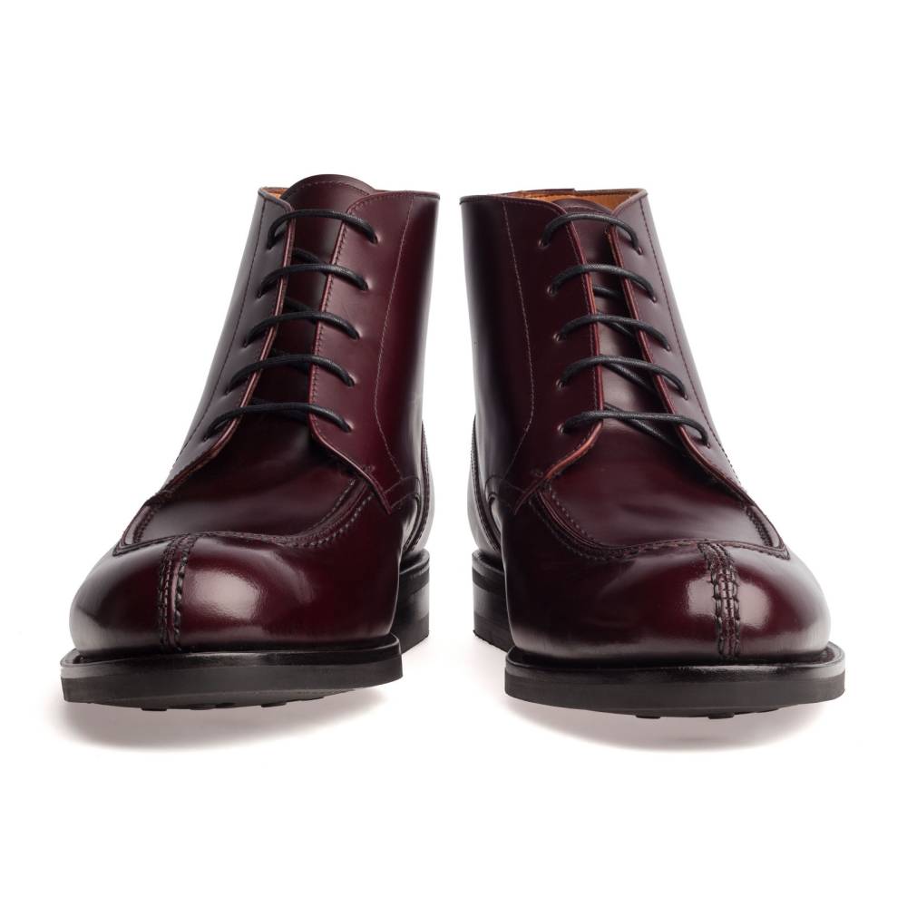 Высокие ботинки испанского бренда Yanko насыщенного бордового оттенка. Верх выполнен из плотной полированной телячьей кожи Rois с изысканным блеском, благодаря которому она выглядит подобно коже кордован (cordovan leather). Финишная обработка материала добавляет устойчивость к влаге и грязи, поэтому обувь из него прекрасно подходит для осени. Функциональной особенностью модели является прочная износоустойчивая резиновая подошва знаменитой итальянской компании Vibram®, а эстетической – так называемый норвежский мыс (он же – split toe). Конструкция Goodyear Welted.