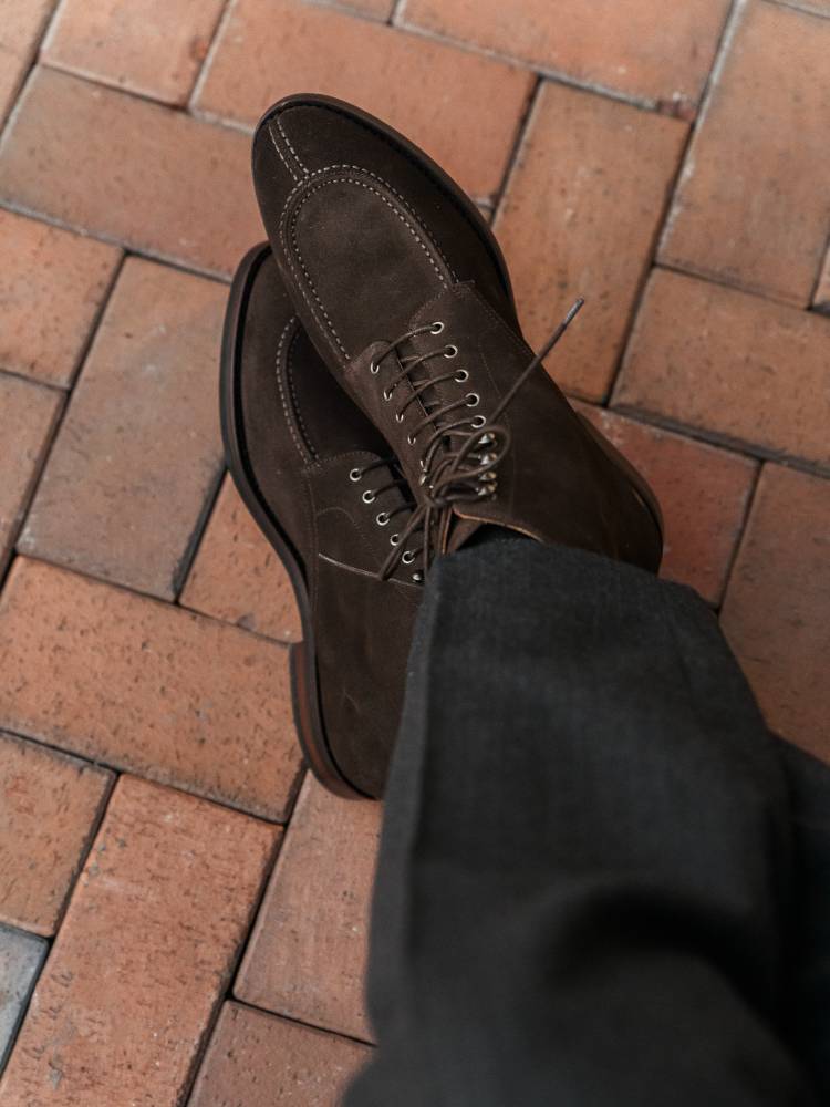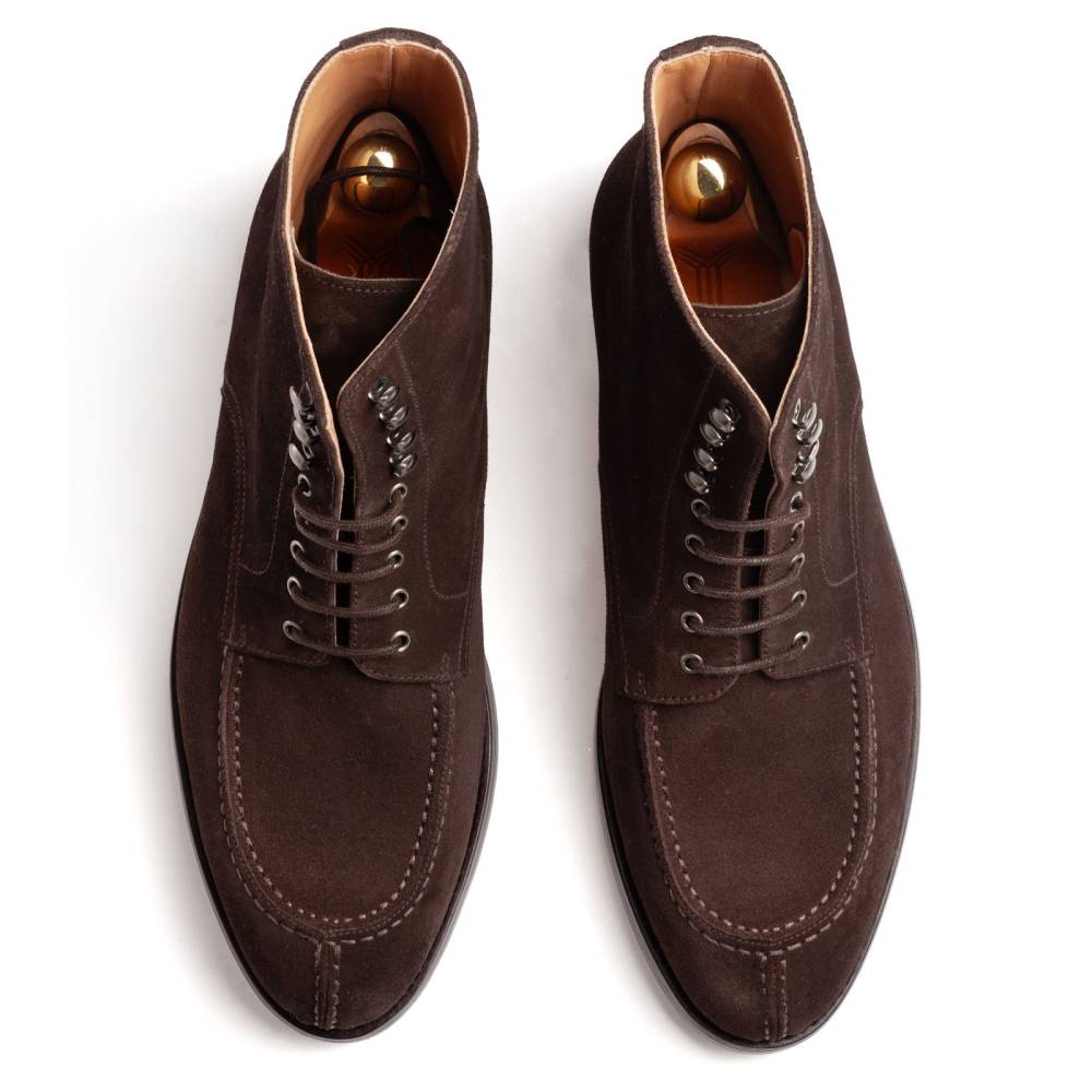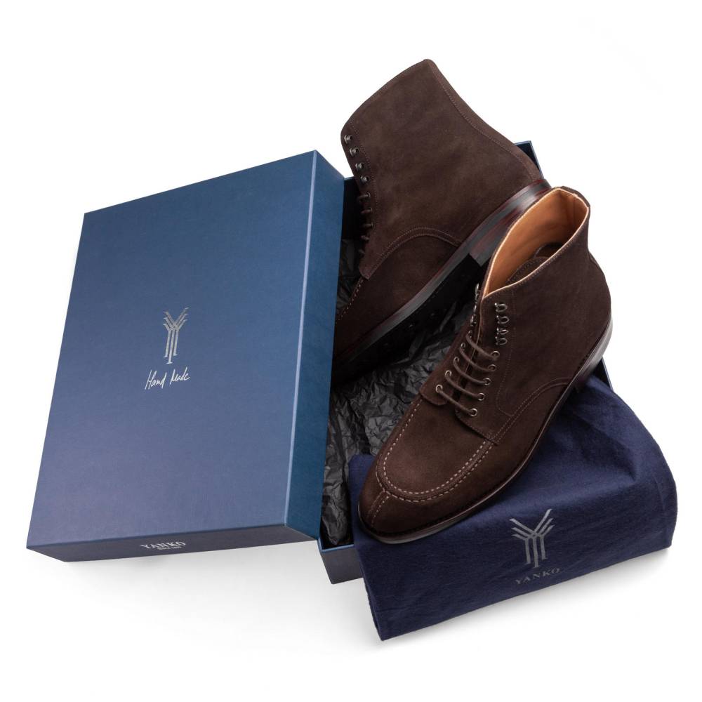 Повседневные высокие ботинки Yanko изготовлены в Испании в конструкции Goodyear Welted. Модель представляет собой ботинки в норвежском стиле с тремя контрастными строчками в передней части (split toe boots). Пара оснащена износостойкой резиновой подошвой Vibram. Верх выполнен из плотной приятной на ощупь замши с дополнительной защитой от влаги. В верхней части шнурки завязываются крест-накрест при помощи металлических крючков.