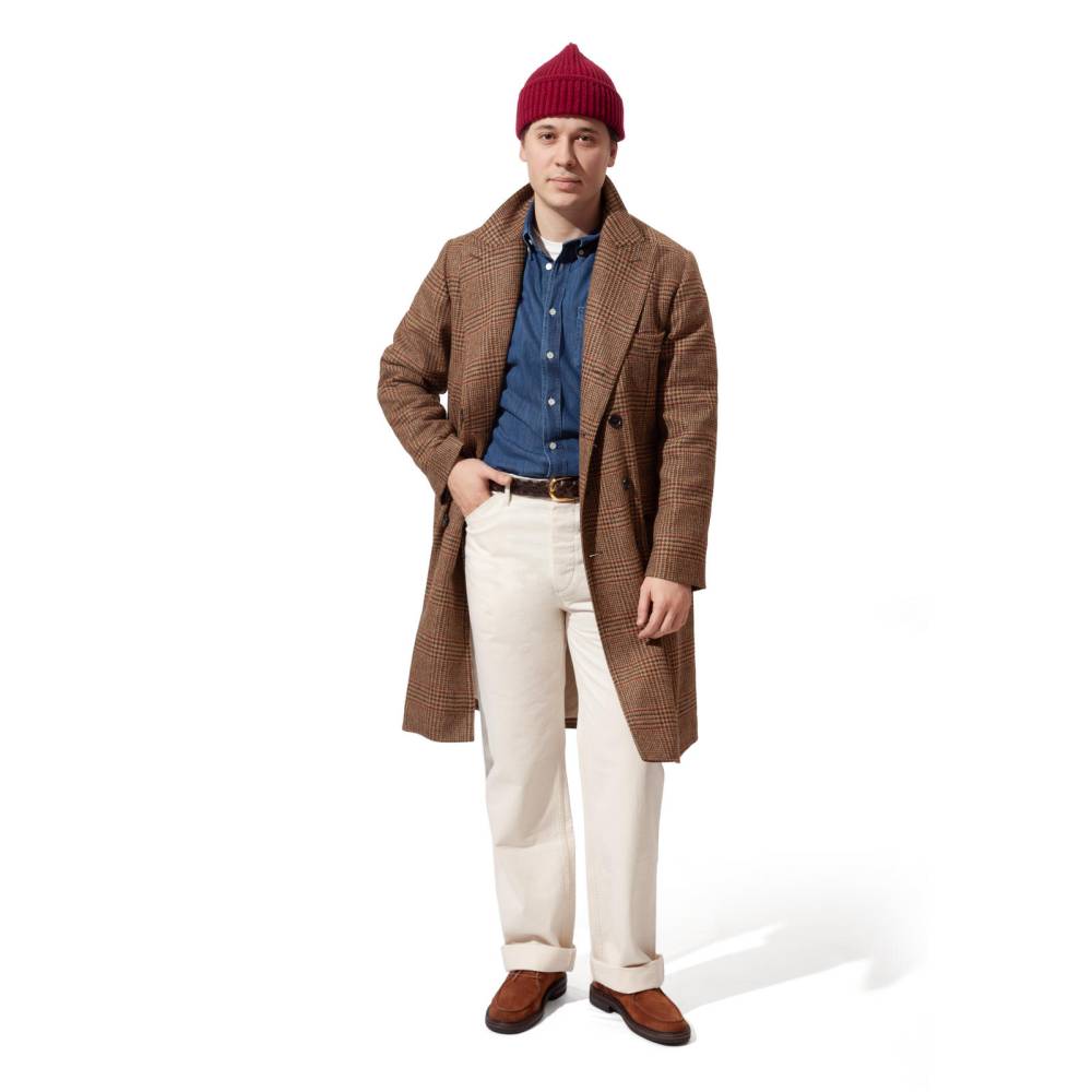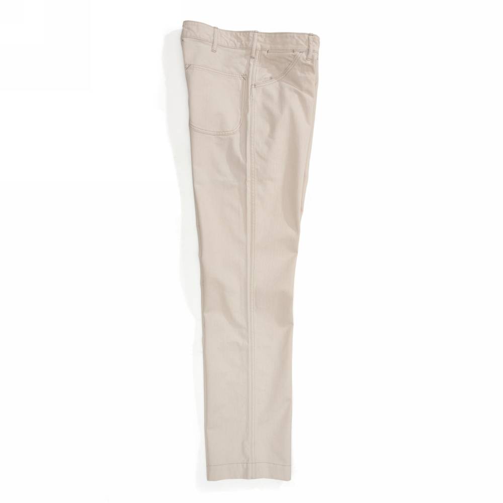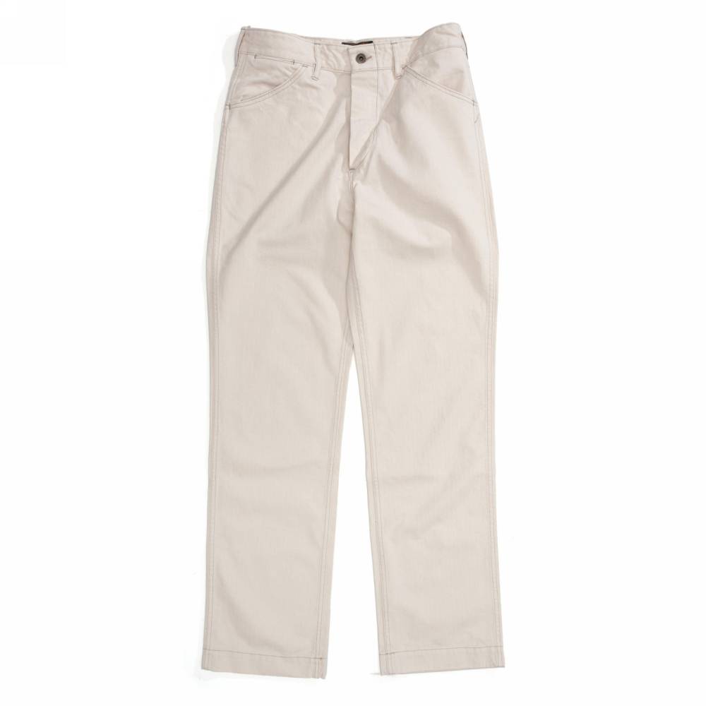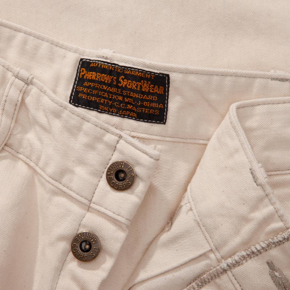 Брюки чинос модель P41-HBT от Pherrow's сшиты в Японии из лёгкого неокрашенного твила натурального цвета в ёлочку. Модель P41-HBT воспроизводит брюки армии США времен Второй мировой войны, известные как Khaki 41, поставляемые для вооруженных сил в 41 году. Pherrow's воссоздали не только силуэт брюк, но и другие знаковые детали: оригинальные металлические пуговицы с надписью Marine Corps U.S., карманы и двойную строчку по бокам. Материал для брюк также произведён в Японии – это премиальная износостойкая ткань из 100% хлопка, которая сохраняет форму, при этом очень комфортная и приятная на ощупь. Прямой крой, средняя посадка.