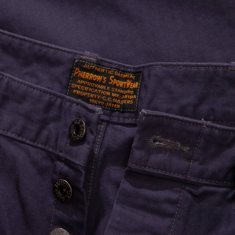 Брюки чинос модель P41-HBT от Pherrow's сшиты в Японии из лёгкого твила тёмно-синего цвета в ёлочку. Модель P41-HBT воспроизводит брюки армии США времен Второй мировой войны, известные как Khaki 41, поставляемые для вооруженных сил в 41 году. Pherrow's воссоздали не только силуэт брюк, но и другие знаковые детали: оригинальные металлические пуговицы с надписью Marine Corps U.S., карманы и двойную строчку по бокам. Материал для брюк также произведён в Японии – это премиальная износостойкая ткань из 100% хлопка, которая сохраняет форму, при этом очень комфортная и приятная на ощупь. Прямой крой, средняя посадка.