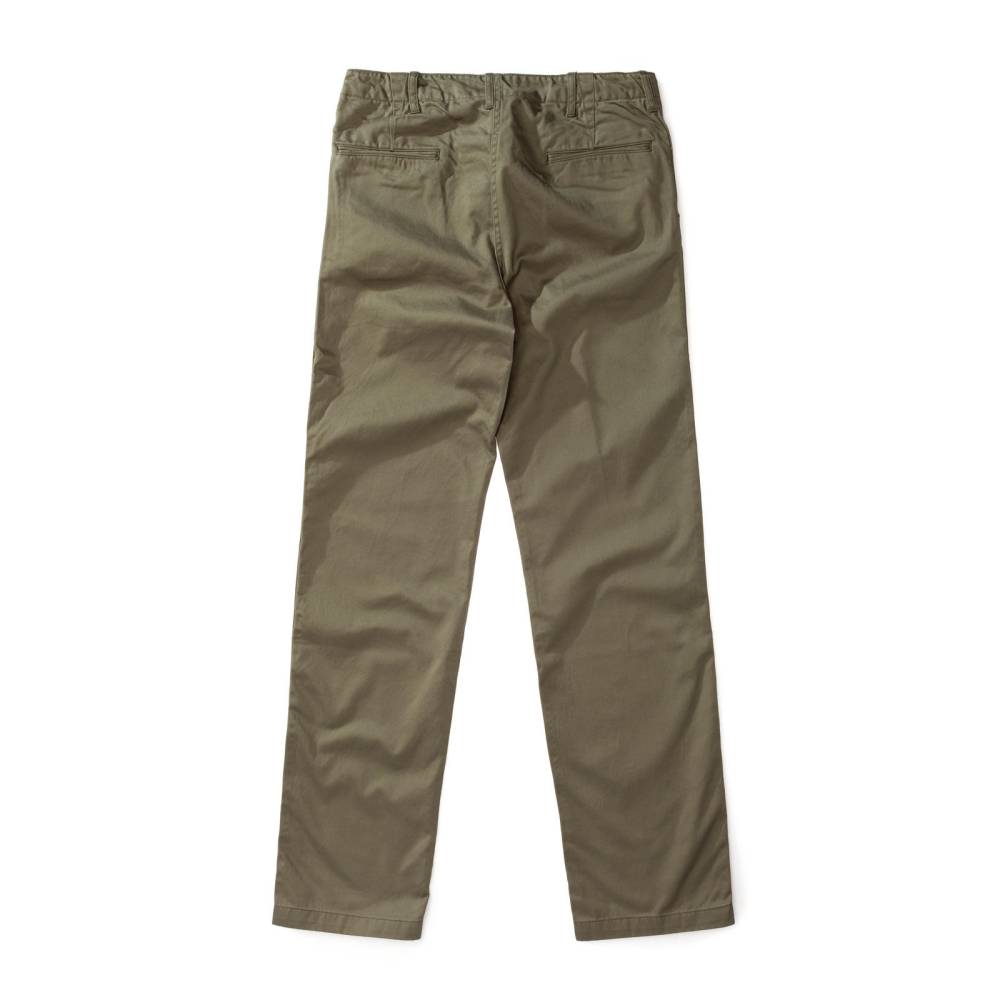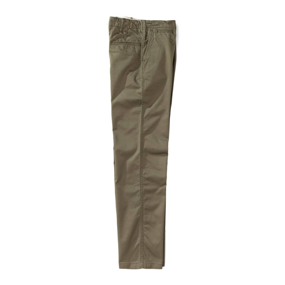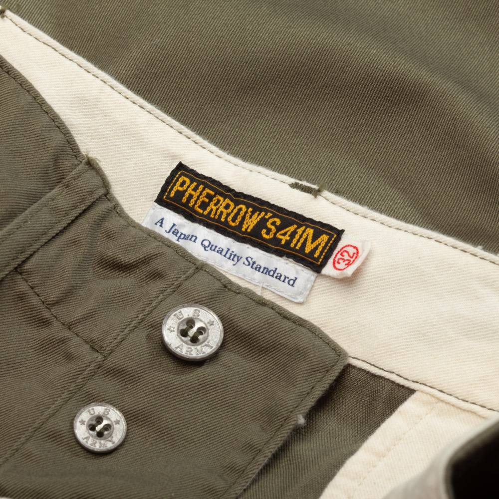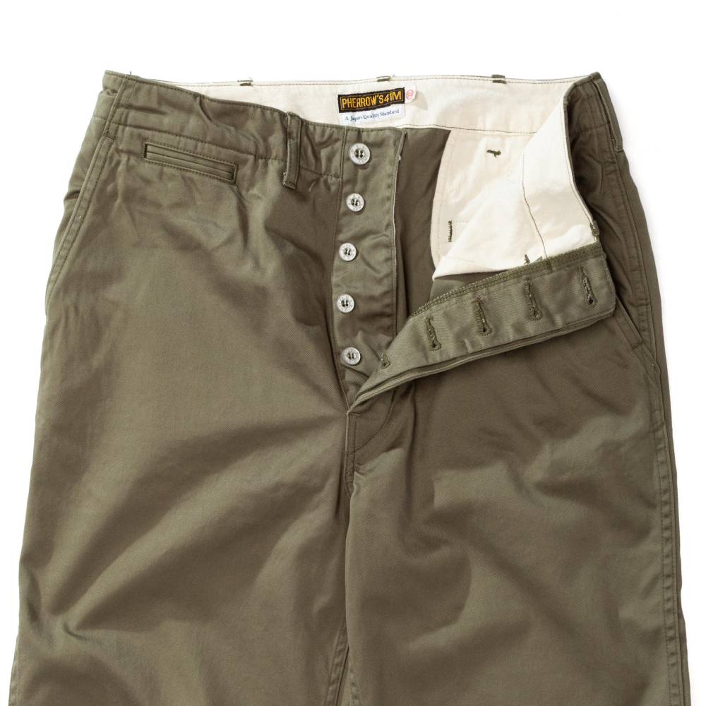 Брюки чинос модель P41M от Pherrow's сшиты в Японии из плотного левостороннего твила оливкового цвета. Модель P41M воспроизводит брюки армии США времен Второй Мировой Войны, известные как Khaki 41, поставляемые для вооруженных сил в 41 году. Pherrow's воссоздали не только силуэт брюк, но и другие знаковые детали: оригинальные металлические (из цинка) пуговицы, карманы и двойную строчку по бокам. Материал для брюк также произведен в Японии – это премиальная износостойкая ткань из 100% хлопка, которая сохраняет форму, при этом очень комфортная и приятная на ощупь. Прямой крой, средняя посадка.