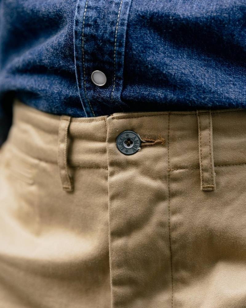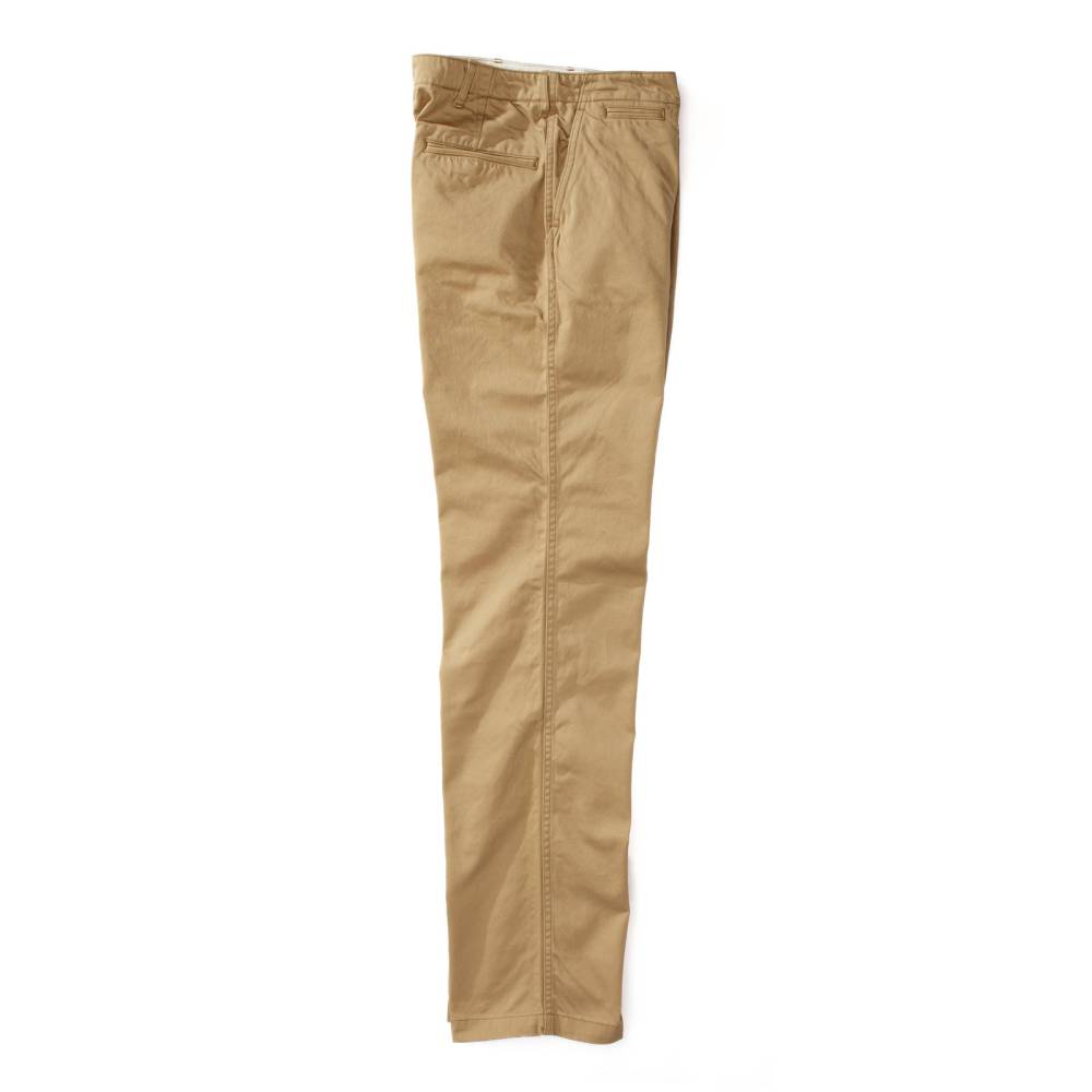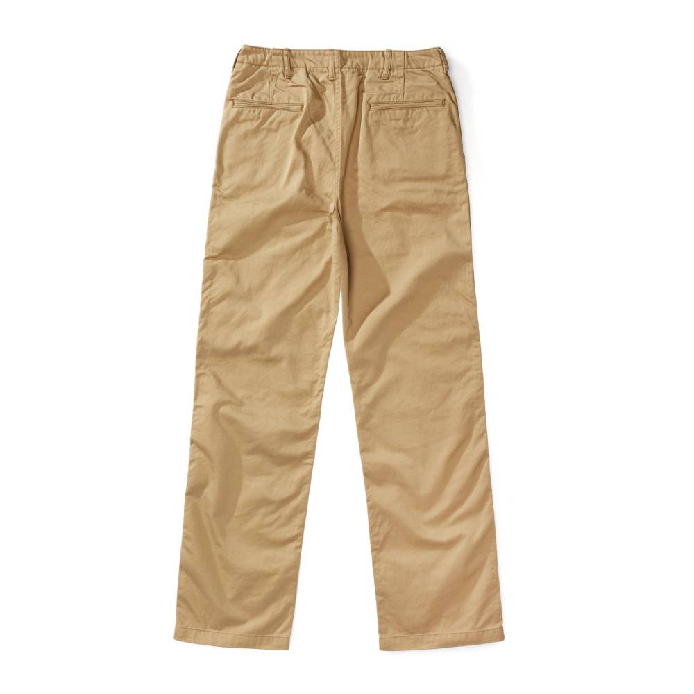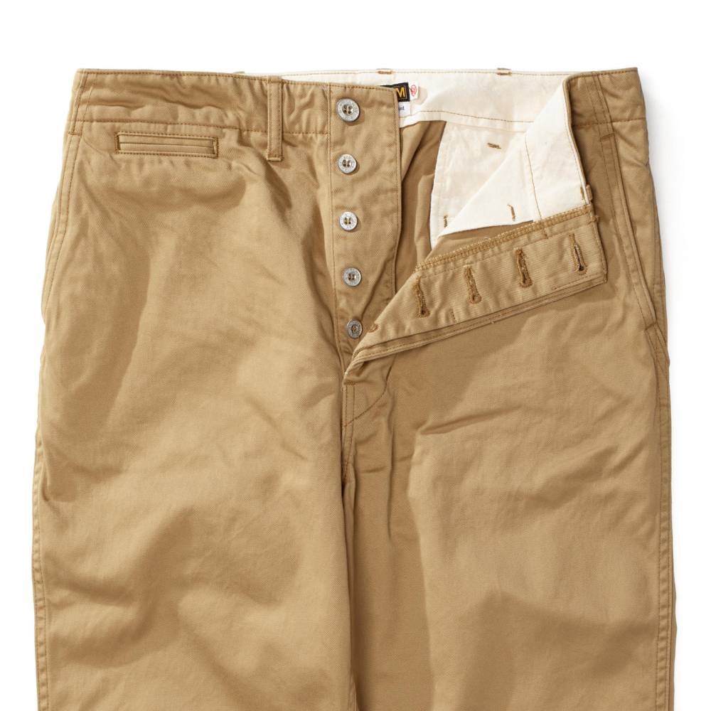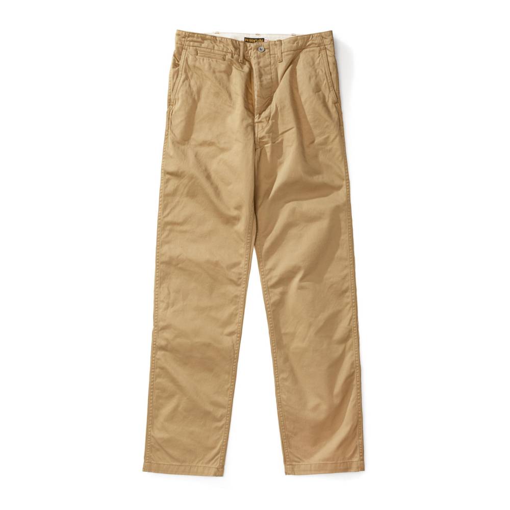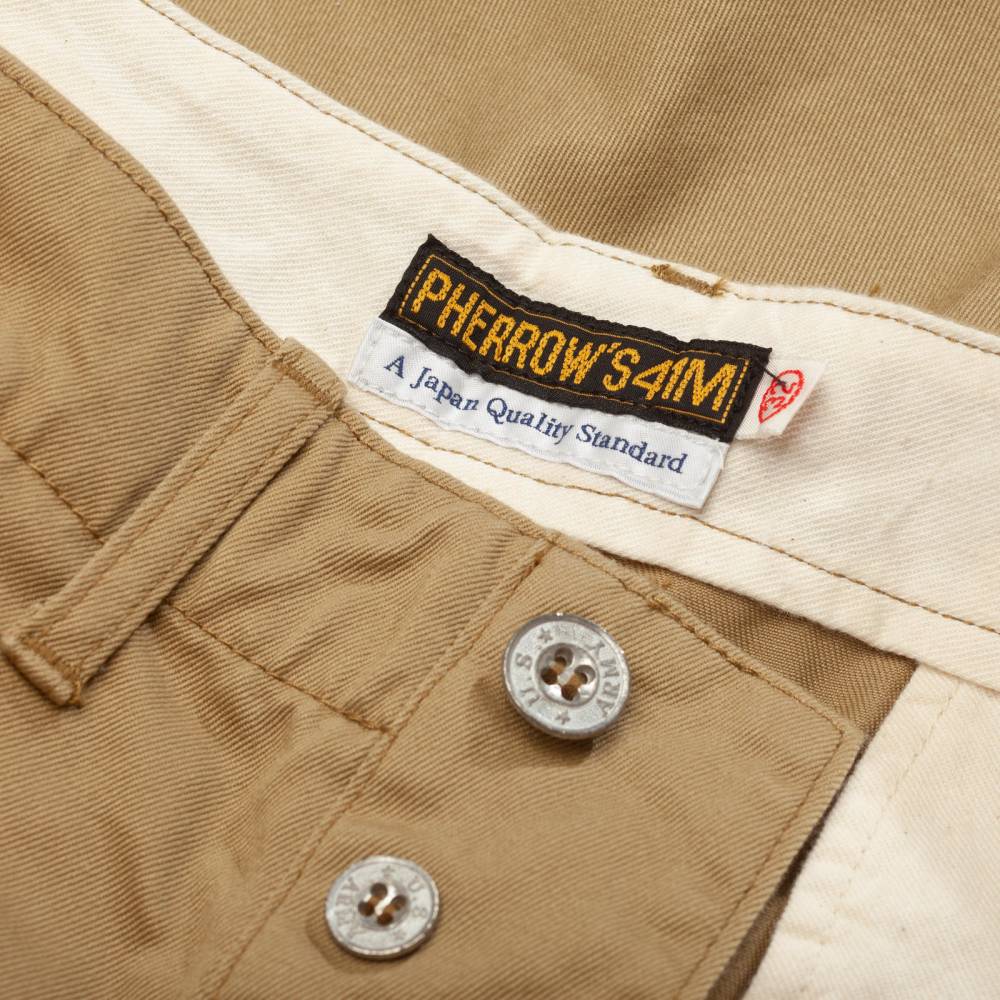 Брюки чинос модель P41M от Pherrow's сшиты в Японии из плотного левостороннего твила бежевого цвета. Модель P41M воспроизводит брюки армии США времен Второй Мировой Войны, известные как Khaki 41, поставляемые для вооруженных сил в 41 году. Pherrow's воссоздали не только силуэт брюк, но и другие знаковые детали: оригинальные металлические (из цинка) пуговицы, карманы и двойную строчку по бокам. Материал для брюк также произведен в Японии – это премиальная износостойкая ткань из 100% хлопка, которая сохраняет форму, при этом очень комфортная и приятная на ощупь. Прямой крой, средняя посадка.