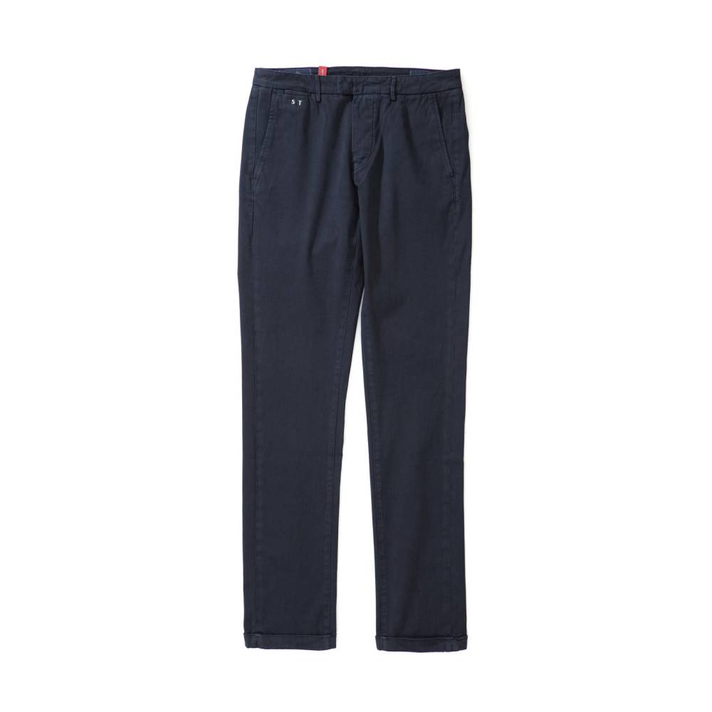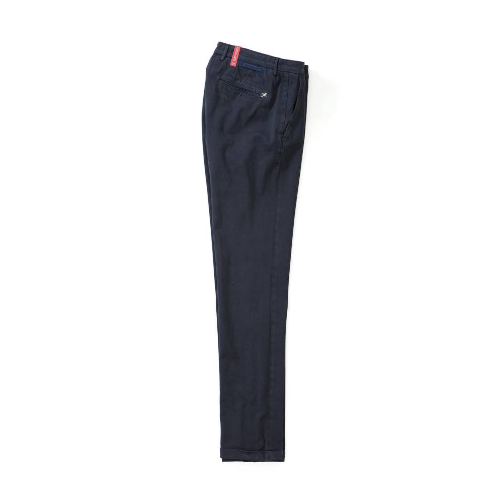 Тёмно-синие мужские брюки чинос Luis Regular марки Sartoria Tramarossa выполнены из мягкого высококачественного хлопка, украшенного строчками в тон и авторской фурнитурой. Силуэт слегка зауженный. Брюки застегиваются на пуговицы. Пояс декорирован сдержанной кожаной нашивкой с логотипом бренда.