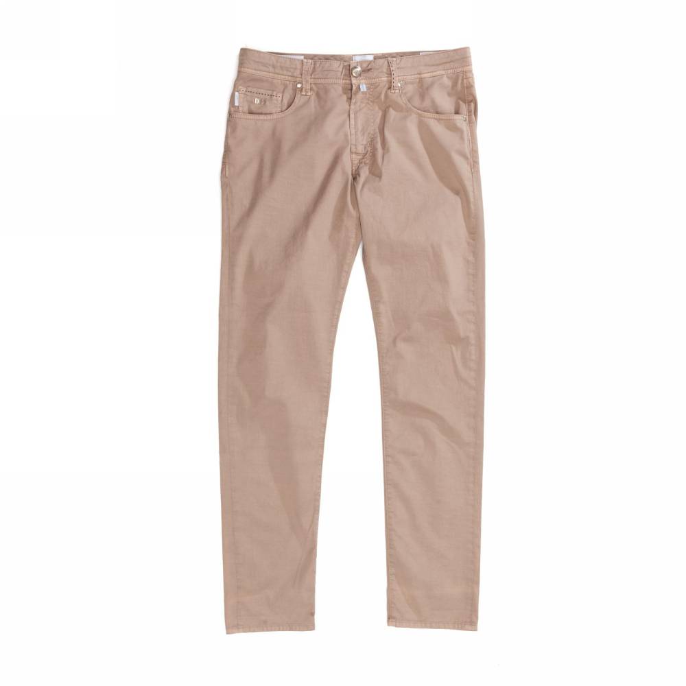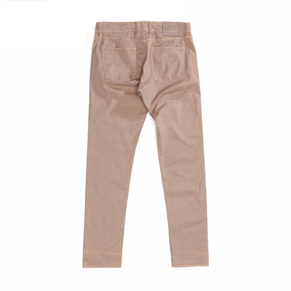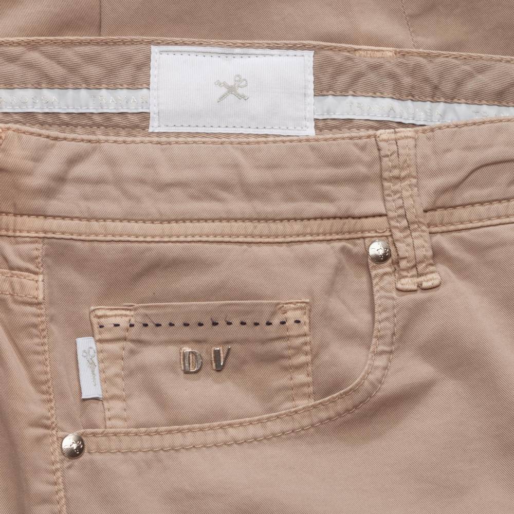 Однотонные светло-бежевые брюки итальянского бренда Tramarossa для весенне-летнего сезона из высококачественного хлопка pima. Модель имеет среднюю посадку, зауженный книзу силуэт и пять традиционных карманов, которыми обычно оснащаются джинсы. Это делает модель схожую с джинсами по стилю и по потенциалу сочетаемости. Брюки застёгиваются на молнию. Ткань: лёгкий инновационный хлопковый габардин с маркировкой G155, который прекрасно адаптируется к фигуре и сохраняет индивидуальную форму. Материал относится к линейке Comfort и содержит в составе 3% эластана. Модель прошита неброскими нитями в тон к ткани, благодаря чему она станет подходящим вариантом для сдержанных повседневных образов.