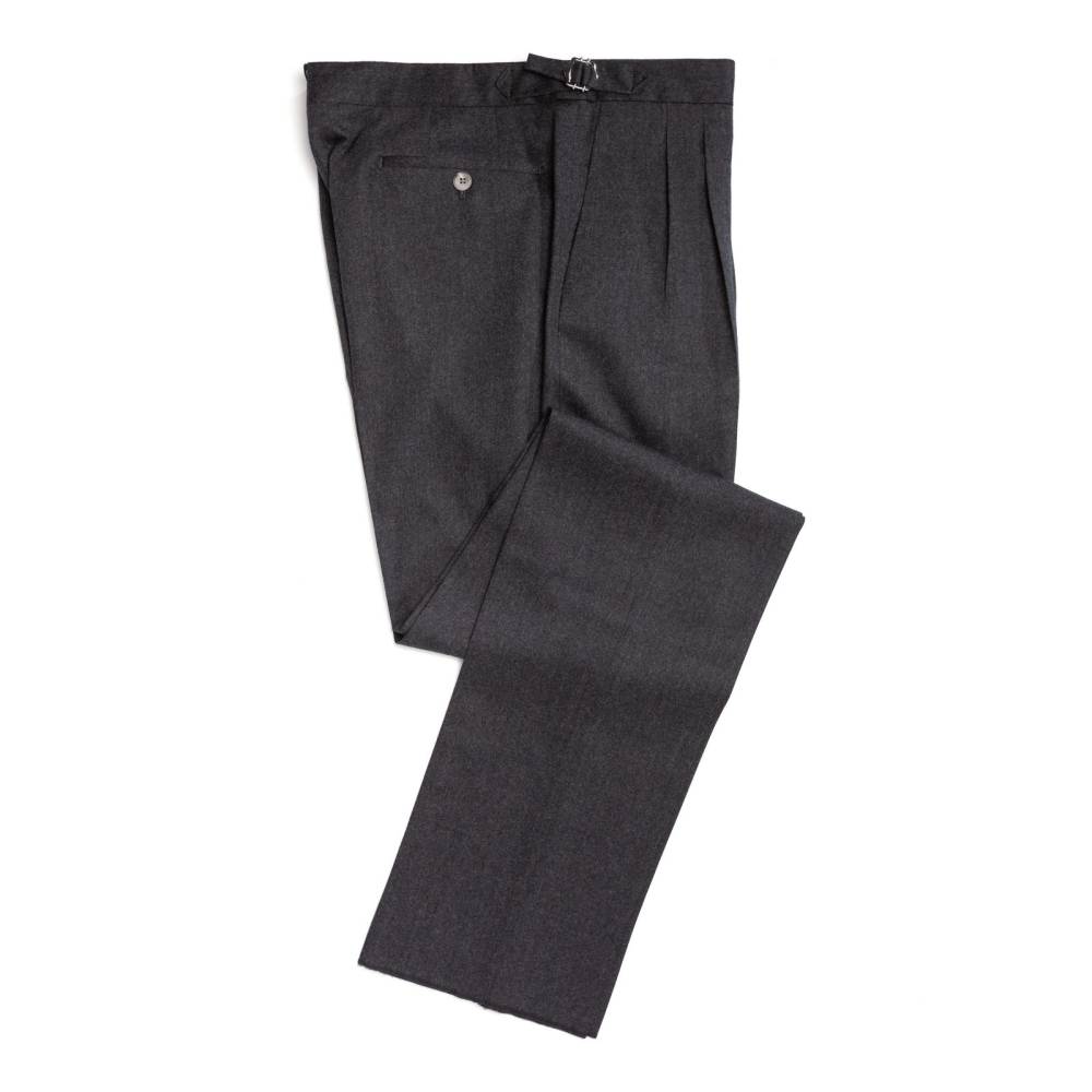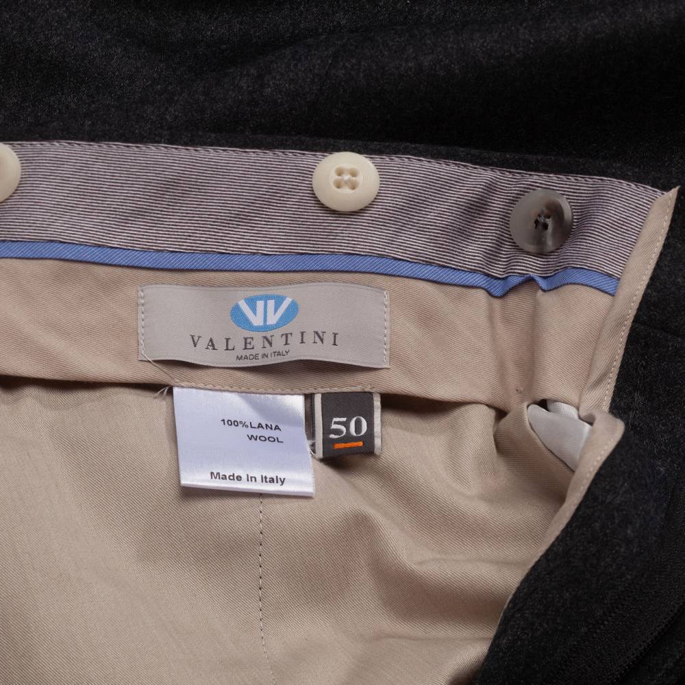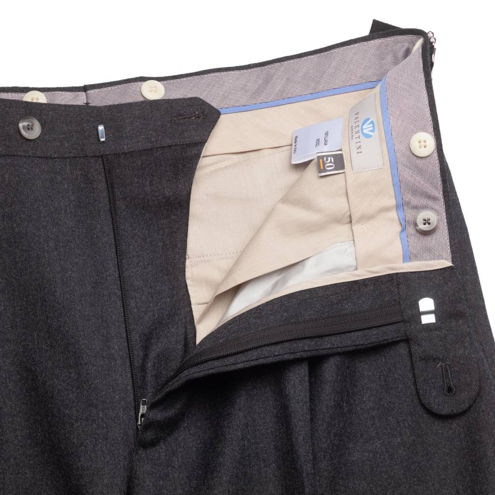 Классические мужские брюки итальянского бренда Valentini. Полностью изготовлены в Италии из мягкой шерстяной фланели тёмно-серого цвета. Ткань весом 300 г превосходно сохраняет тепло, остается приятной на ощупь и идеально подойдет для осенне-зимнего гардероба. Слегка зауженный книзу крой дополнен двойными складками (защипами) для комфорта и свободы движения. Посадка выше средней, с акцентом на комфорт и классические пропорции. Низ брюк с необработанным краем, что является признаком высокого класса Sartorial. Оснащены боковыми регуляторами (side adjusters), позволяют подогнать талию без использования ремня. Это обеспечивает более аккуратный, элегантный и комфортный вид, характерный для классического пошива bespoke. С внутренней стороны талии вшиты шесть пуговиц под подтяжки. Брюки застегиваются на молнию и пуговицы, предусмотрены два боковых кармана и два сзади.