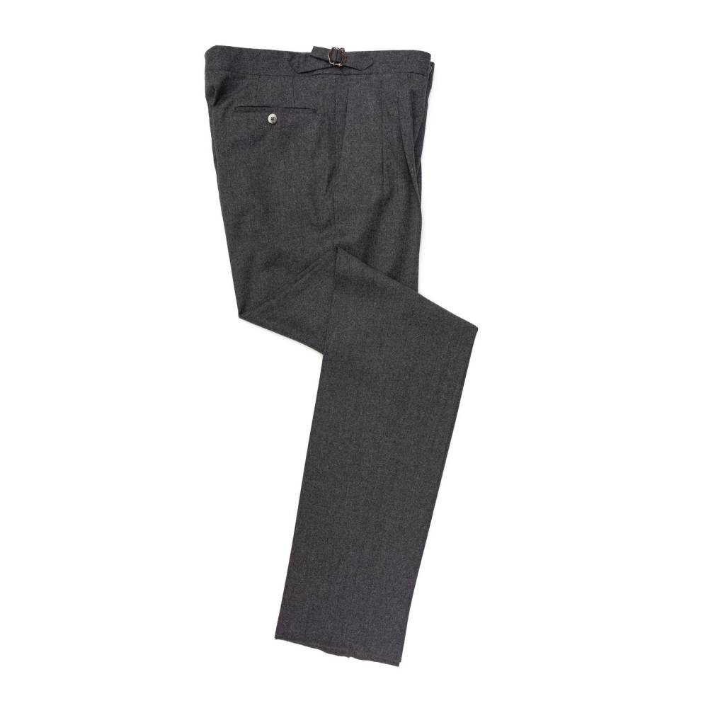 Классические мужские брюки итальянского бренда Valentini. Полностью изготовлены в Италии из мягкой шерстяной фланели серого цвета. Ткань весом 300 г превосходно сохраняет тепло, остается приятной на ощупь и идеально подойдет для осенне-зимнего гардероба. Слегка зауженный книзу крой дополнен двойными складками (защипами) для комфорта и свободы движения. Посадка выше средней, с акцентом на комфорт и классические пропорции. Низ брюк с необработанным (unhemmed) краем, что является признаком высокого класса Sartorial. Оснащены боковыми регуляторами (side adjusters), позволяют подогнать талию без использования ремня. Это обеспечивает более аккуратный, элегантный и комфортный вид, характерный для классического пошива bespoke. Брюки застегиваются на молнию и пуговицы. Имеют два наклонных боковых кармана, два прорезных задних кармана и скрытый карман для монет у пояса.