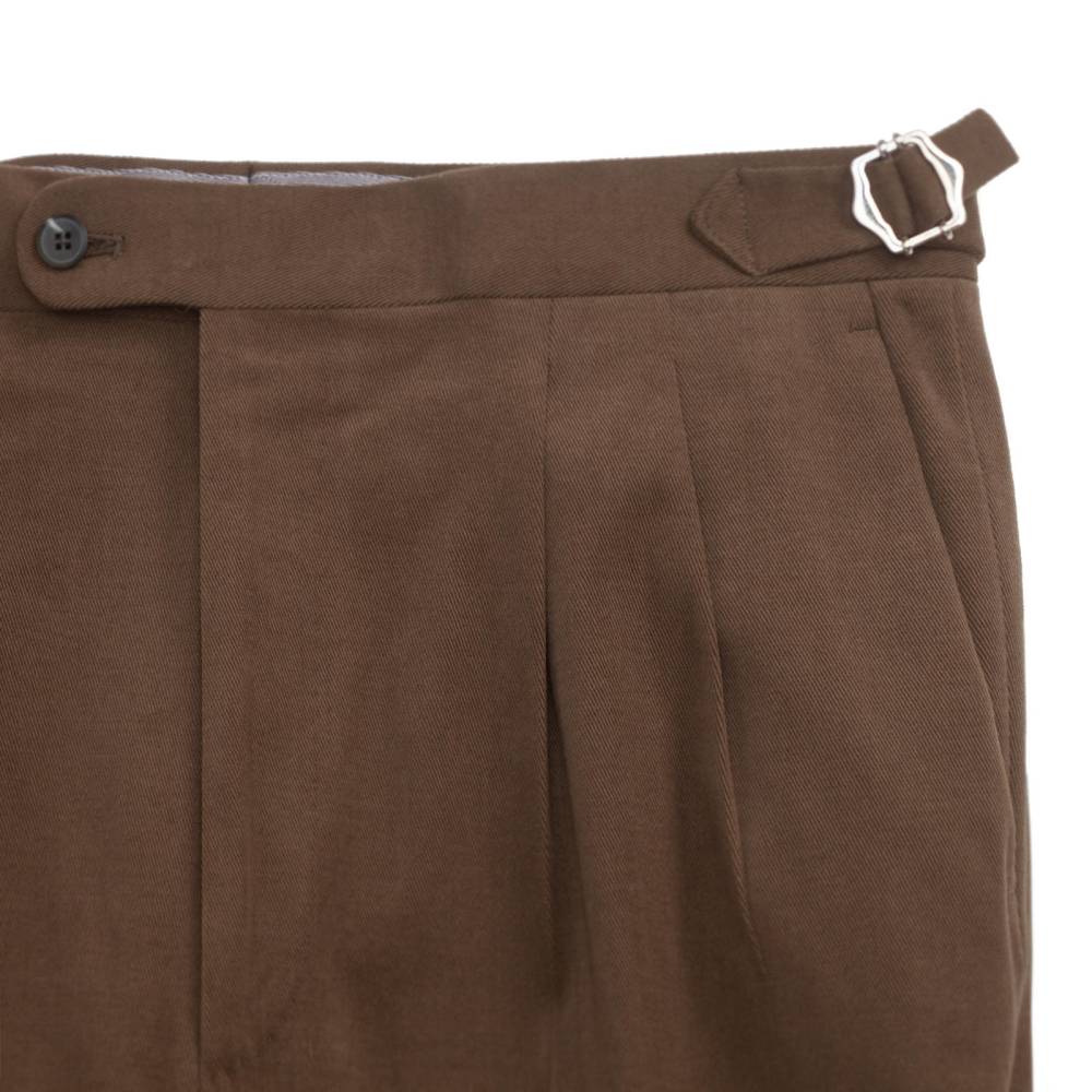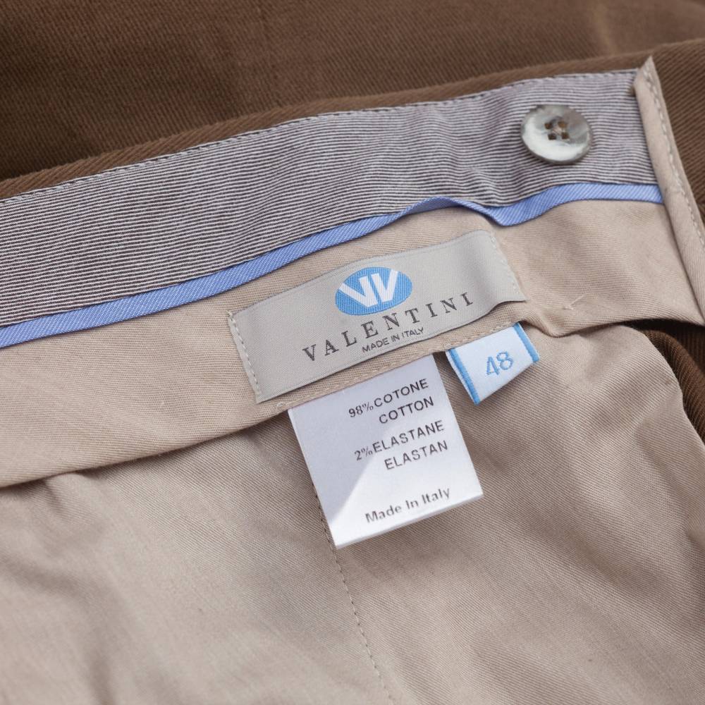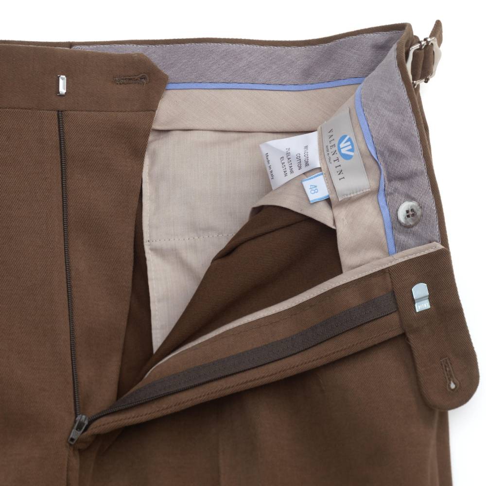 Классические мужские брюки итальянского бренда Valentini. Полностью изготовлены в Италии из прочного начёсанного хлопкового твила (Brushed Twill) с эластаном цвета хаки. Плотная ткань весом 430 г отлично пропускает воздух и сохраняет тепло, идеальна для осени, мягкой зимы и весны. Слегка зауженный книзу крой дополнен двойными складками (защипами) для комфорта. Посадка выше средней, с акцентом на комфорт и классические пропорции. Низ брюк с необработанным (unhemmed) краем, что является признаком высокого класса Sartorial. Оснащены боковыми регуляторами (side adjusters), позволяют подогнать талию без использования ремня. Это обеспечивает более аккуратный, элегантный и комфортный вид, характерный для классического пошива bespoke. С внутренней стороны талии вшиты шесть пуговиц под подтяжки. Брюки застегиваются на молнию и пуговицы, имеют два боковых кармана и два сзади.