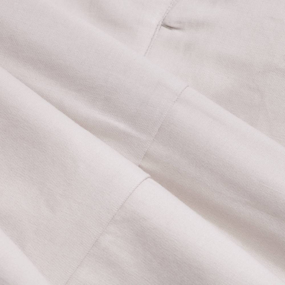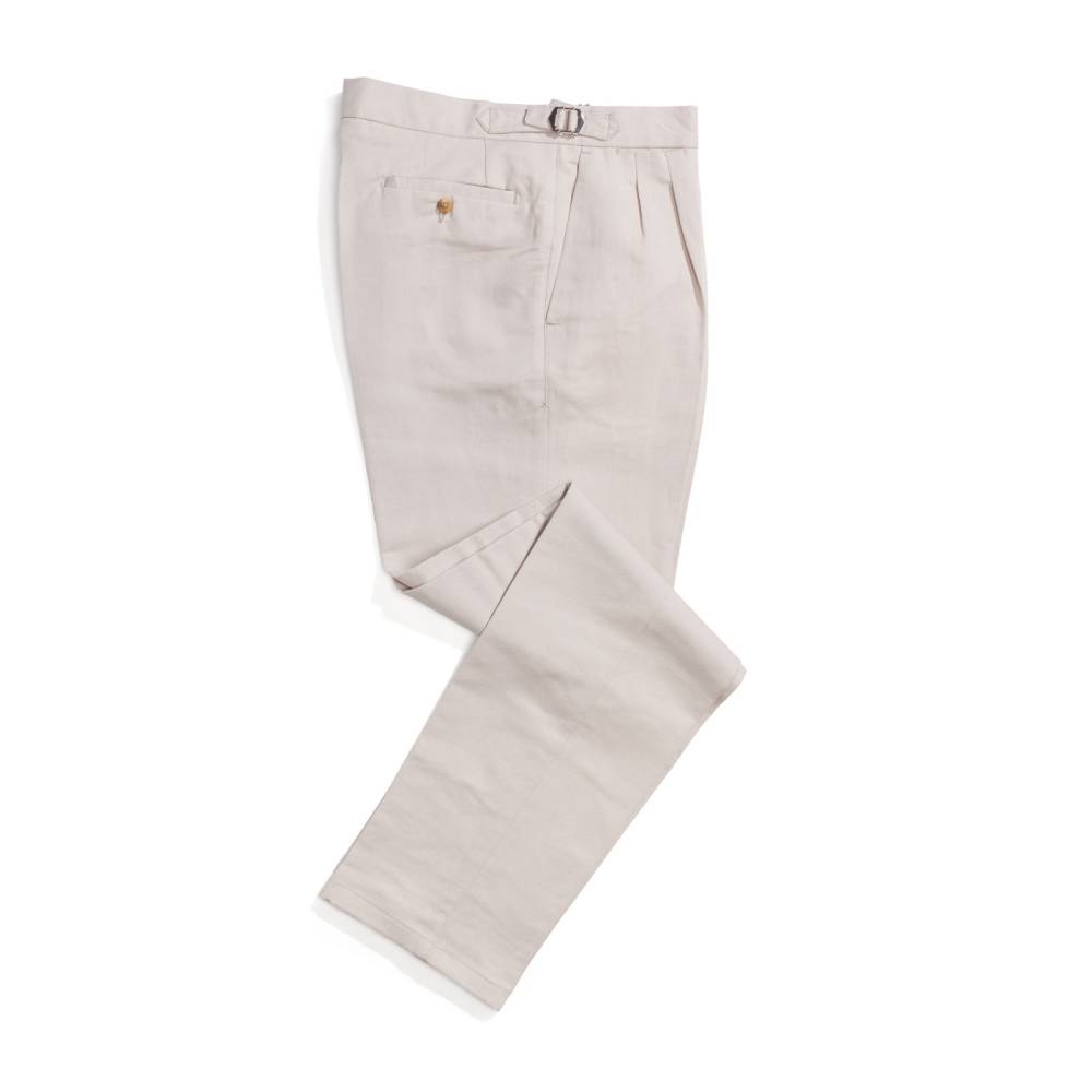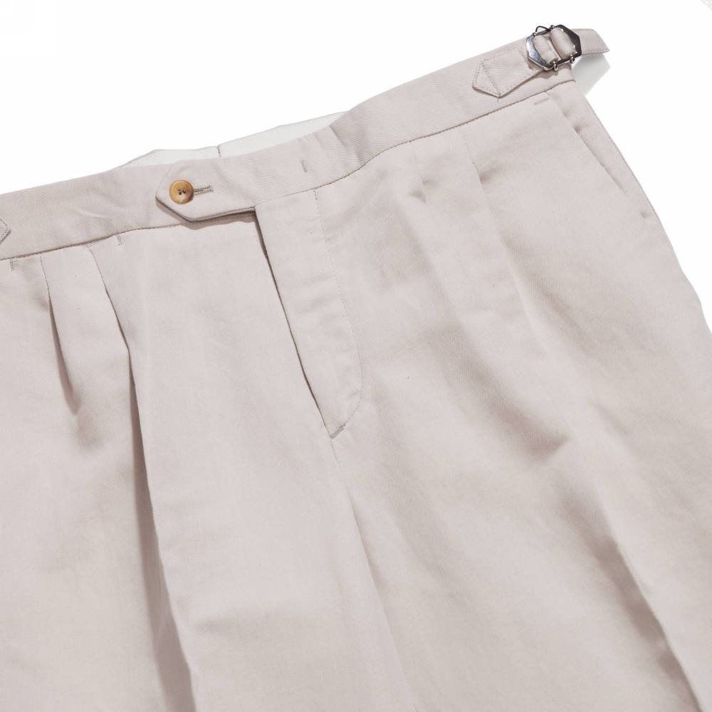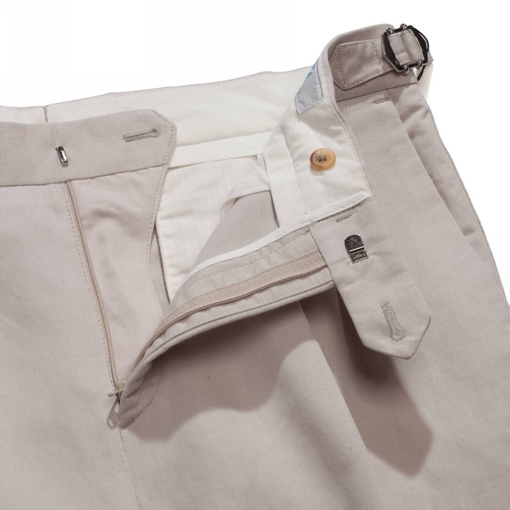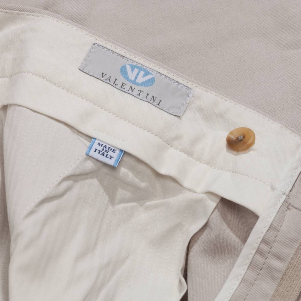 Лёгкие классические мужские брюки Valentini молочного цвета со стрелками и двумя защипами на талии. Модель свободного силуэта, но штанины чуть сужаются к щиколотке. Выполнена из тонкой смесовой ткани (вес ткани 290 г), в состав которой входят лён и хлопок. Конструкция пояса создана под подтяжки: с внутренней стороны вшиты шесть пуговиц для петель от подтяжек. Также брюки можно носить только затянув ремешки по бокам. Брюки застёгиваются на молнию и пуговицы. Два кармана по бокам и два сзади. Средняя посадка в талии. Стандартная длина брюк рассчитана на высокий рост, но сохраняется возможность для укорачивания.