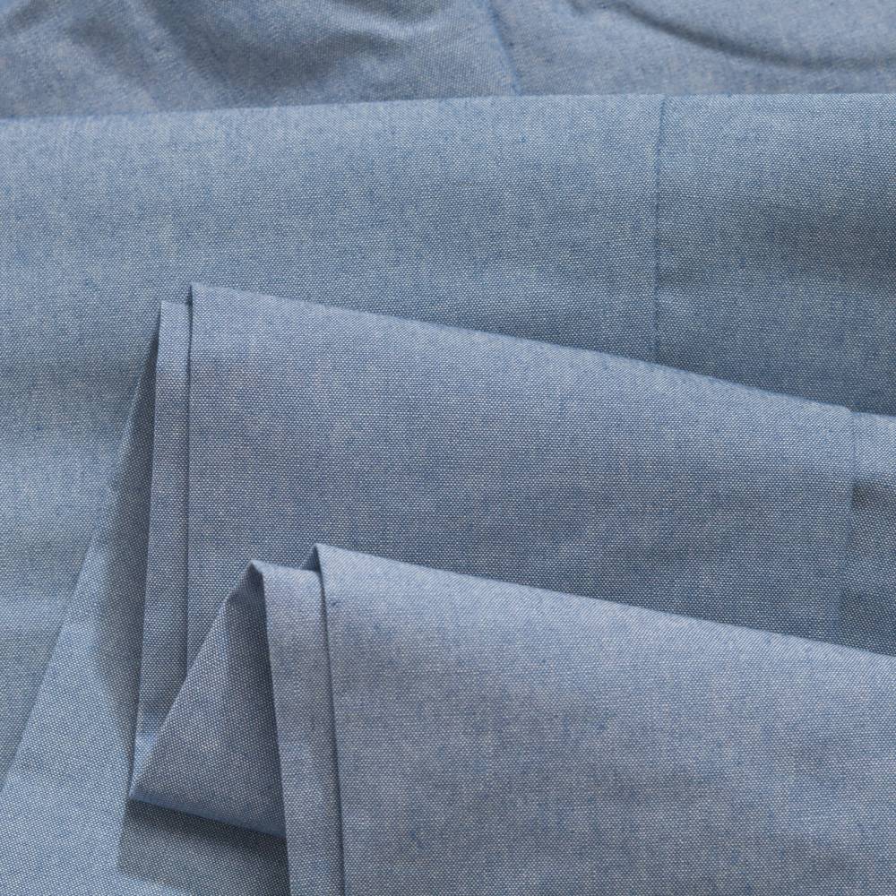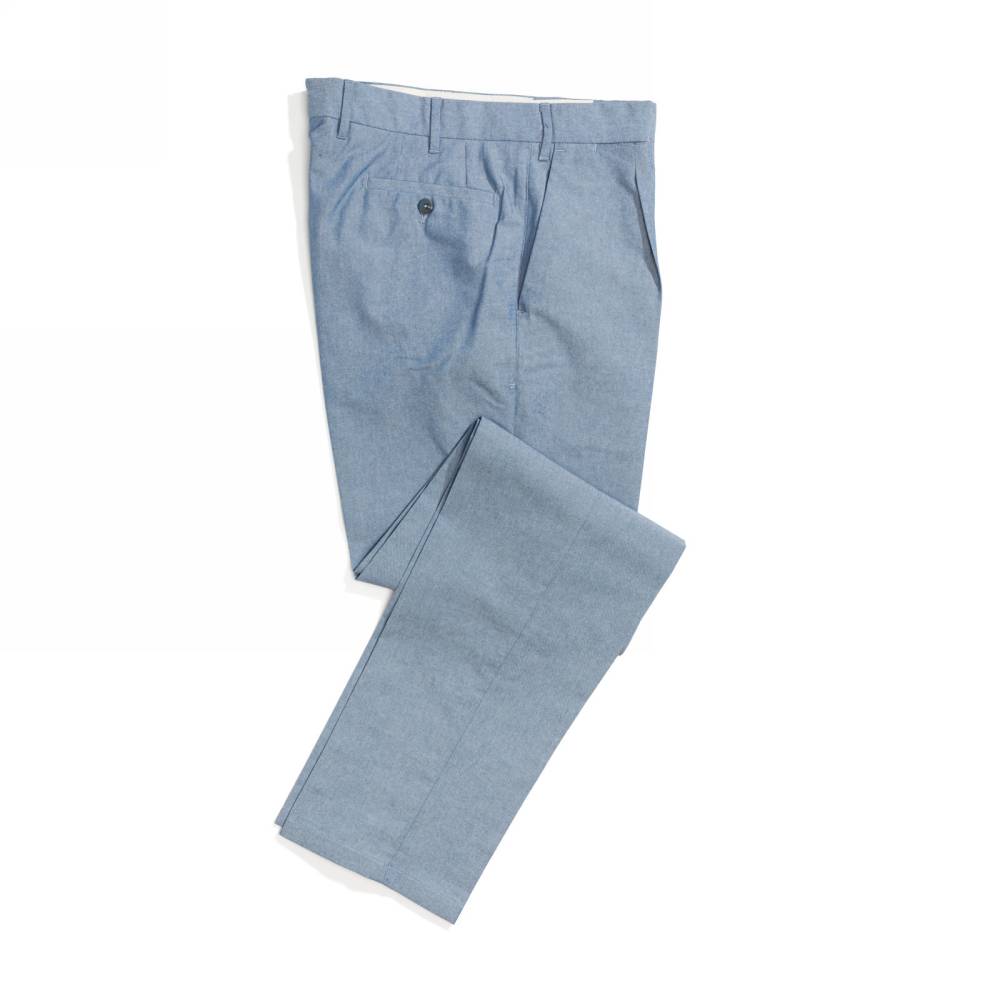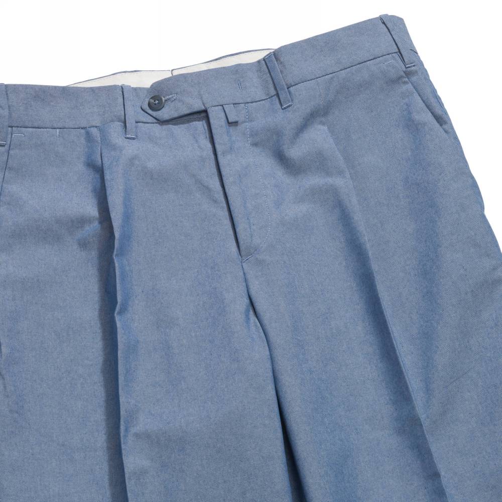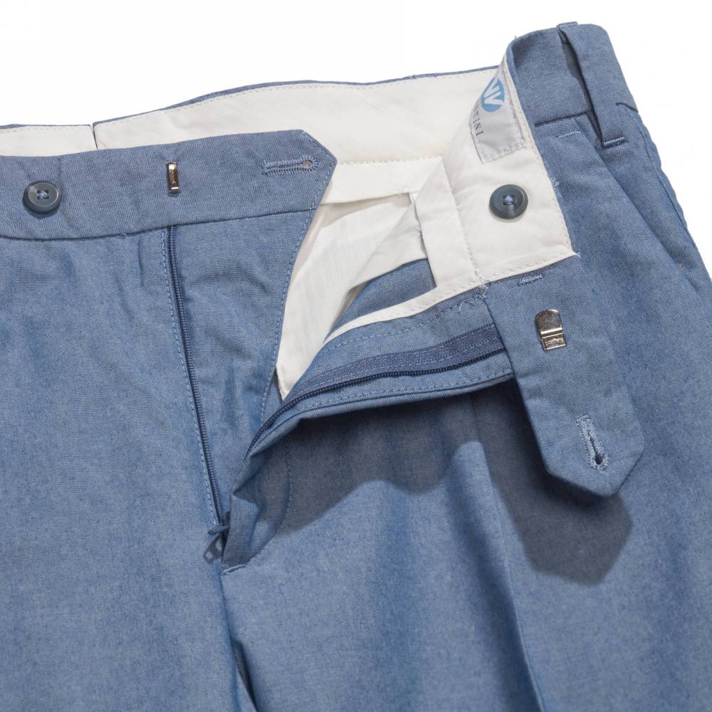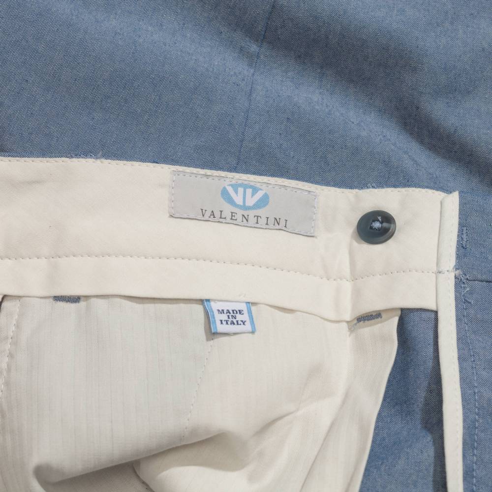 Лёгкие классические мужские брюки Valentini со стрелками и защипами на талии. Модель свободного силуэта, но штанины чуть сужаются к щиколотке. Выполнена из светло-синего хлопка шамбре, который по фактуре напоминает деним (вес ткани 260 г). Конструкция пояса создана под ремень. Брюки застёгиваются на молнию и пуговицы. Два кармана по бокам и два сзади. Средняя посадка в талии. Стандартная длина брюк рассчитана на высокий рост, но сохраняется возможность для укорачивания.