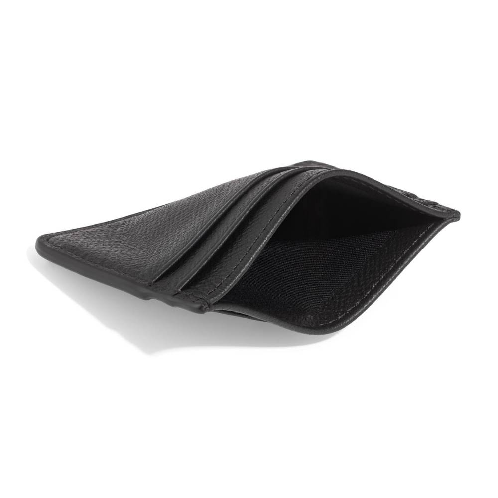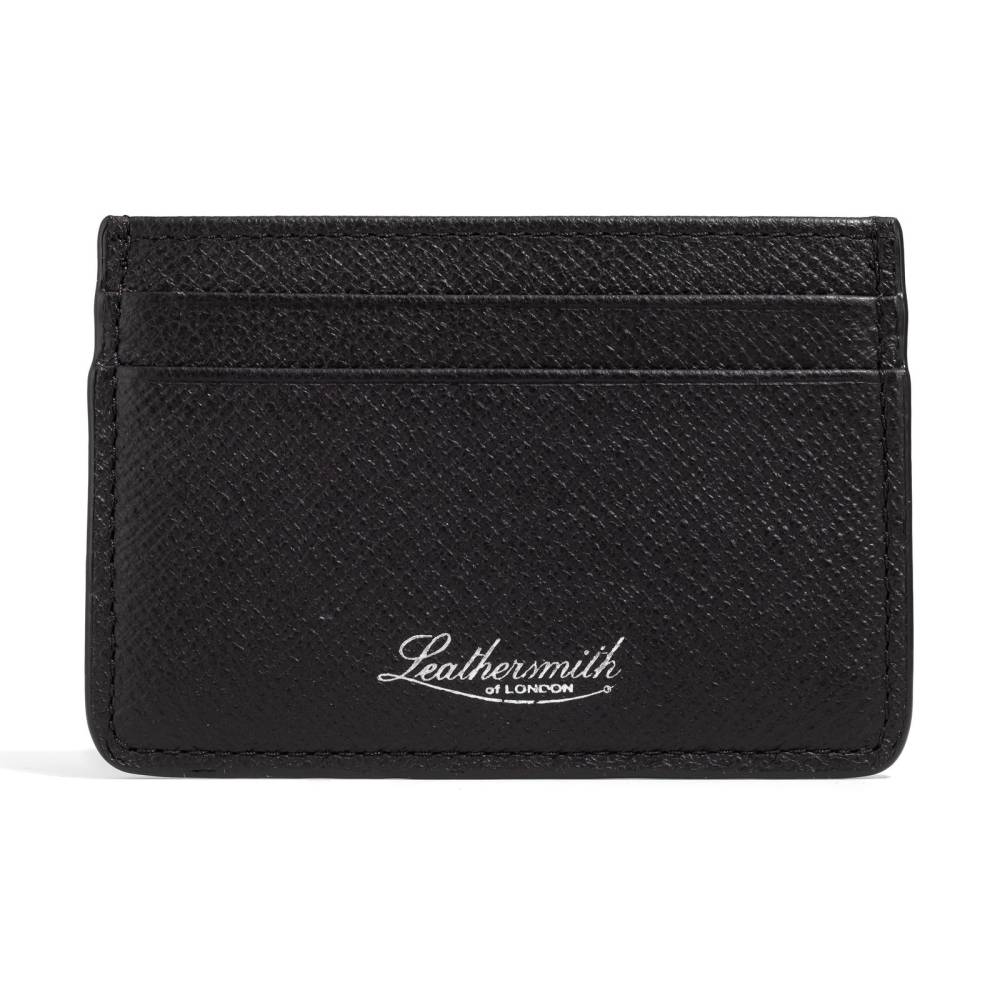 Классический двухсторонний чехол для банковских карт от английской мануфактуры Leathersmith of London. Изготовлен из натуральной зернистой телячьей кожей Rutland черного цвета, дополнен хлопковой подкладкой внутри. Чехол оснащен четырьмя карманами для карт (по два с каждой стороны), а также одним удобным открытым карманом по центру.