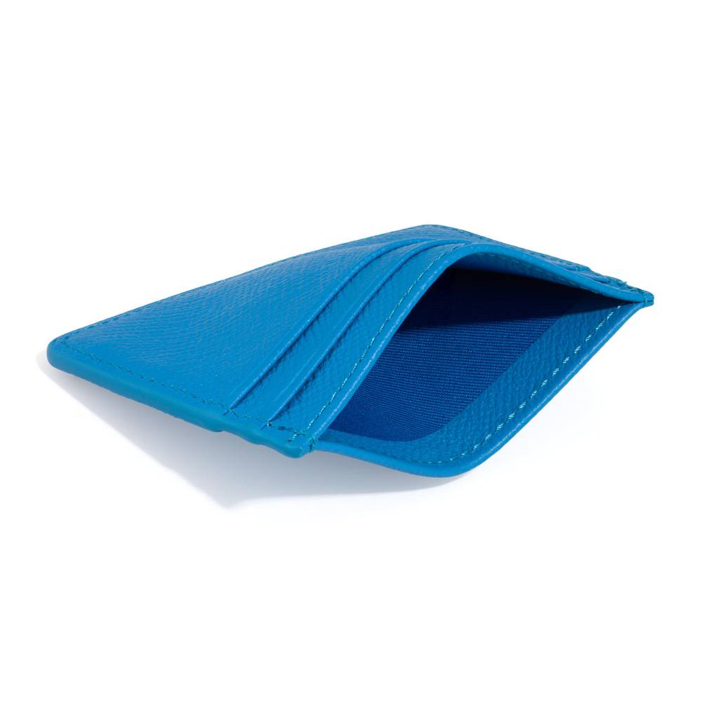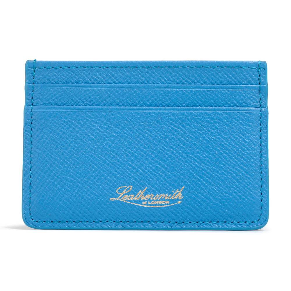 Классический двухсторонний чехол для банковских карт от английской мануфактуры Leathersmith of London. Изготовлен из натуральной зернистой телячьей кожей Rutland. Выполнен в фирменном для бренда лазурно-голубом цвете Capri. Дополнен хлопковой подкладкой внутри. Чехол оснащен четырьмя карманами для карт (по два с каждой стороны), а также одним удобным открытым карманом по центру.