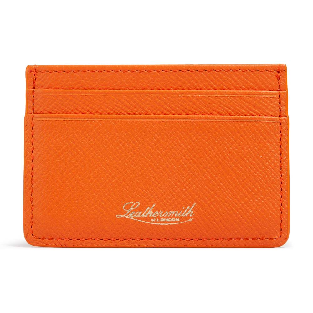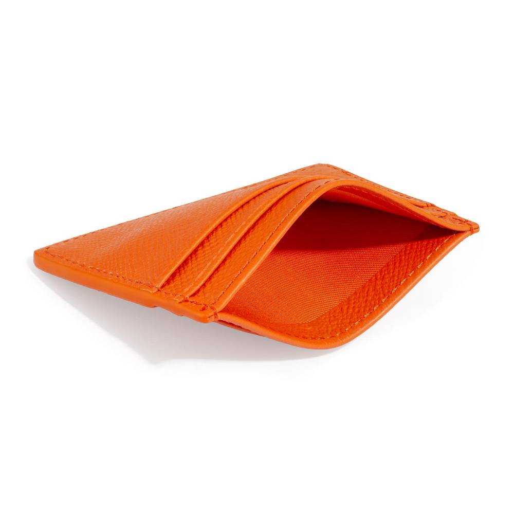 Классический двухсторонний чехол для банковских карт от английской мануфактуры Leathersmith of London. Изготовлен из натуральной зернистой телячьей кожей Rutland оренжевого цвета, дополнен хлопковой подкладкой внутри. Чехол оснащен четырьмя карманами для карт (по два с каждой стороны), а также одним удобным открытым карманом по центру.
