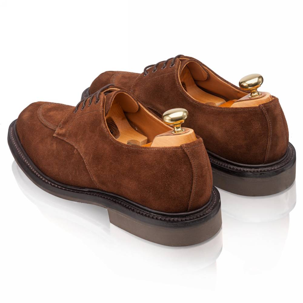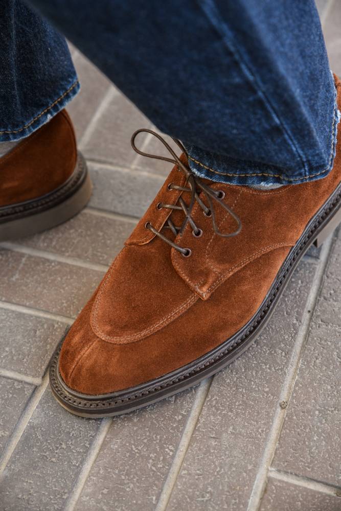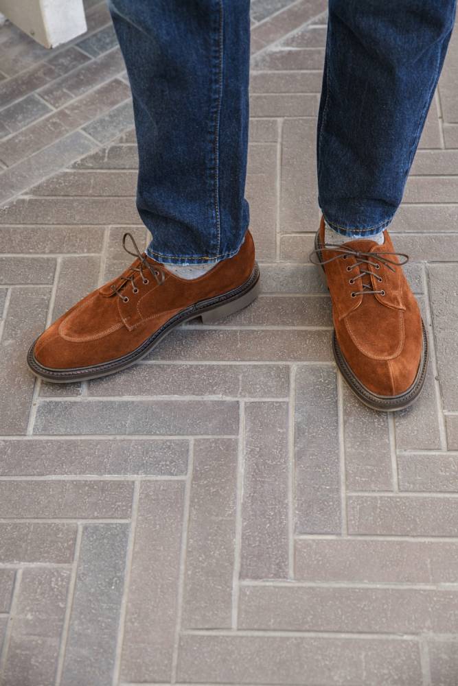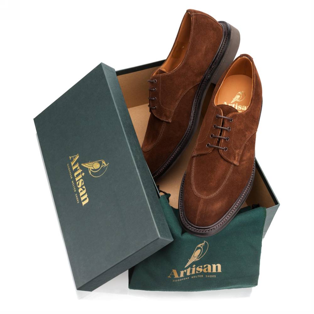 Дерби Artisan в норвежском стиле выполнены из качественной ворсистой замши британской дубильни Charles F. Stead. Подкладка из кожи растительного дубления. Модель имеет усиленный рант с окантовкой, который добавляет подошве дополнительную защиту от влаги. Пара оснащена резиновой подошвой Itshide с неглубоким протектором. Конструкция Goodyear Welted.