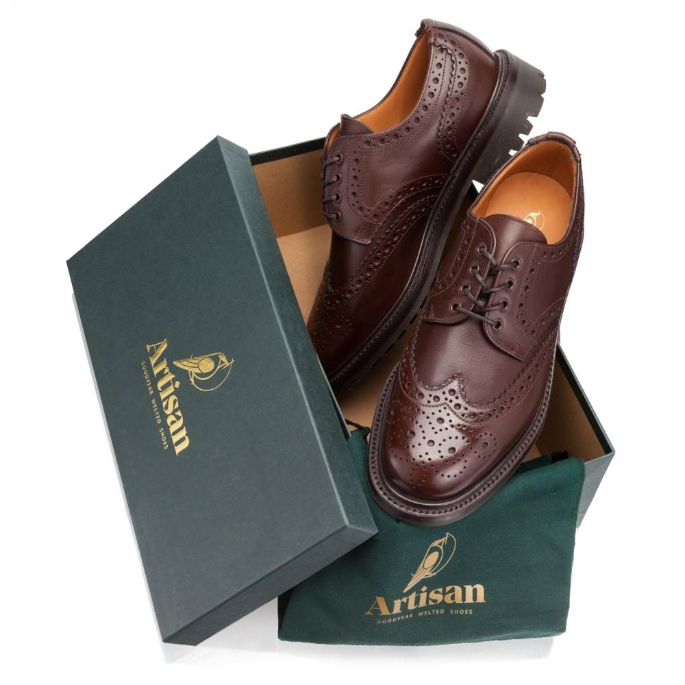 Броги тёмно-коричневого цвета Artisan выполнены из плотной телячьей кожи, обработанной воском. Подкладка из кожи растительного дубления. Модель имеет усиленный рант с окантовкой, который добавляет подошве дополнительную защиту от влаги. Броги оснащены массивной резиновой подошвой Itshide с узнаваемым армейским протектором Commando. Конструкция Goodyear Welted.