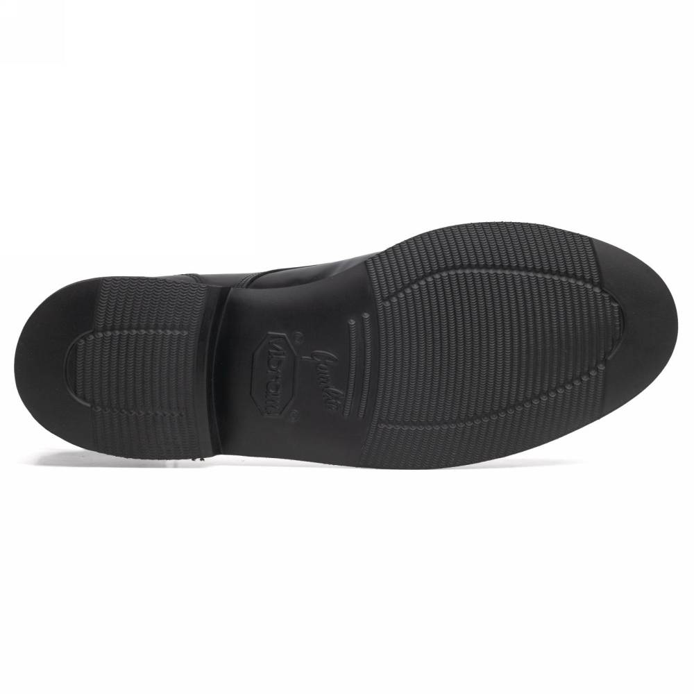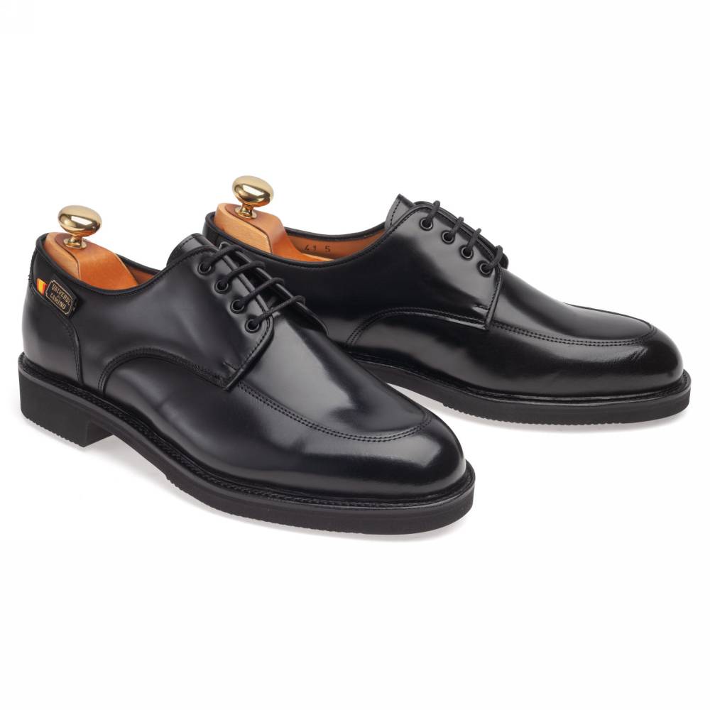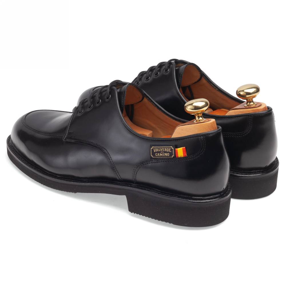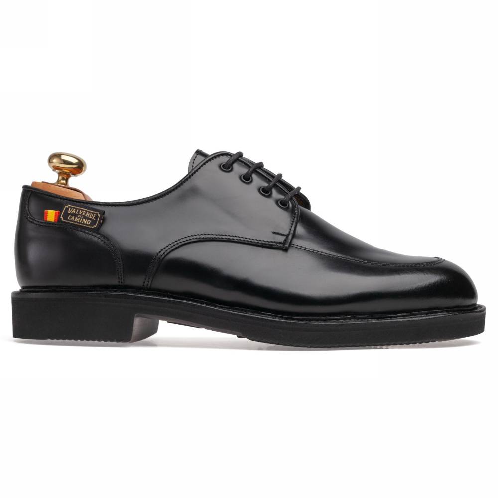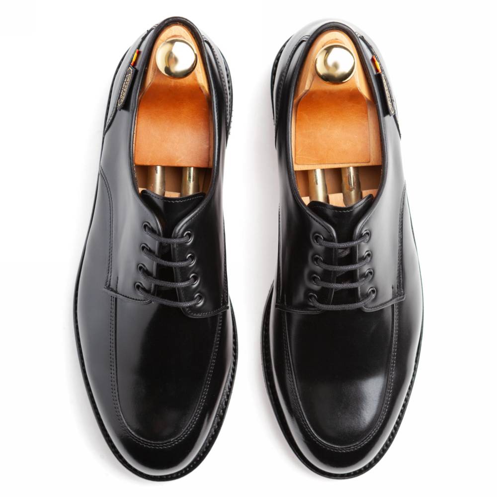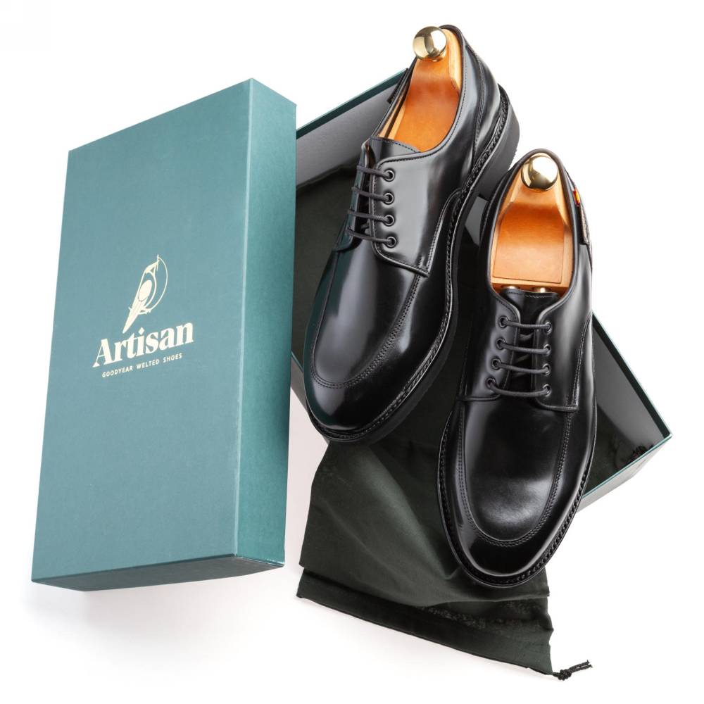 Повседневные дерби Artisan Apron на облегчённой резиновой подошве Vibram. Верх выполнен из плотной полированной телячьей кожи чёрного цвета, которая устойчива к слякоти и грязи. Внутри цельная стелька из тонкой мягкой кожи. Сбоку модель украшена фирменным патчем с названием испанского городка Valverde del Camino в Андалусии, где была создана пара. Конструкция Goodyear Welted.