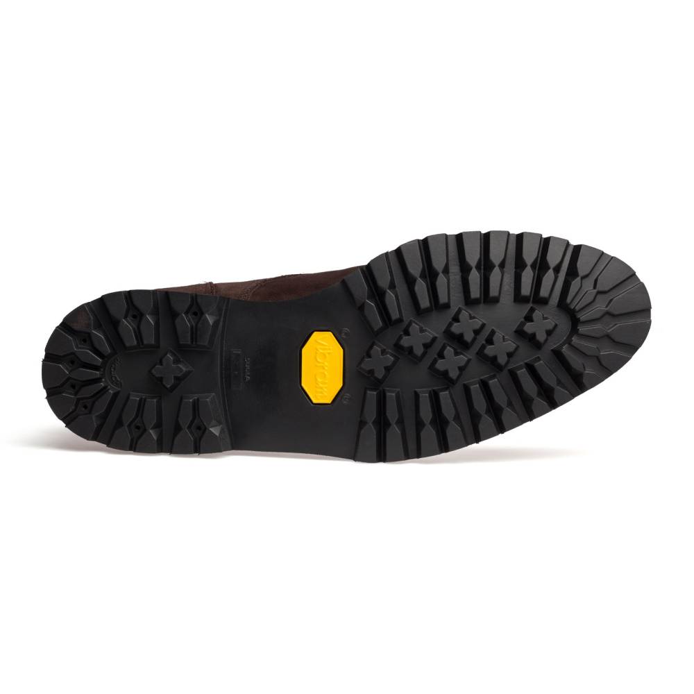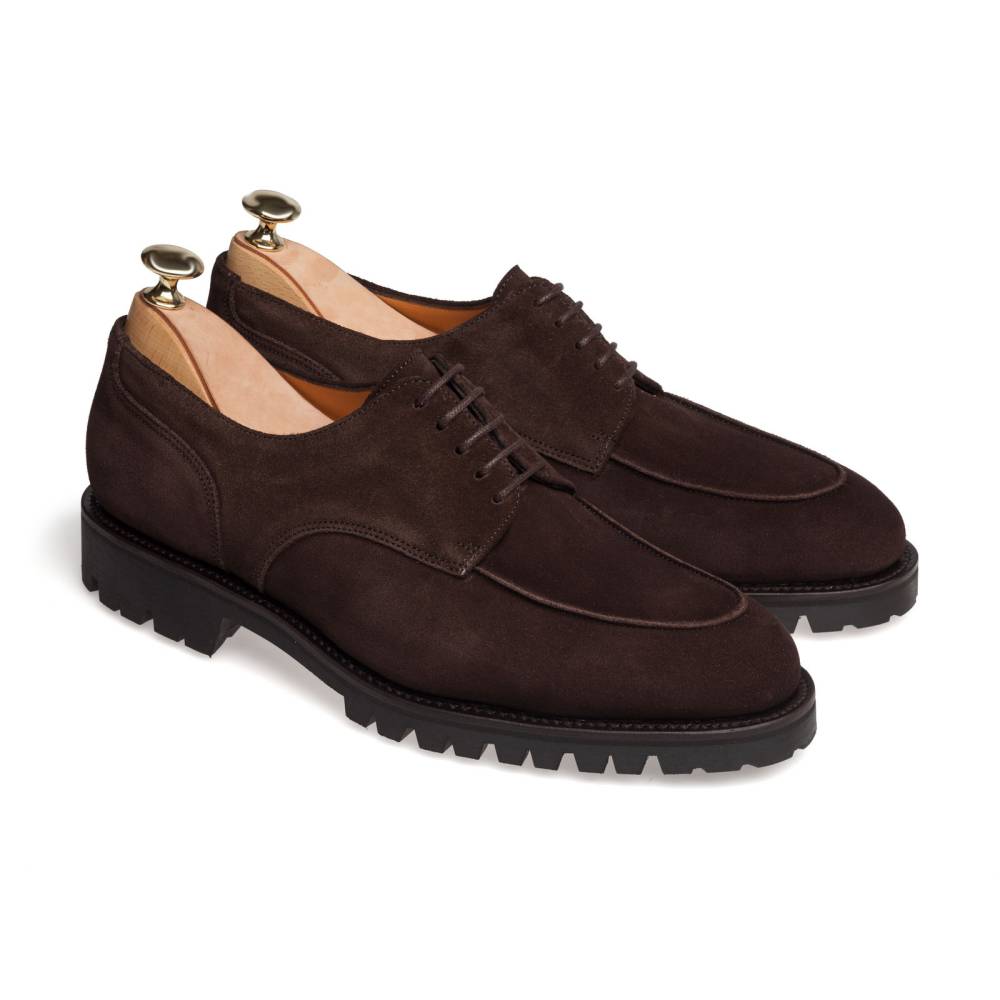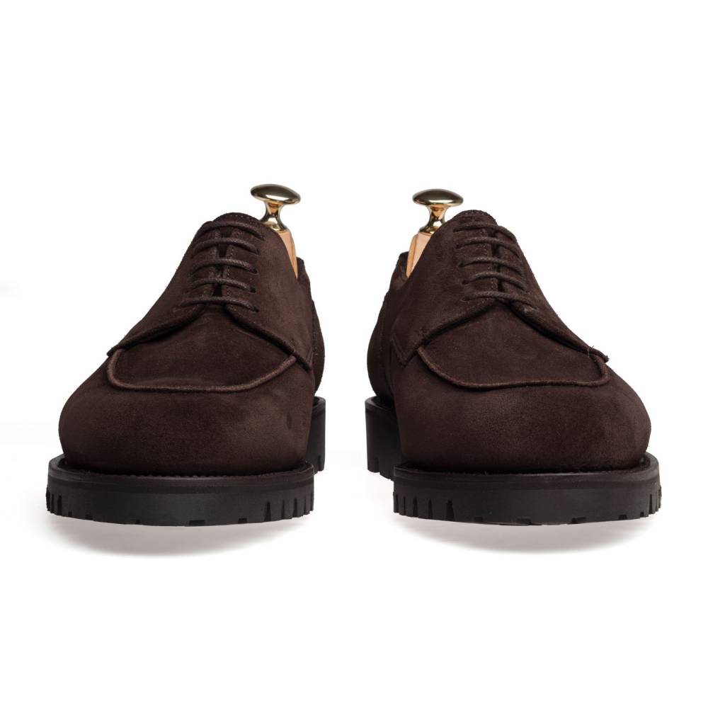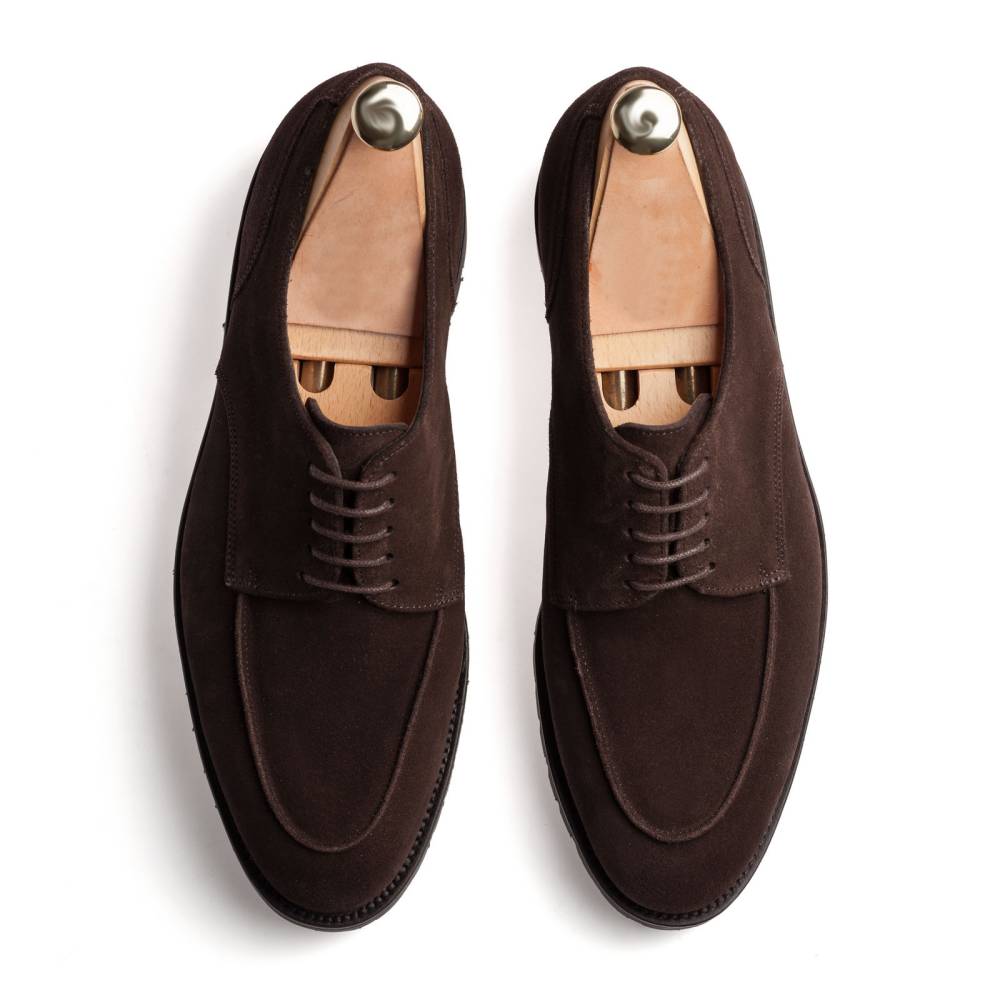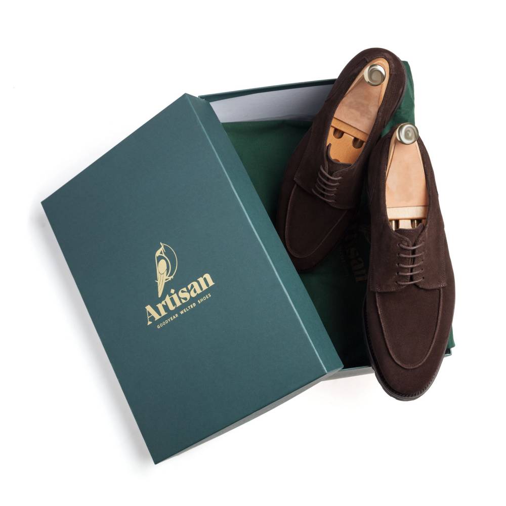 Неформальные дерби испанского бренда Artisan для повседневного гардероба. Отлично подойдут для города осенью и весной. Верх выполнен из мягкой замши тёмно-коричневого цвета. Внутри цельная стелька из тонкой мягкой кожи. Модель имеет прочную резиновую подошву итальянского бренда Vibram с протектором. Все строчки верха и швы ранта выполнены с особой аккуратностью, согласно философии бренда. Конструкция Goodyear Welted.