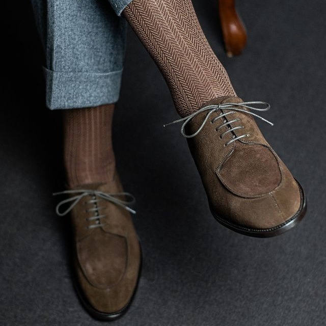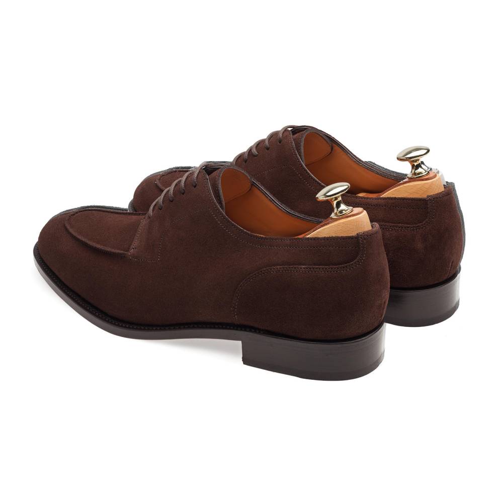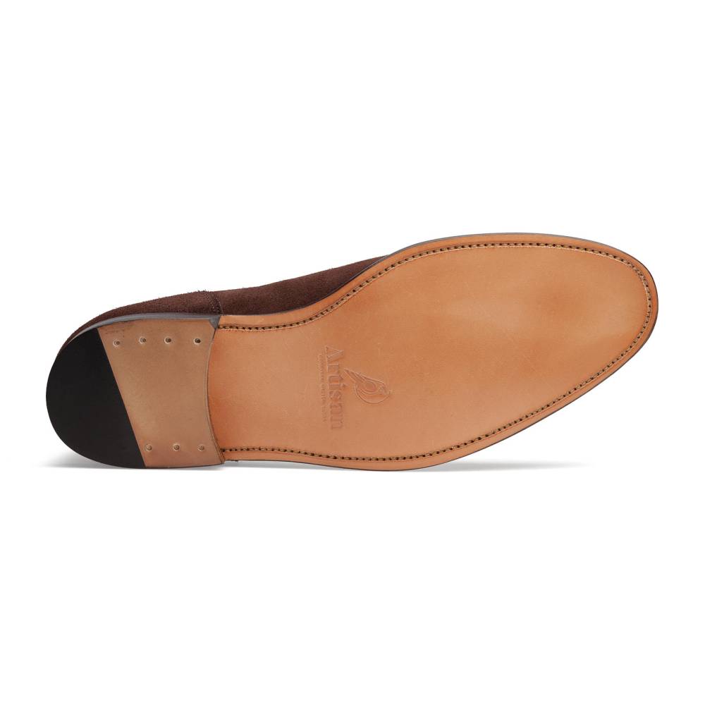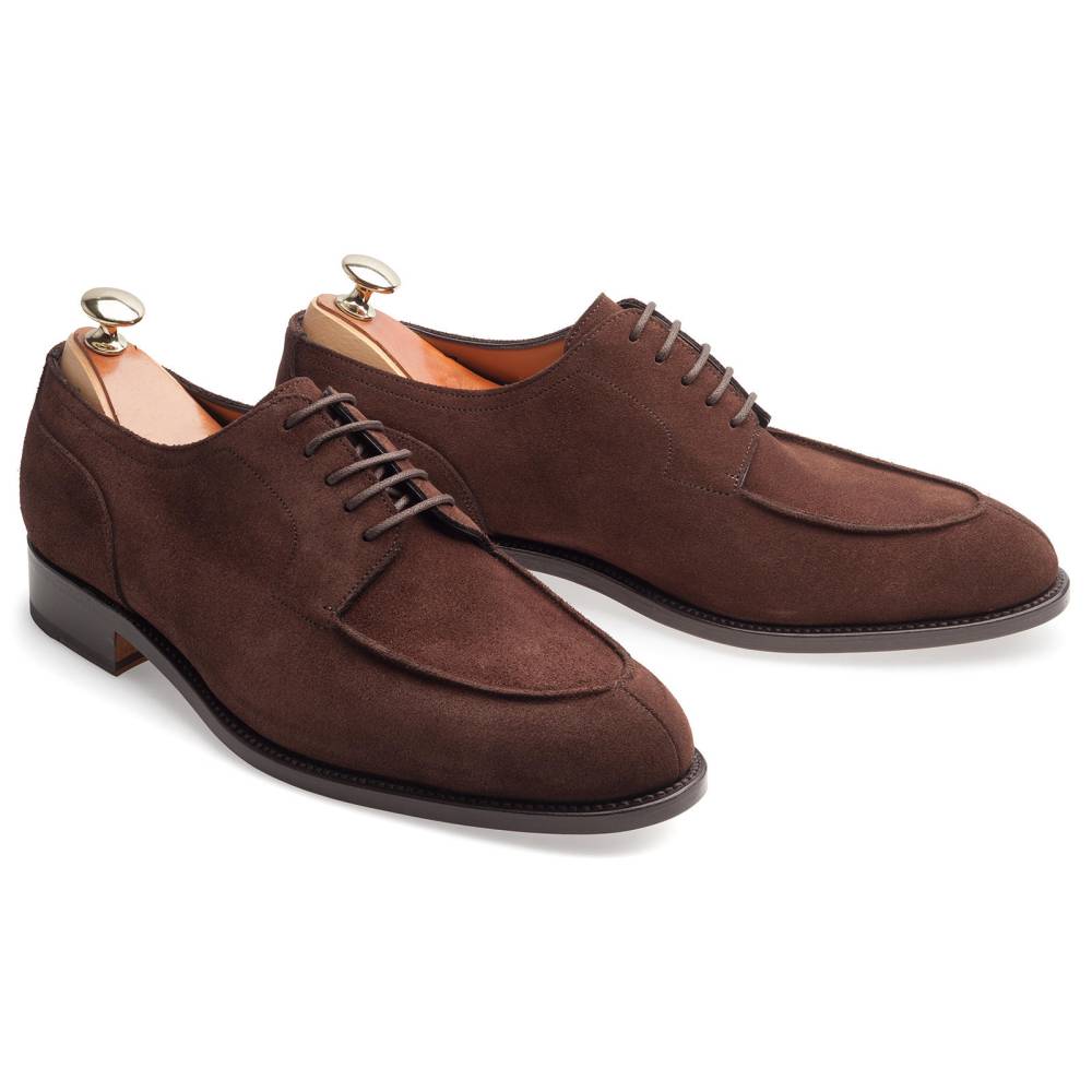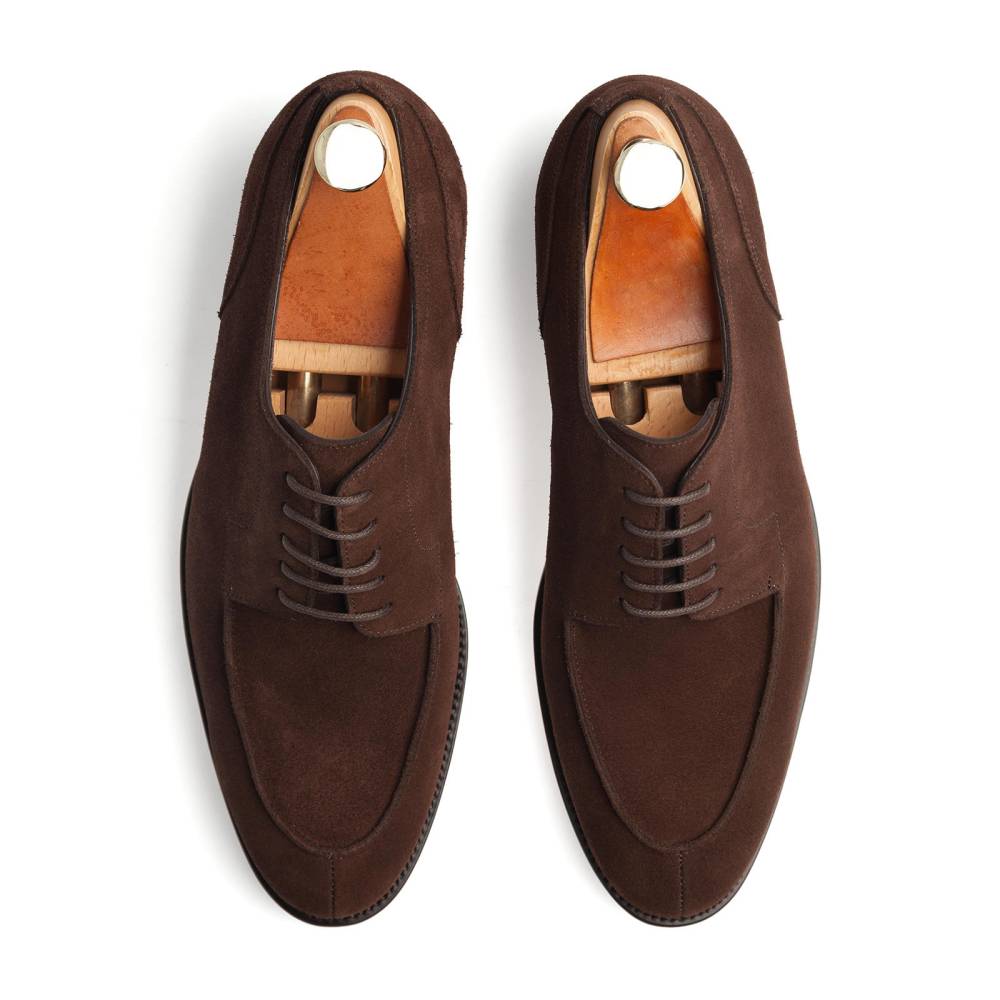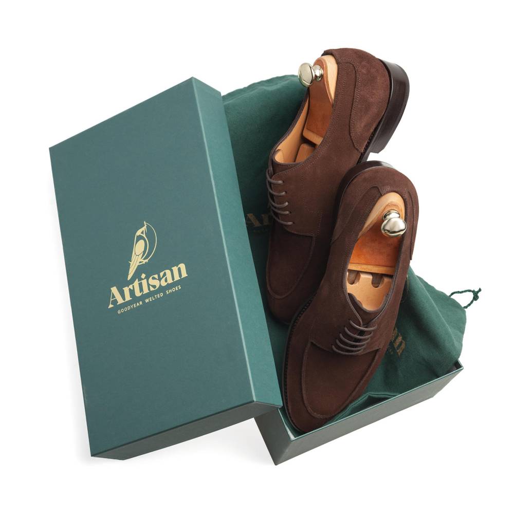 Неформальные дерби Artisan с норвежским мысом (split toe derby) выполнены из мягкой бархатистой замши тёмно-коричневого цвета. Внутри цельная стелька из тонкой мягкой кожи. Кожаная подошва. Все строчки верха и швы ранта выполнены с особой аккуратностью, согласно философии бренда. Конструкция Goodyear Welted.