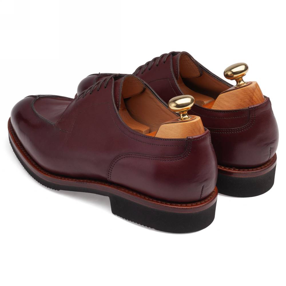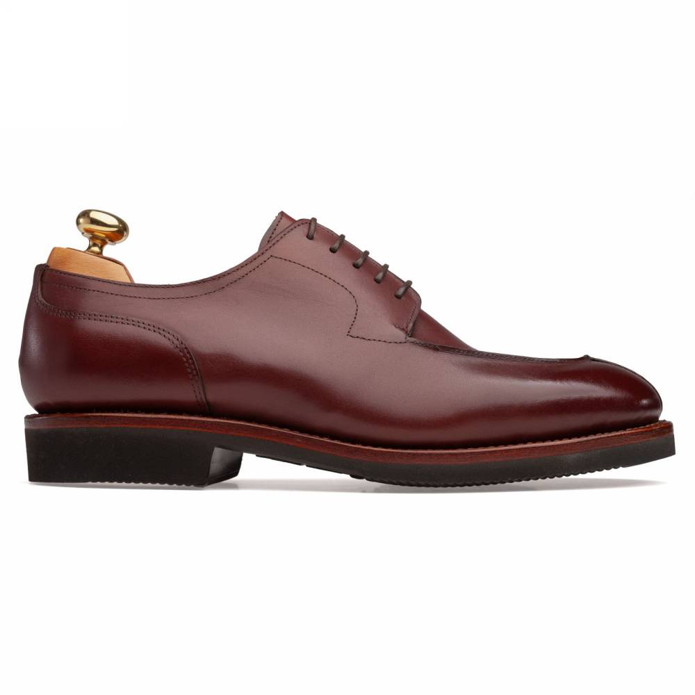Неформальные дерби Artisan с норвежским мысом (split toe derby) выполнены из плотной телячьей кожи бордового цвета. Внутри цельная стелька из тонкой мягкой кожи растительного дубления. Пара оснащена облегчённой резиновой подошвой Vibram Gumlight. Конструкция Goodyear Welted.