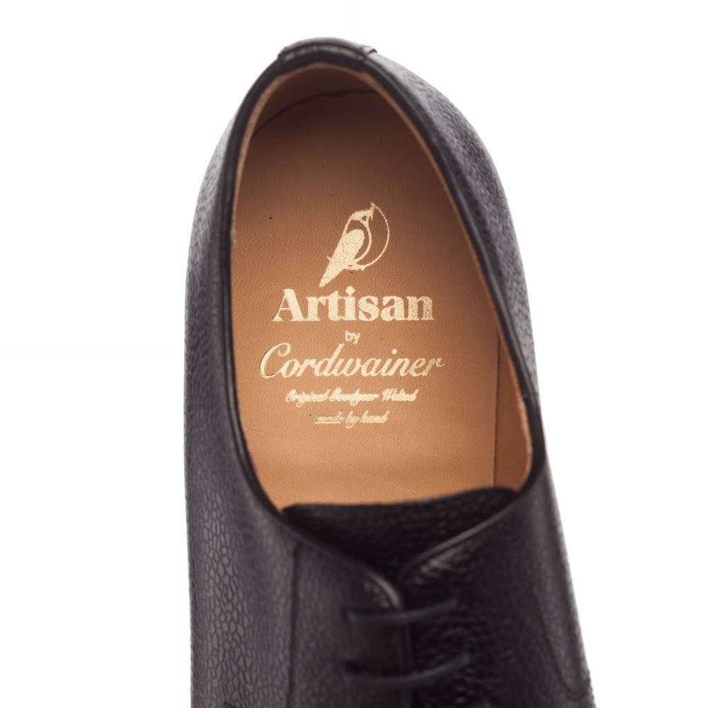 Лаконичные чёрные дерби бренда Artisan в норвежском стиле (англ. norwegian spilt-toe derbies). Модель изготовлена по специальному заказу на испанской фабрике Cordwainer в городе Альманса – центре обувной промышленности Испании. Верх сшит из плотной телячьей кожи с зернистой фактурой. Подкладка также выполнена из натуральной кожи. На данную пару установлена практичная резиновая подошва английской фирмы Dainite. Конструкция Goodyear Welted.