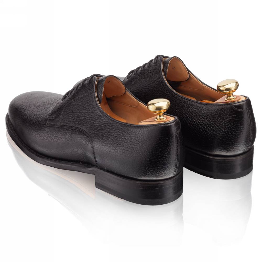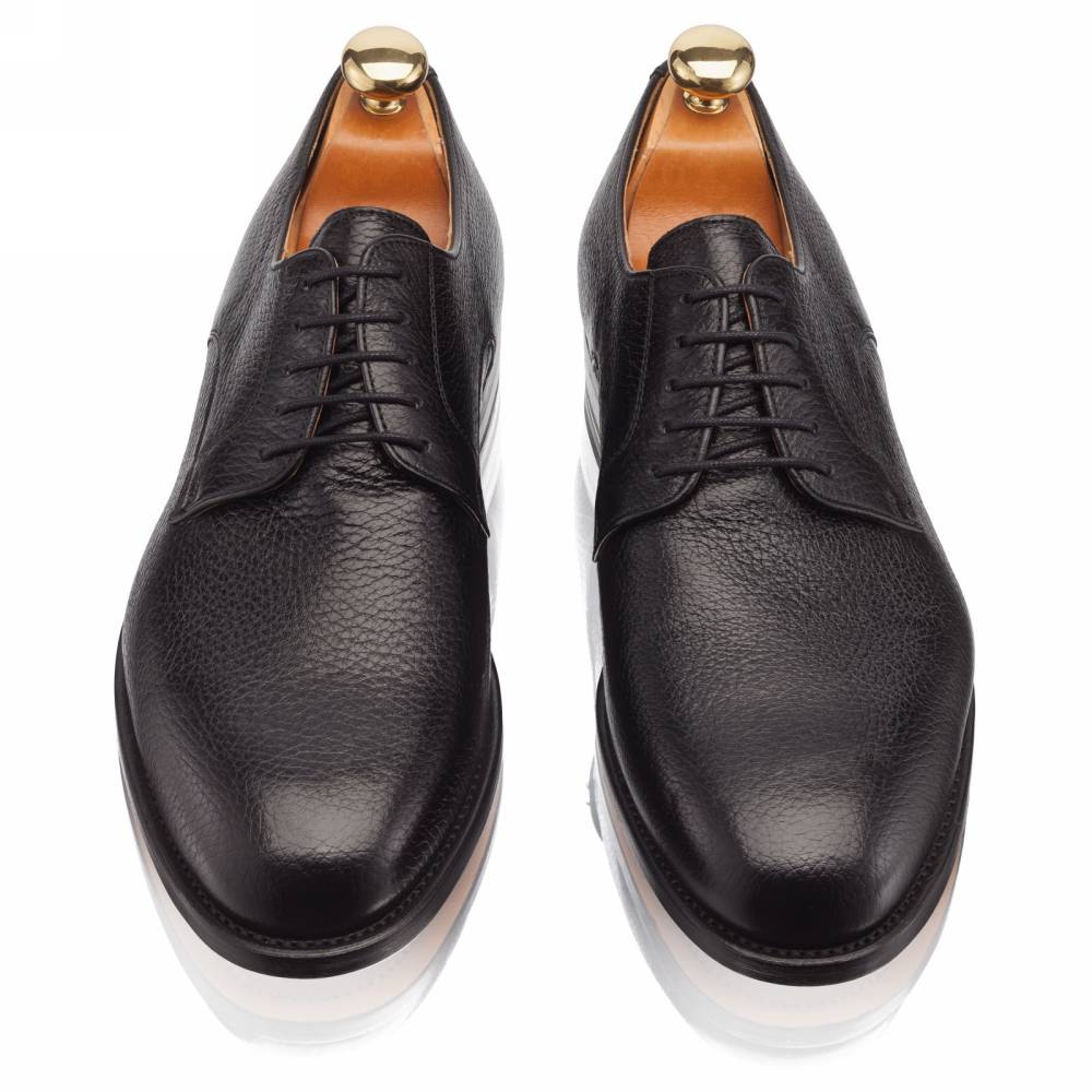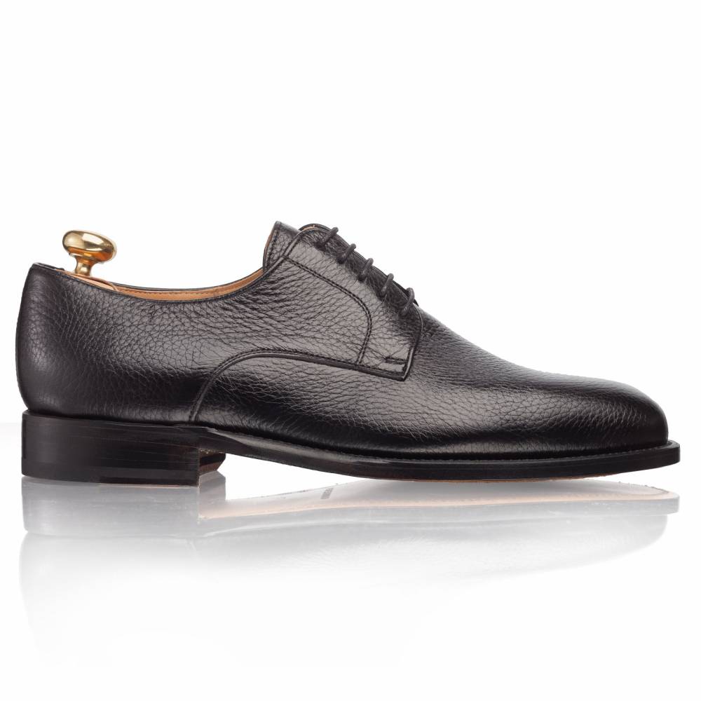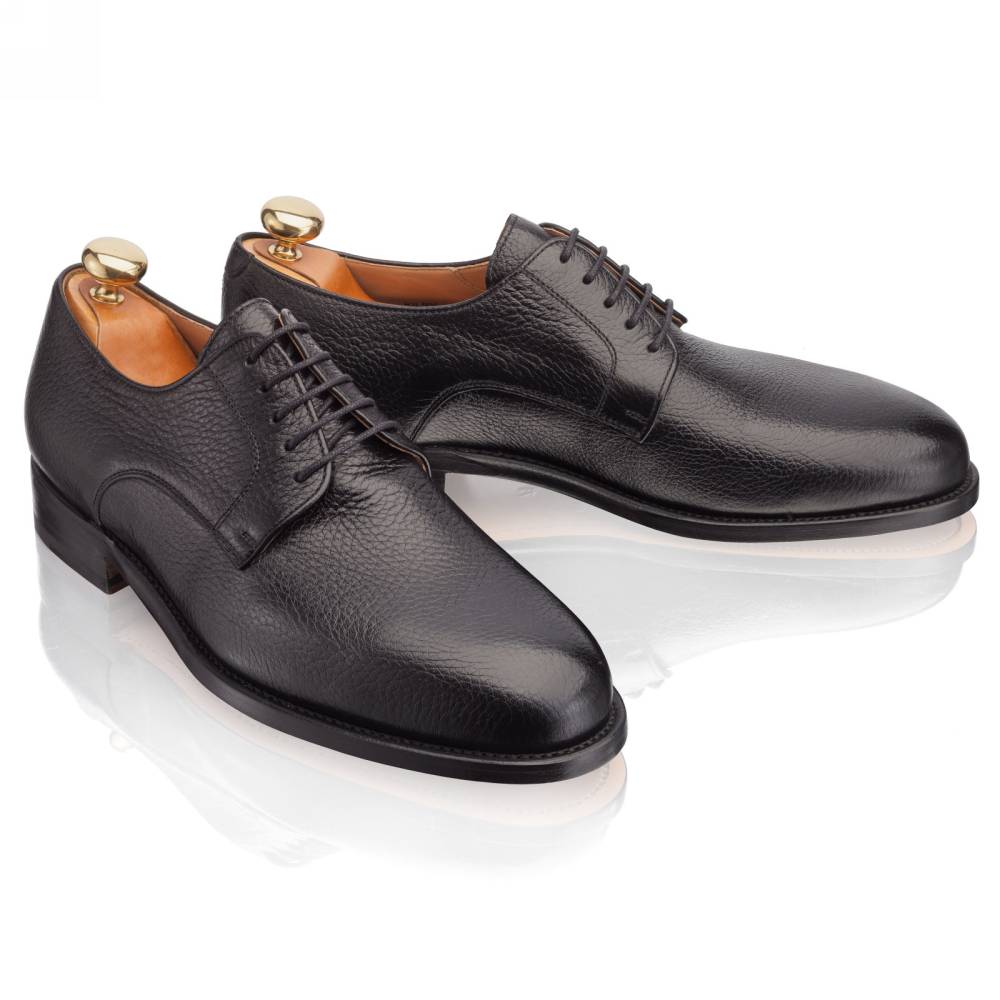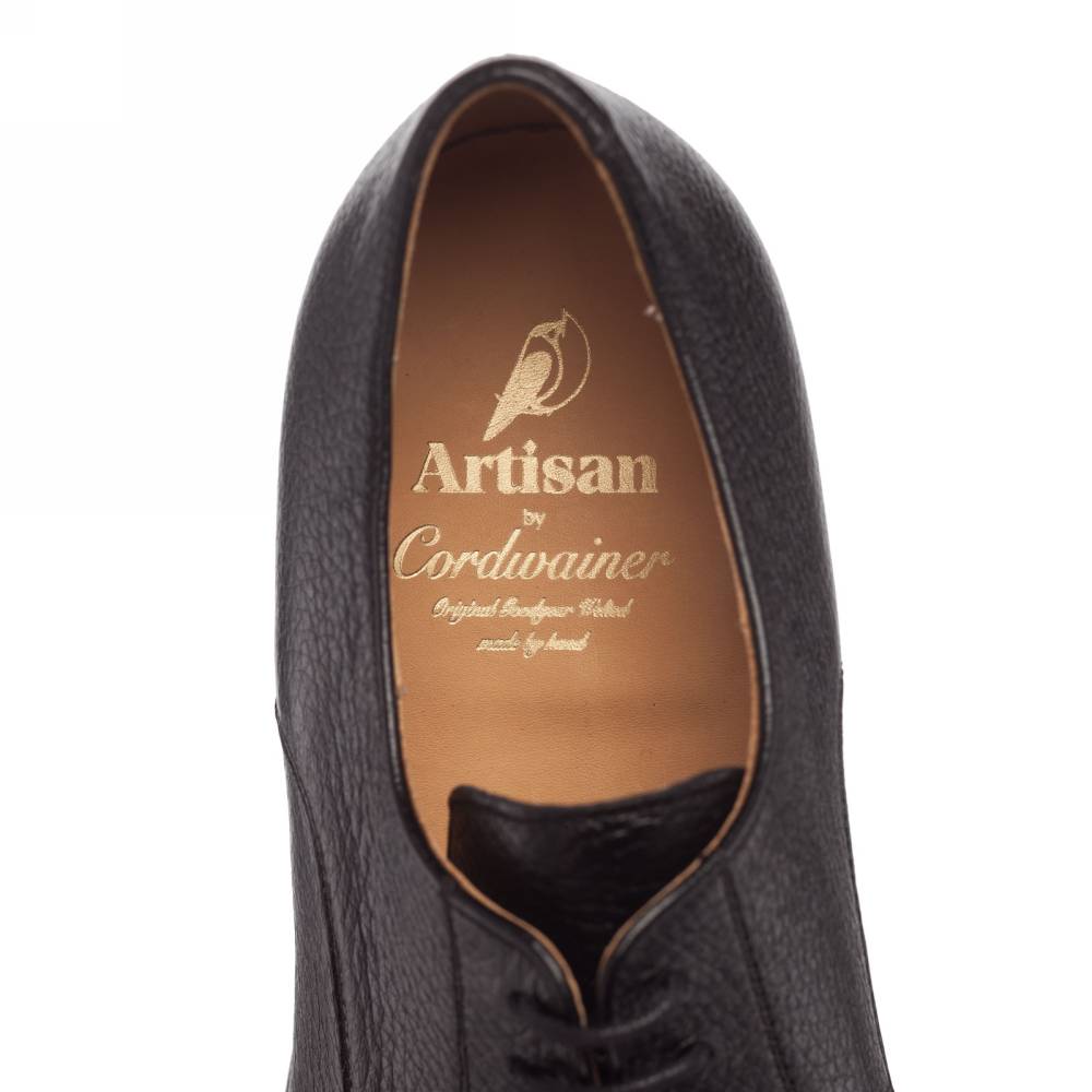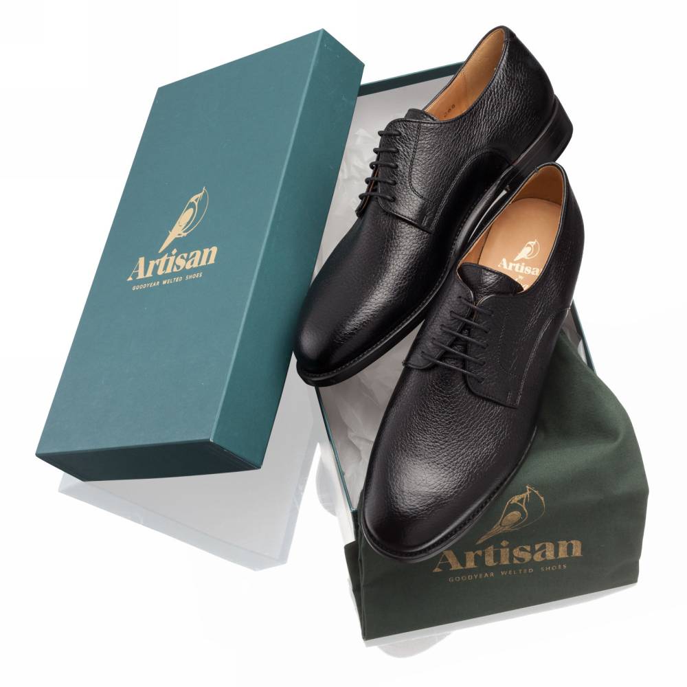Лаконичные чёрные дерби испанской фабрики Artisan на кожаной подошве. Модель изготовлена по специальному заказу на испанской фабрике Cordwainer в городе Альманса – центре обувной промышленности Испании. Дизайн модели удачно балансирует между строгостью и умеренным casual стилем. Верх сшит из мягкой приятной на ощупь оленьей кожи с зернистой фактурой. На данную пару установлена высококачественная кожаная подошва от знаменитой немецкой мануфактуры Joh. Rendenbach. Конструкция Goodyear Welted.