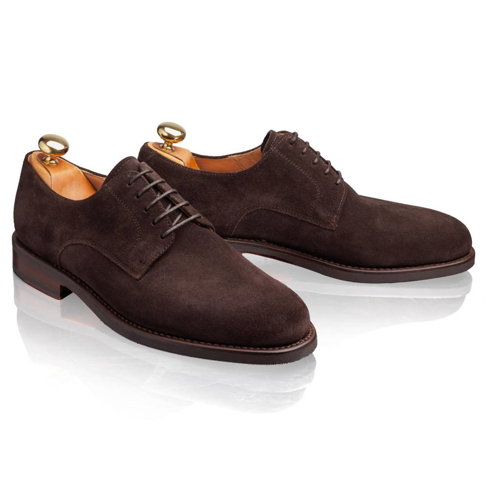 Лаконичные повседневные дерби Kilby бренда Artisan выполнены из ворсистой приятной на ощупь замши тёмно-коричневого цвета с тонкой подкладкой из кожи растительного дубления. Модель изготовлена по специальному заказу на испанской фабрике Cordwainer в городе Альманса – центре обувной промышленности Испании. Область пятки с внутренней стороны с шероховатой поверхностью, чтобы стопа лучше фиксировалась при ходьбе. На данную пару установлена практичная комбинированная подошва из кожи и резины. Конструкция Goodyear Welted.